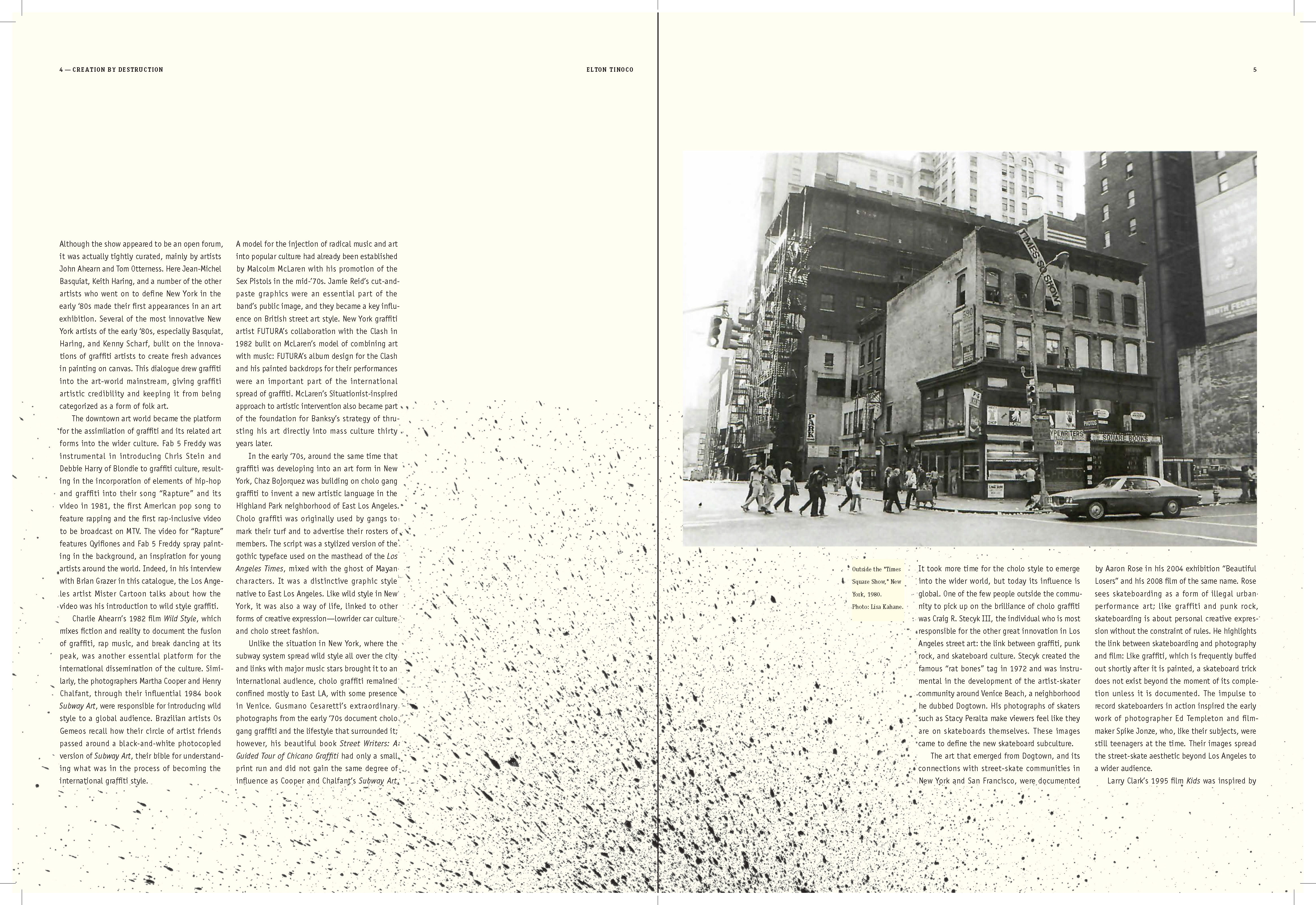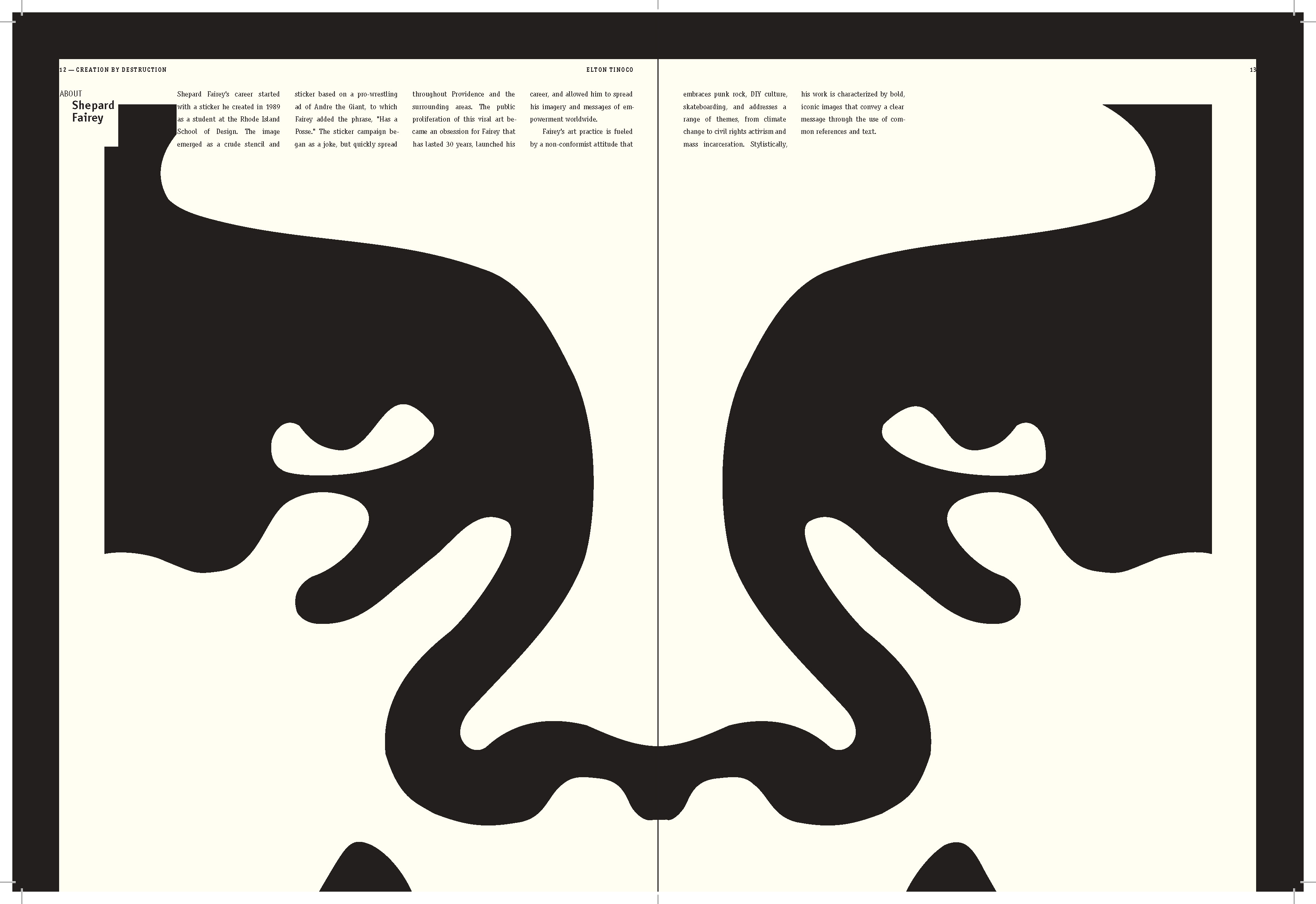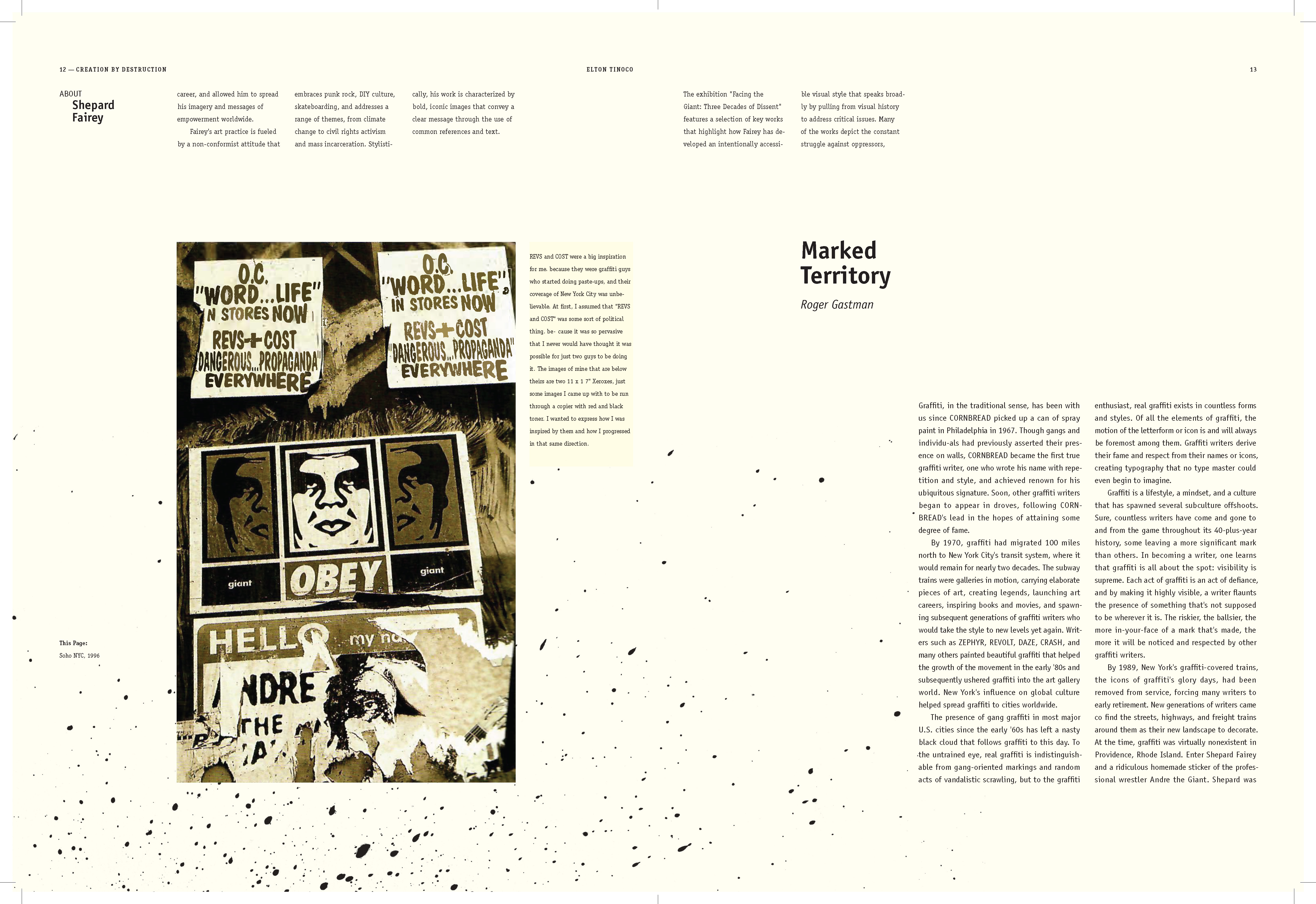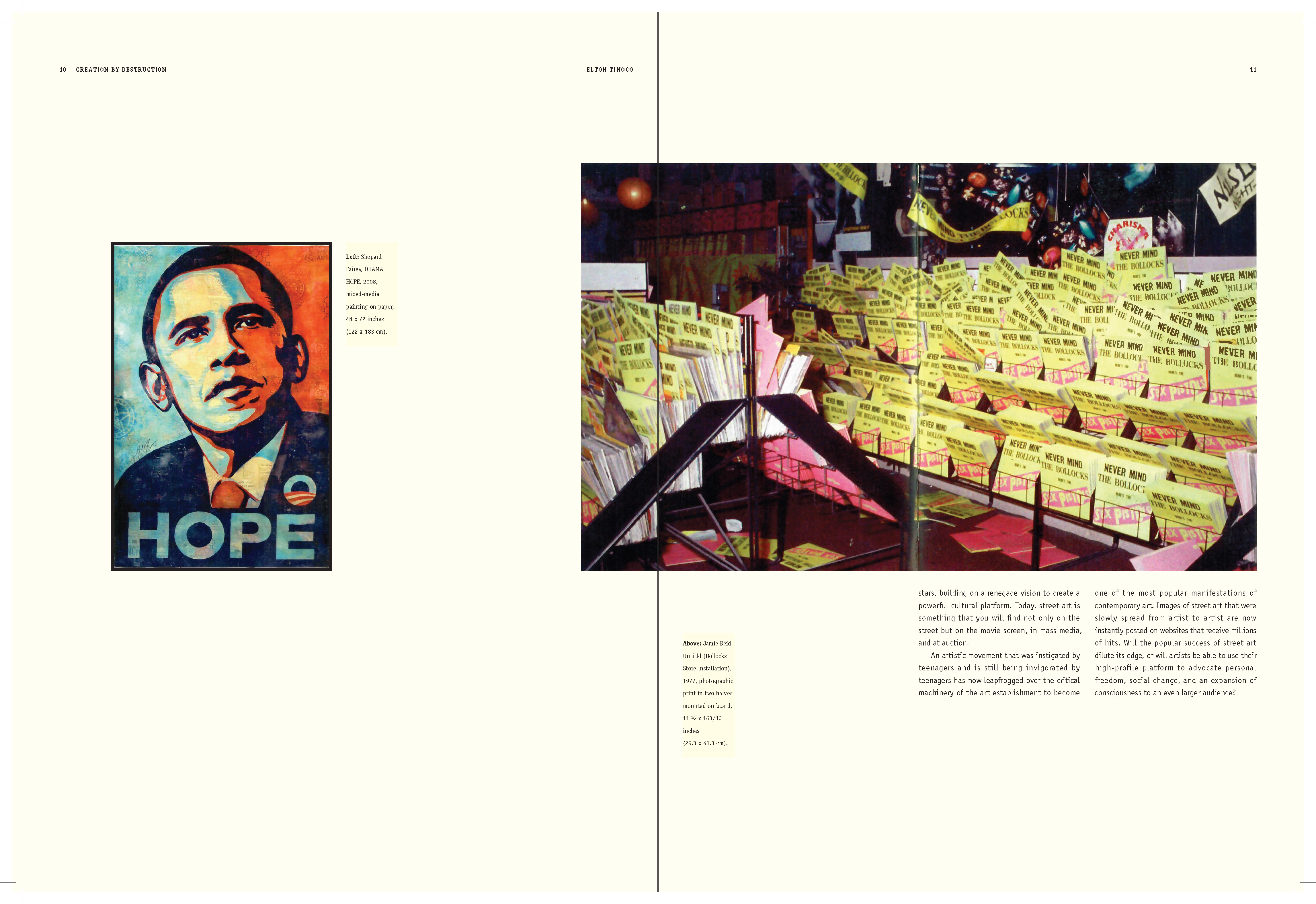 I learned to explore multiple styles in narrative for book design; How to use the ArtCenter library for references and resources (i.e. essays); How to use Acrobat to convert scans into live text. How to apply textures where needed; How to treat micro and macro copy within the books paragraph and character style sheets. How to design spreads for artist sections (plates) and essay sections.