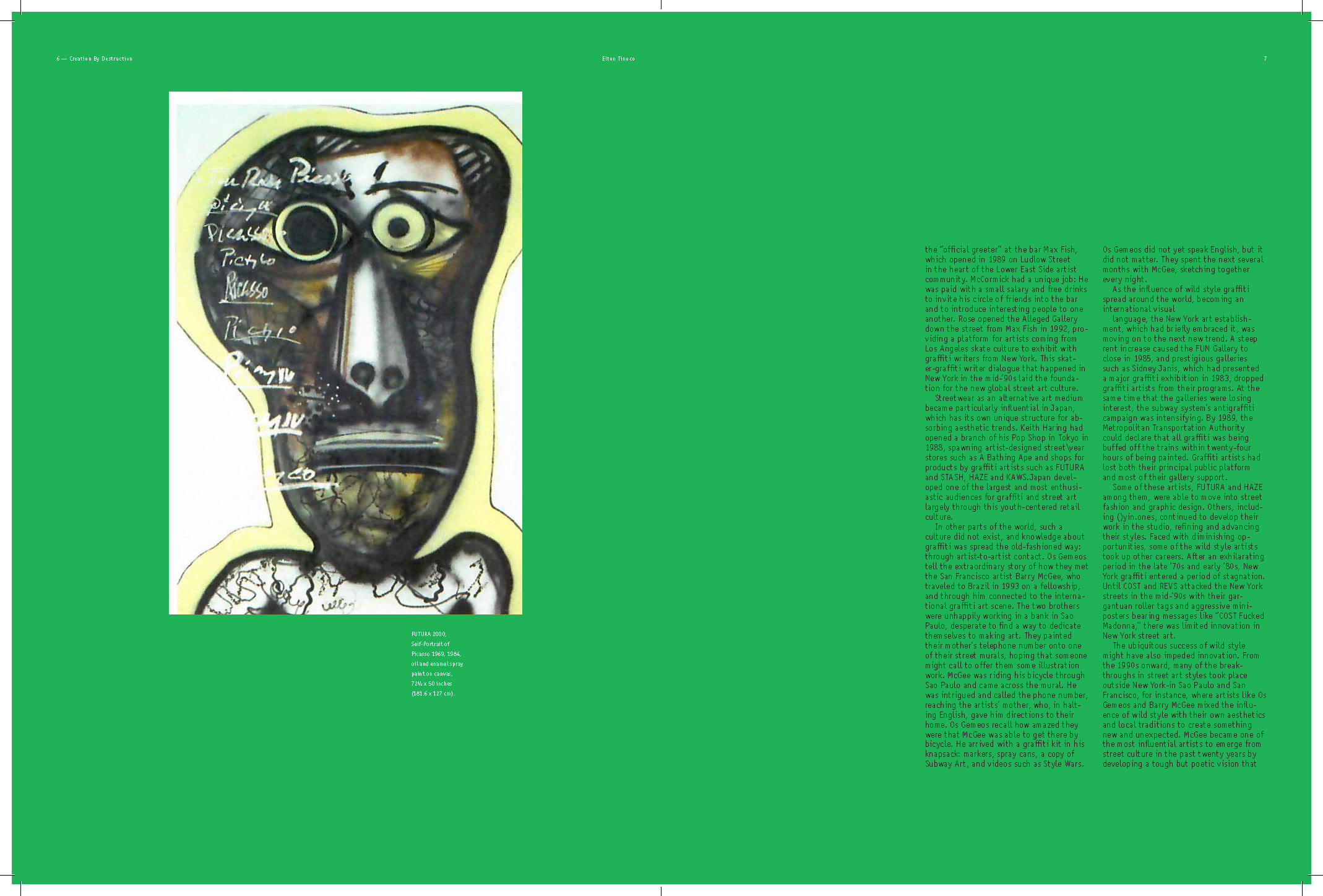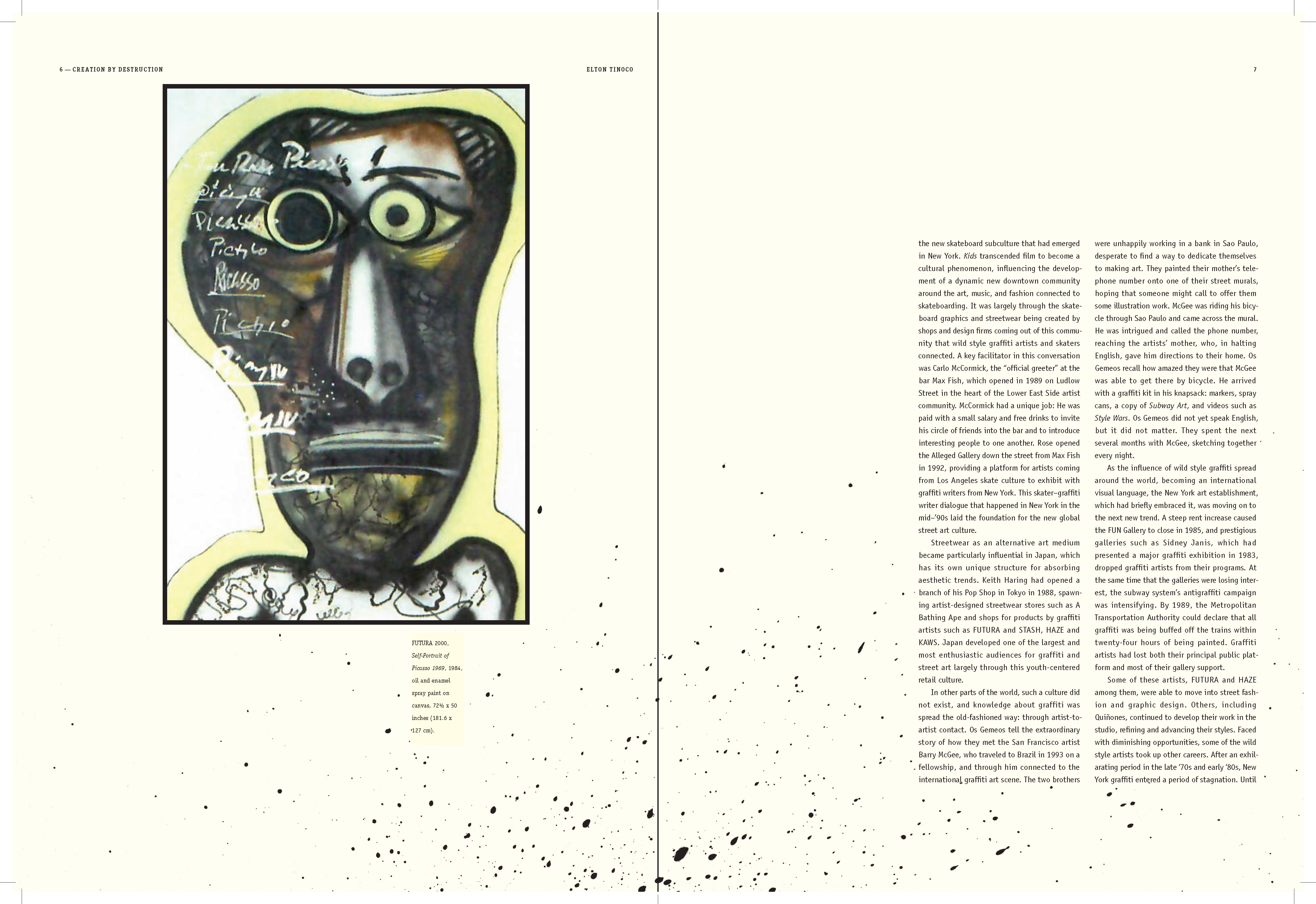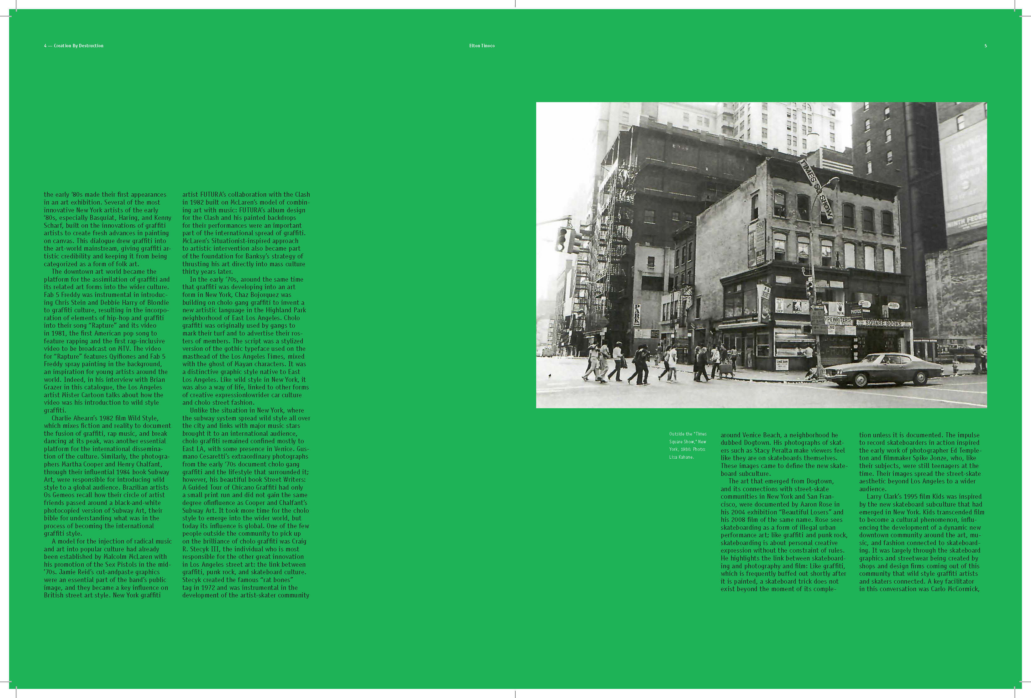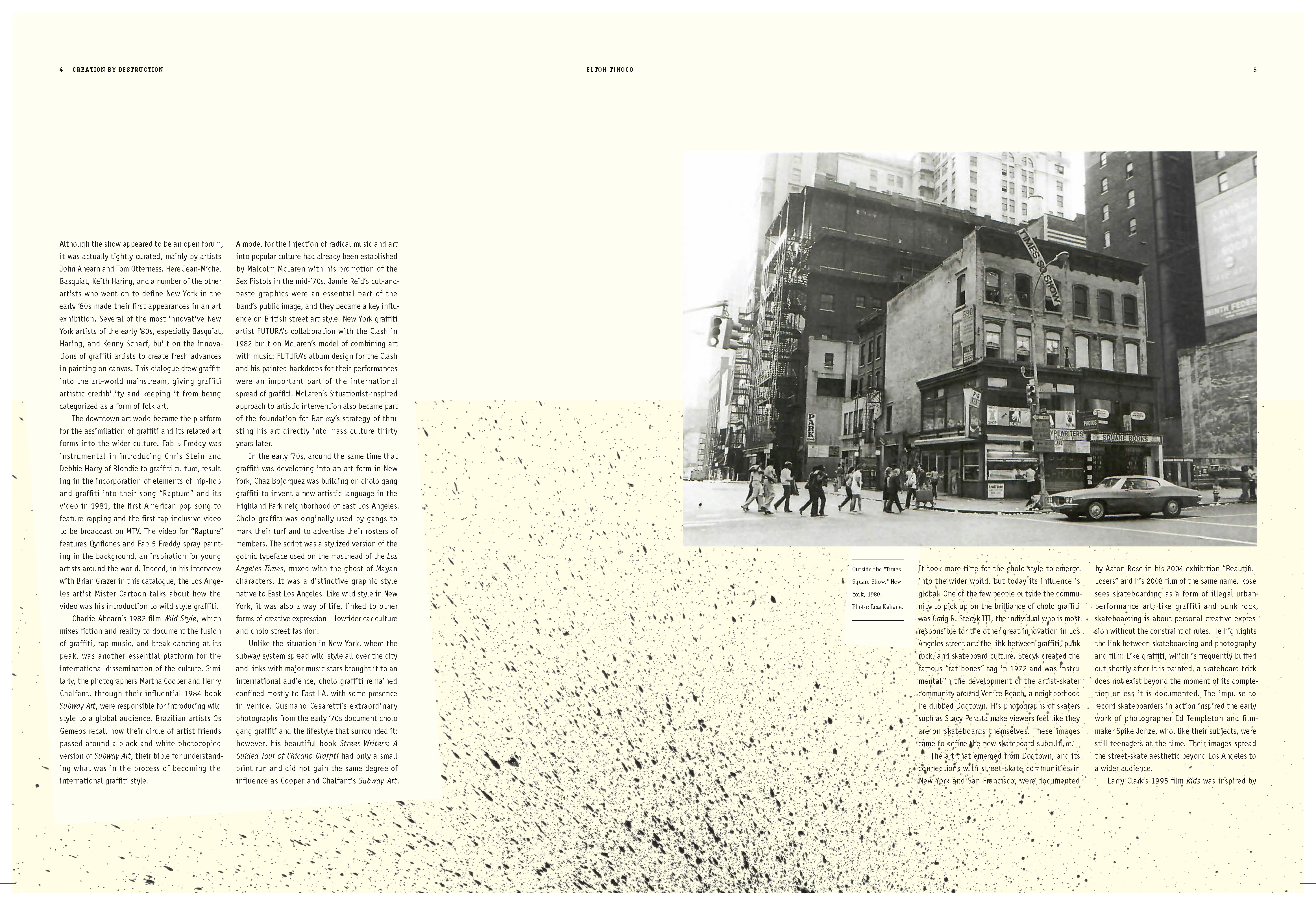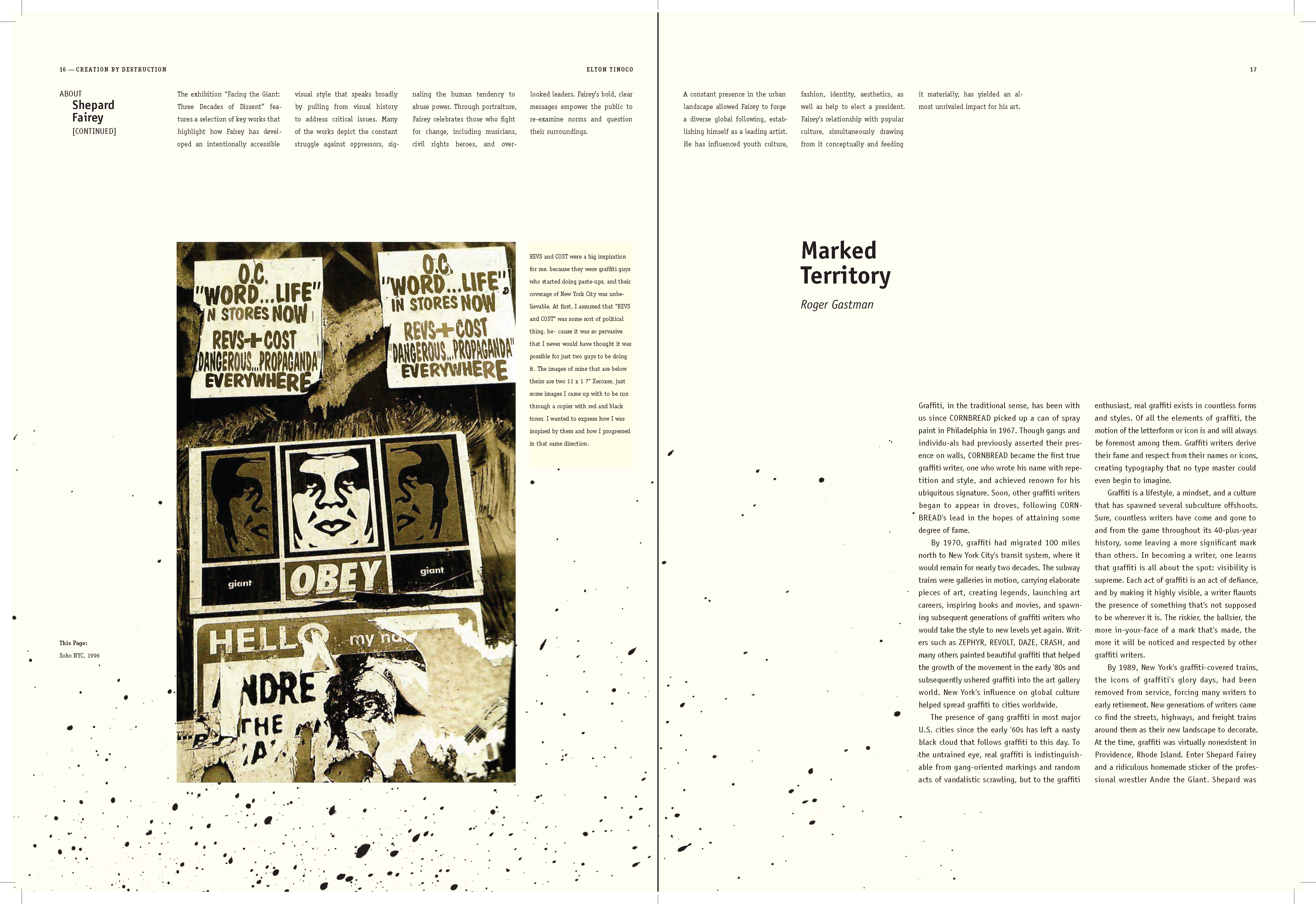 I learned to explore multiple styles in narrative for book design; How to use the ArtCenter library for references and resources (i.e. essays); How to use Acrobat to convert scans into live text. How to apply textures where needed; How to treat micro and macro copy within the books paragraph and character style sheets. How to design spreads for artist sections (plates) and essay sections.