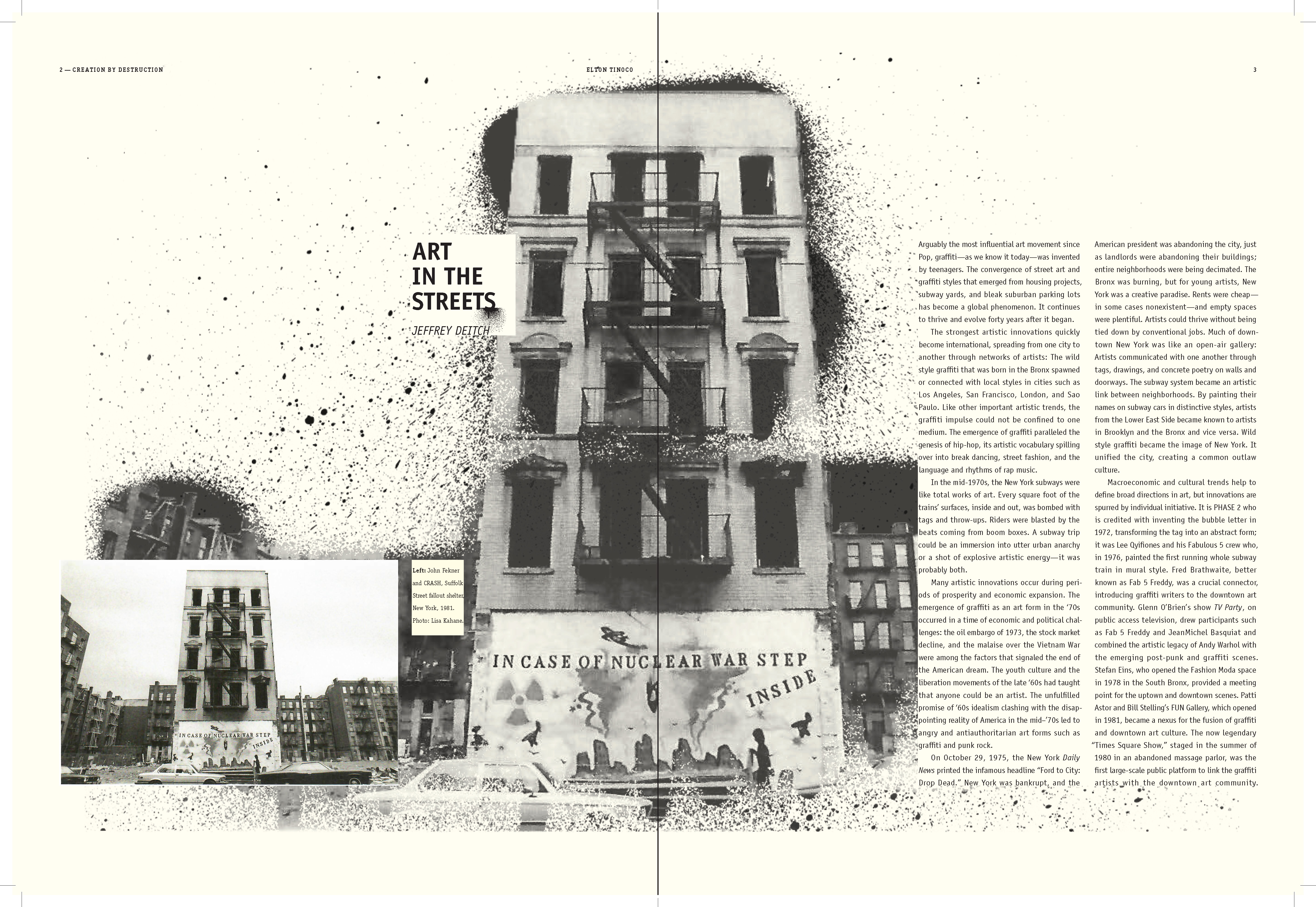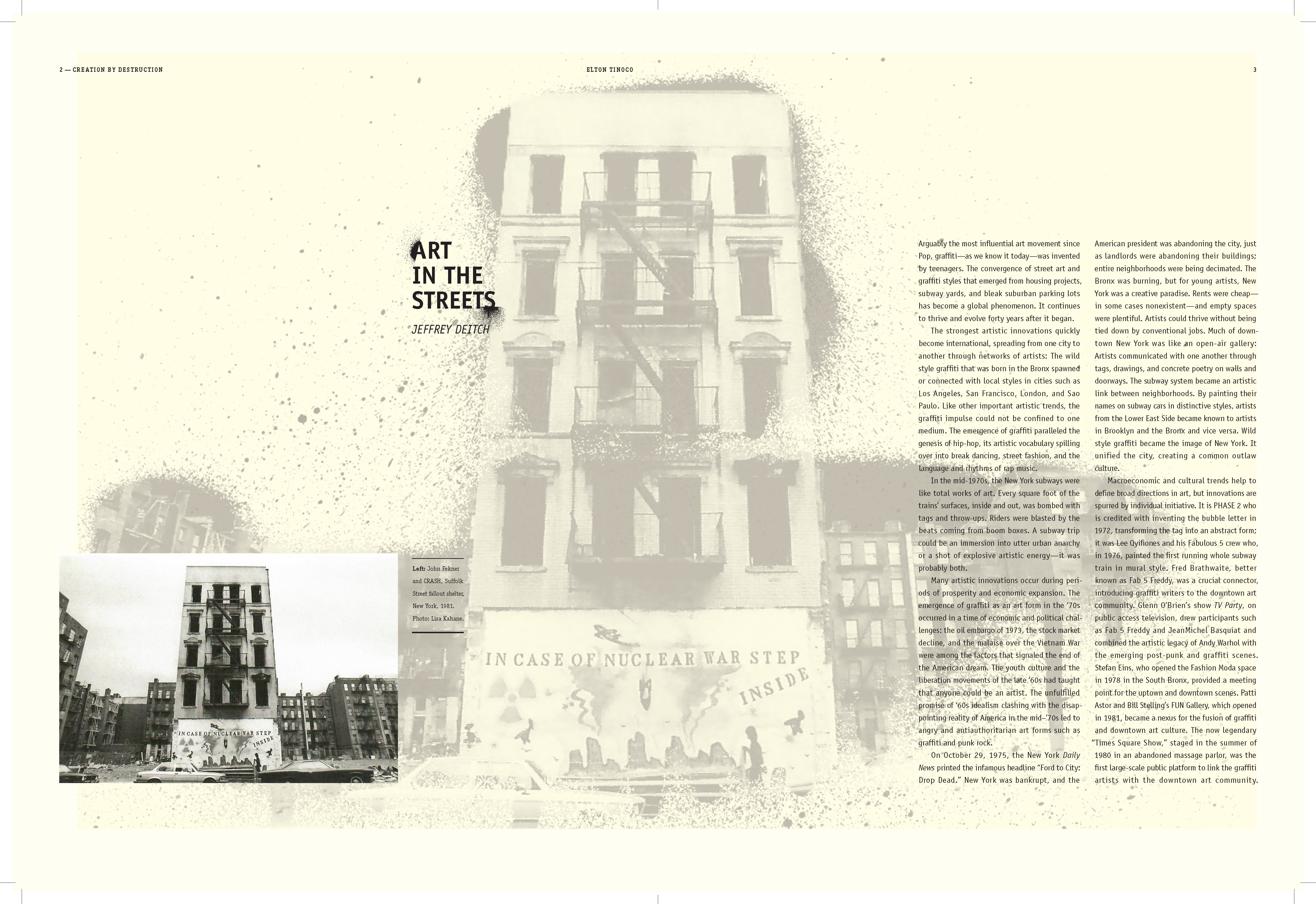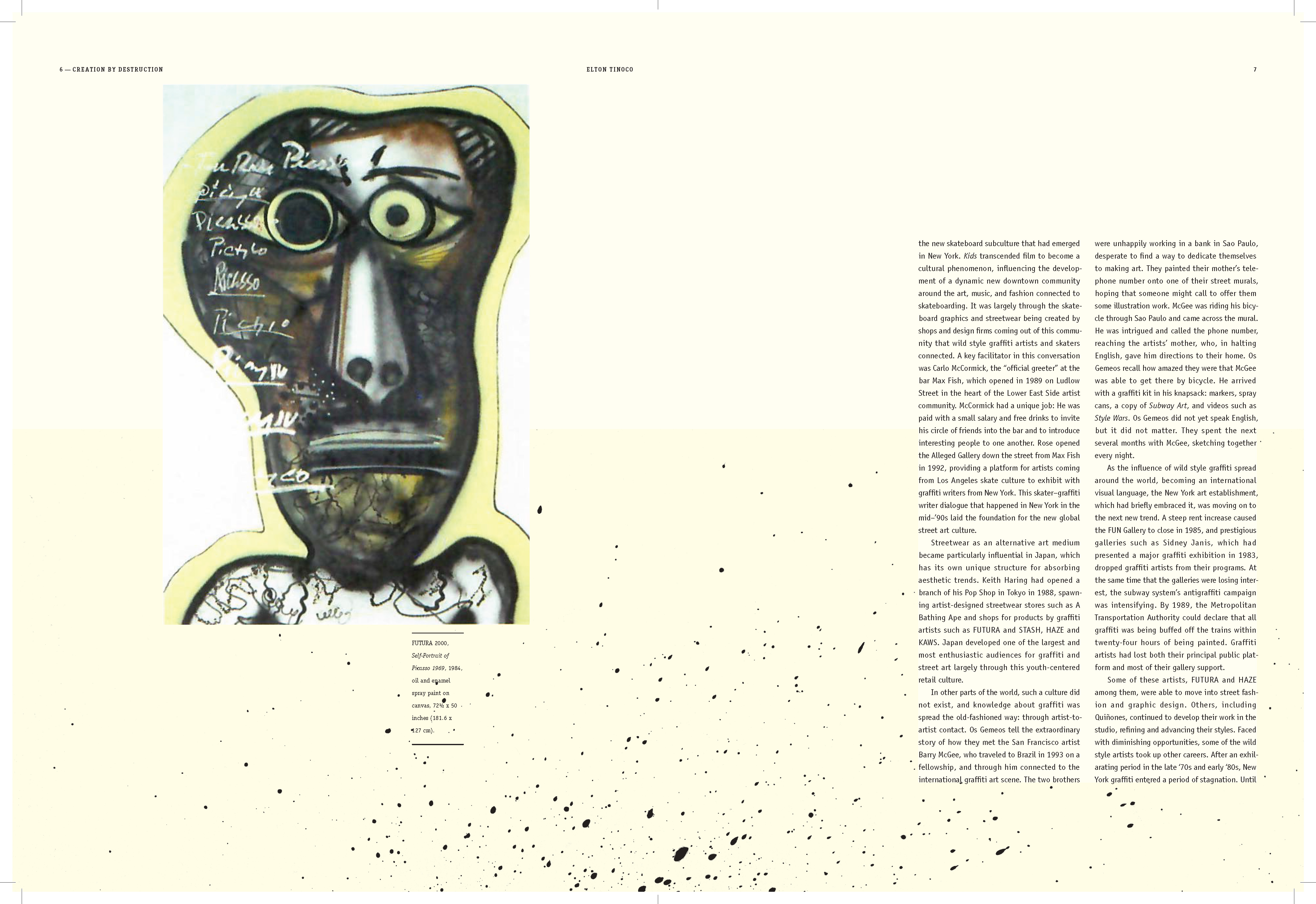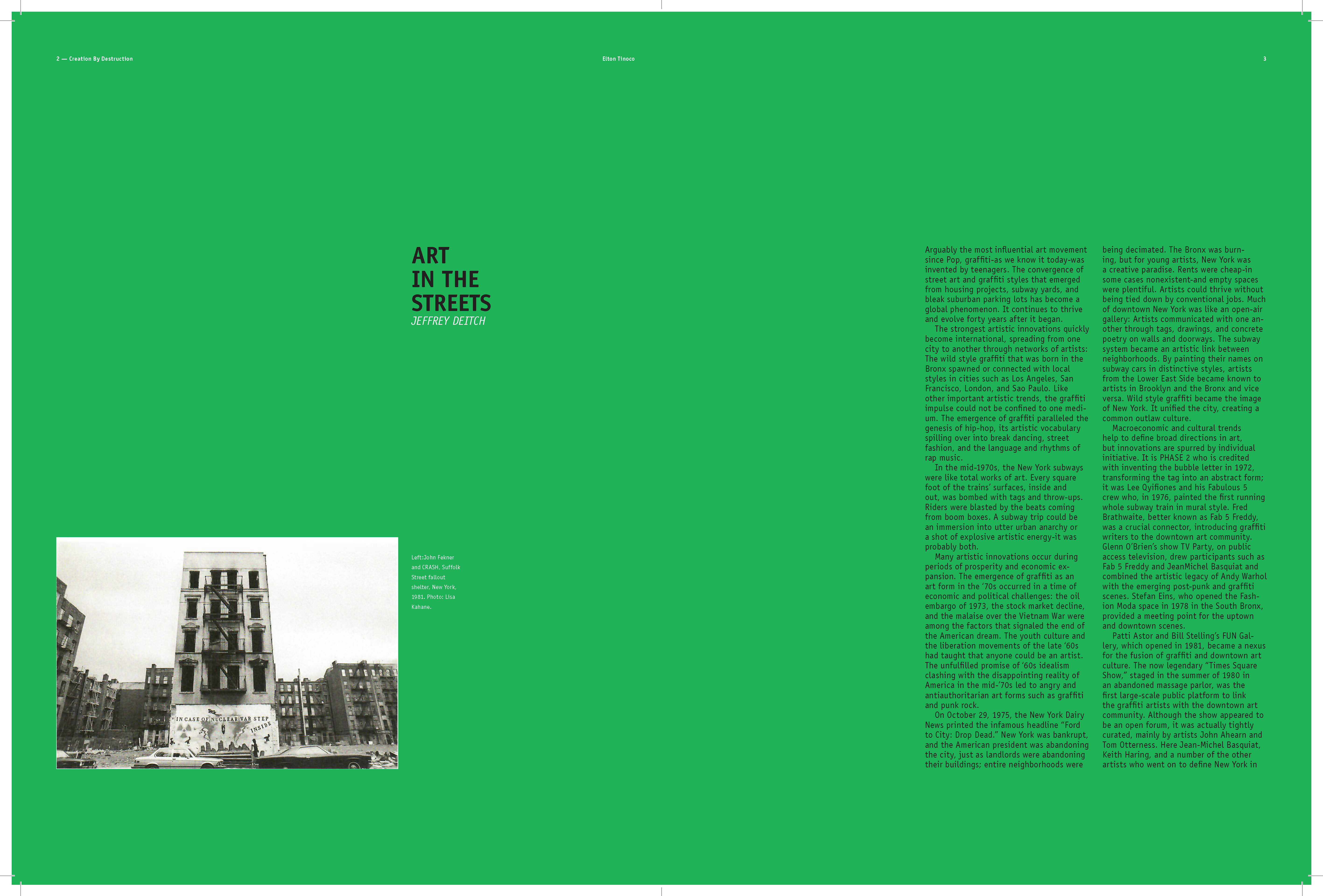 I learned to explore multiple styles in narrative for book design; How to use the ArtCenter library for references and resources (i.e. essays); How to use Acrobat to convert scans into live text. How to apply textures where needed; How to treat micro and macro copy within the books paragraph and character style sheets. How to design spreads for artist sections (plates) and essay sections.