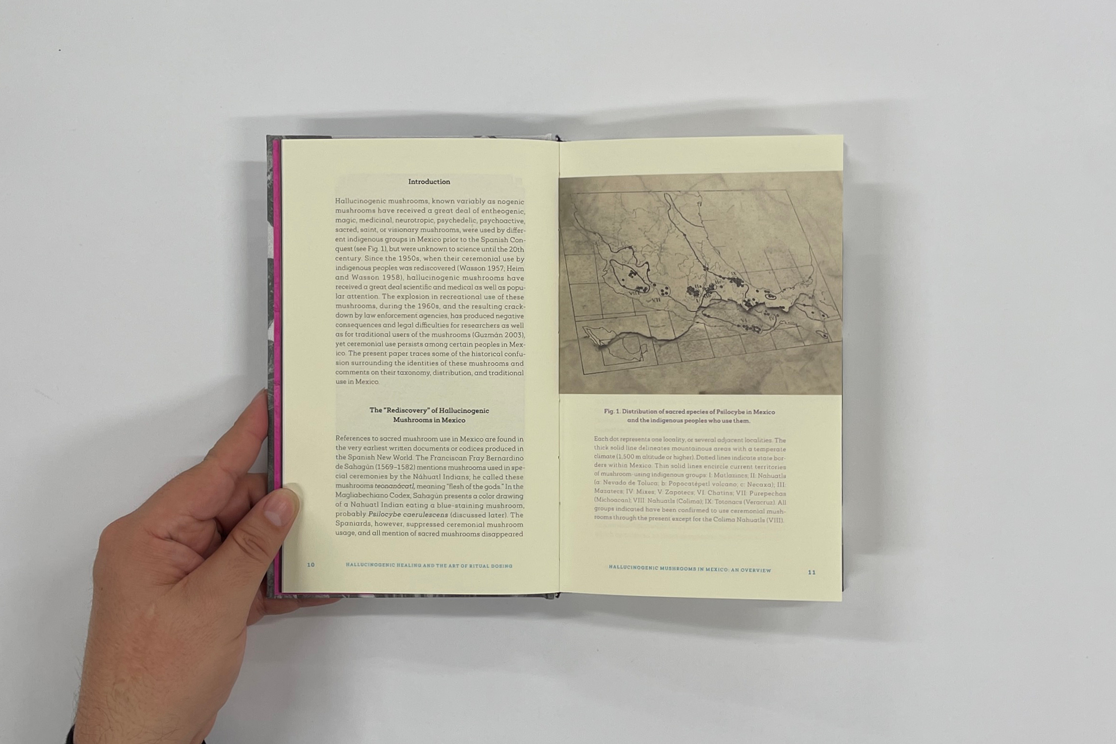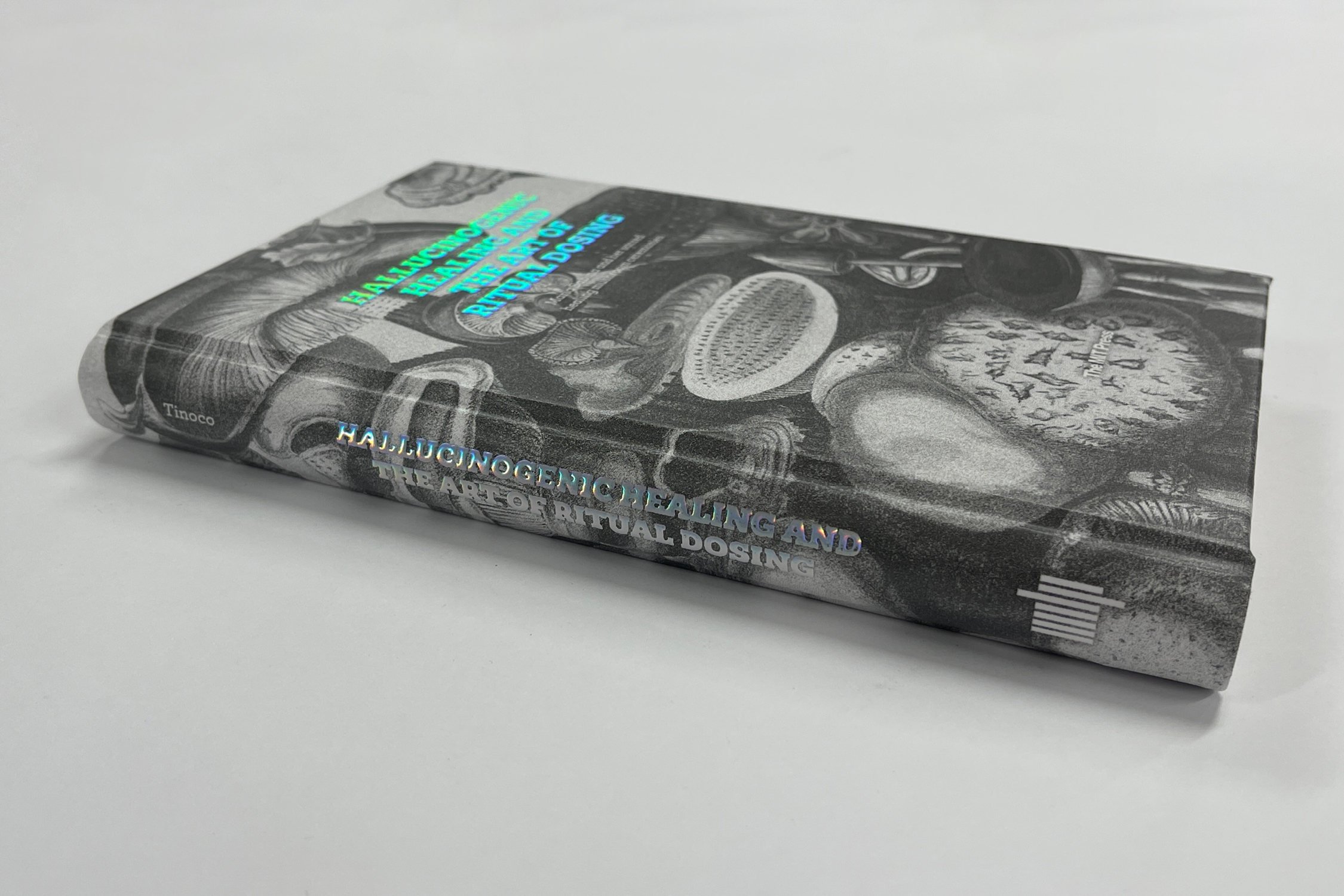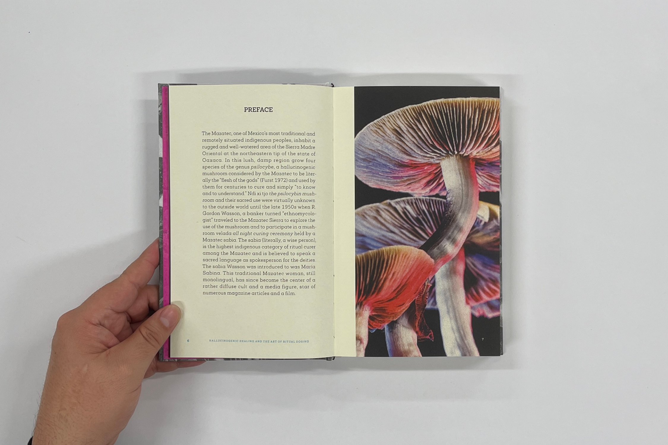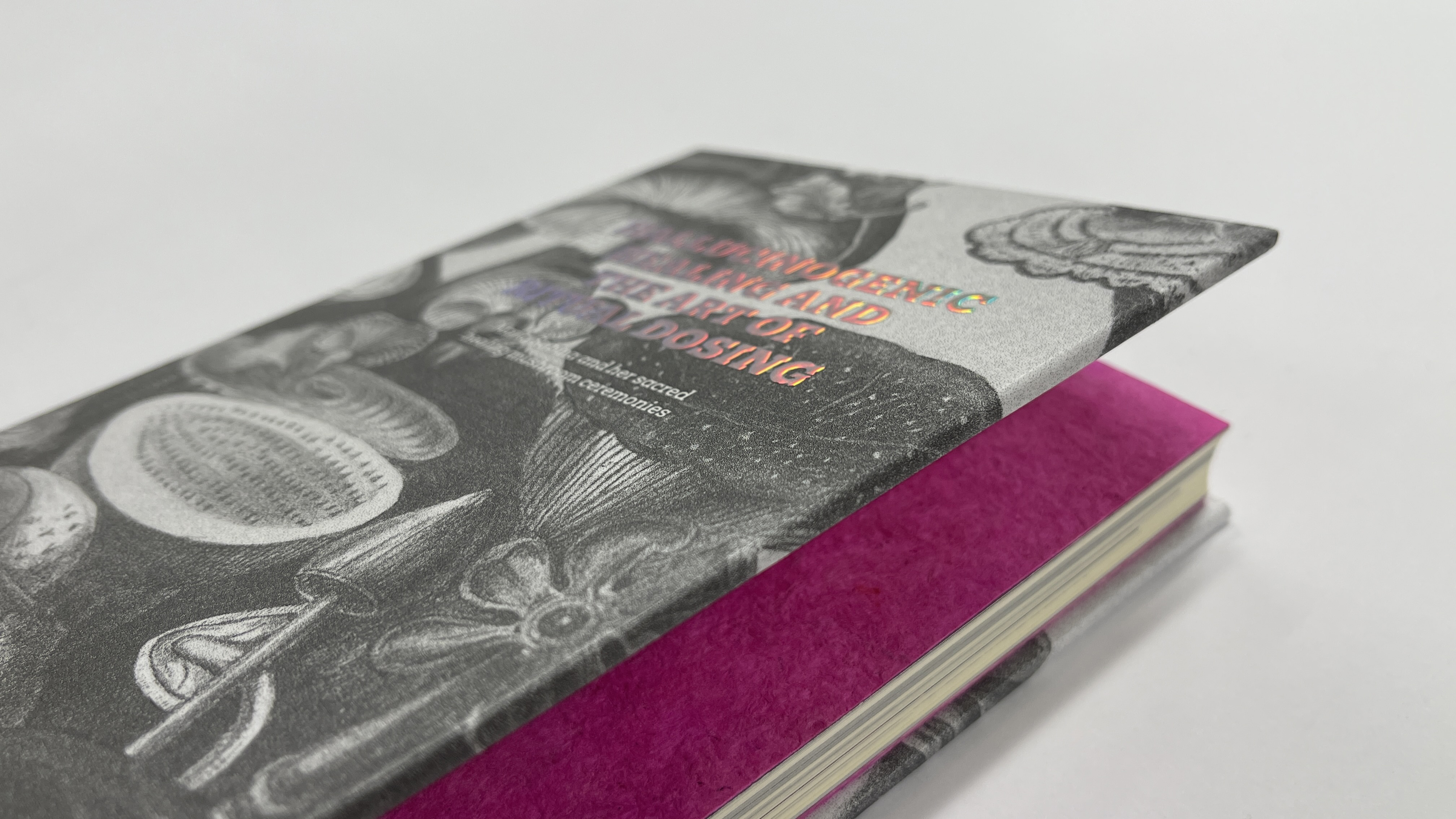 Hallucinogenic Healing and The Art of Ritual Dosing, is a book about the social impact of hallucinogenic mushrooms. Through curated content, the book academically focuses on Mesoamerican usage of psilocybin mushrooms and their widespread discovery. The book finish size is 5”x8”; Cover is printed on Uncoated Text Lynx #100 Text with scratch-proof lamination and raised digital foil (holographic); Pages are printed on Mohawk Via Vellum I-Tone Cream #80 Text.