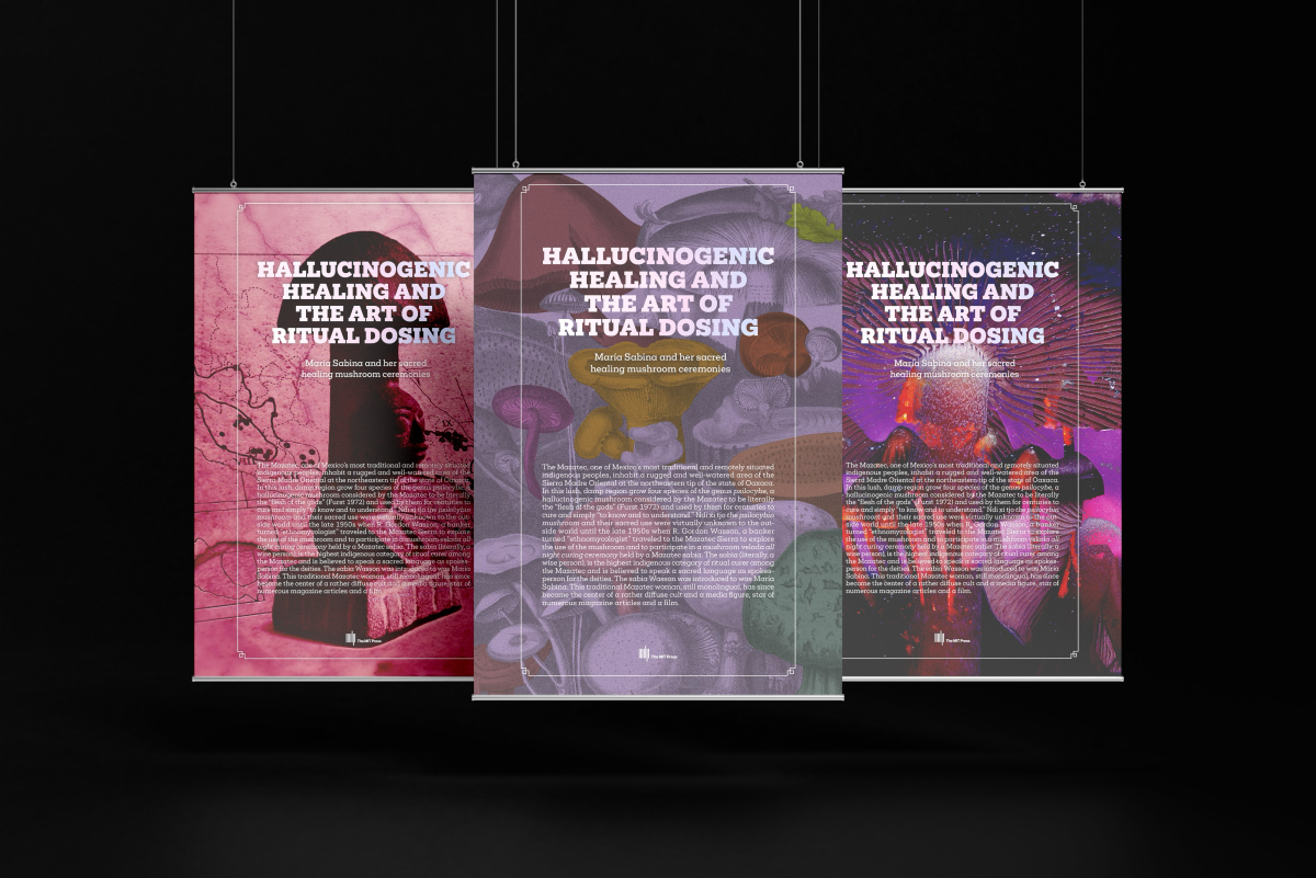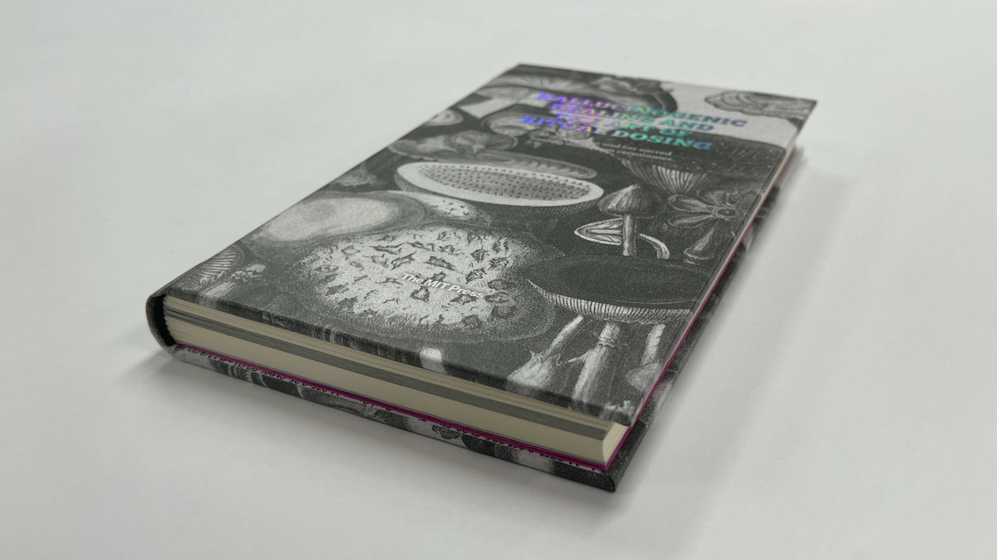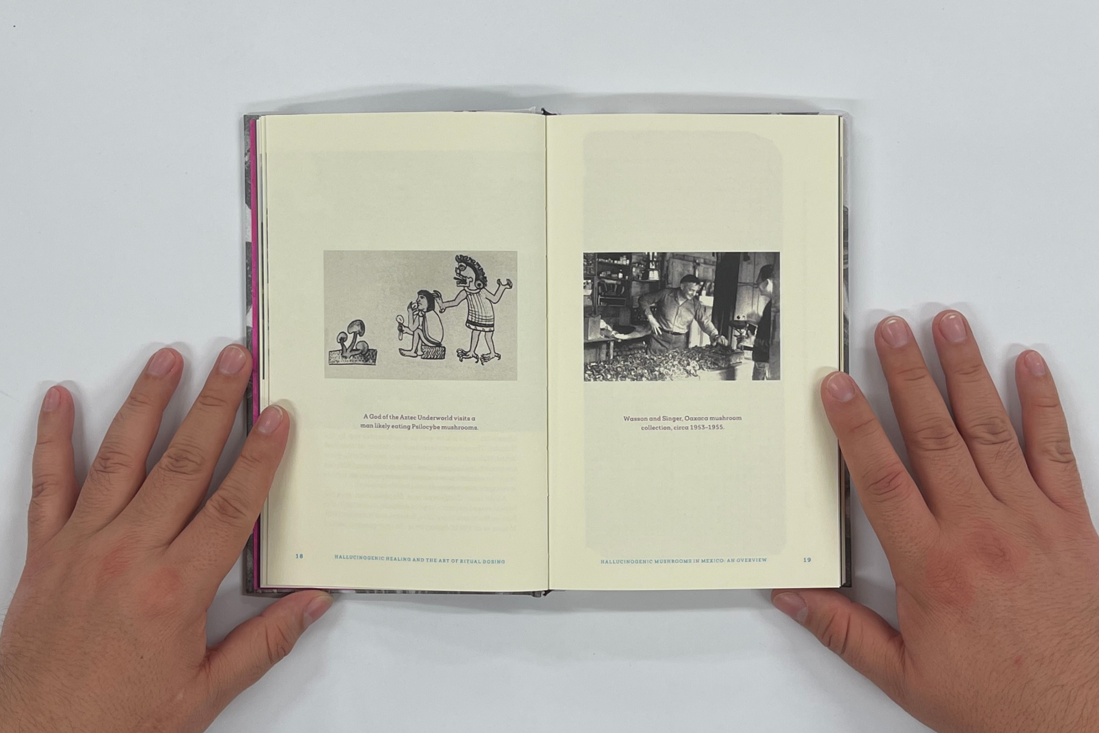 Hallucinogenic Healing and The Art of Ritual Dosing, is a book about the social impact of hallucinogenic mushrooms. Through curated content, the book academically focuses on Mesoamerican usage of psilocybin mushrooms and their widespread discovery. The book finish size is 5”x8”; Cover is printed on Uncoated Text Lynx #100 Text with scratch-proof lamination and raised digital foil (holographic); Pages are printed on Mohawk Via Vellum I-Tone Cream #80 Text.