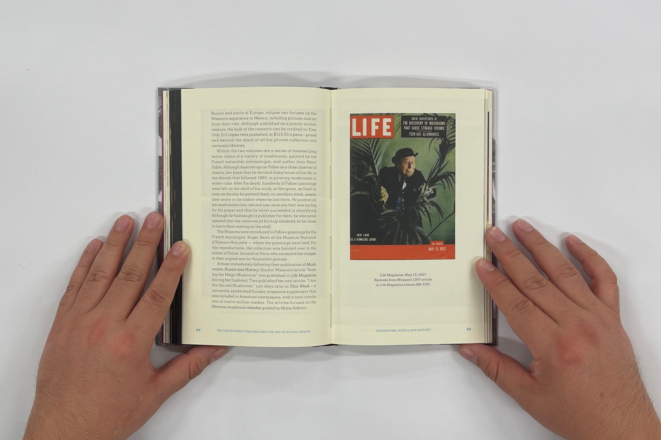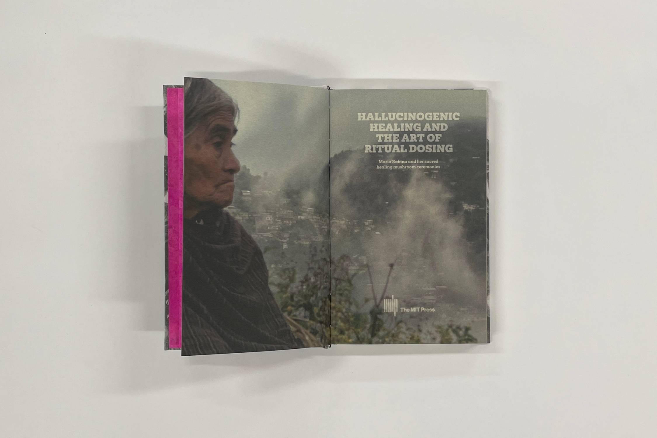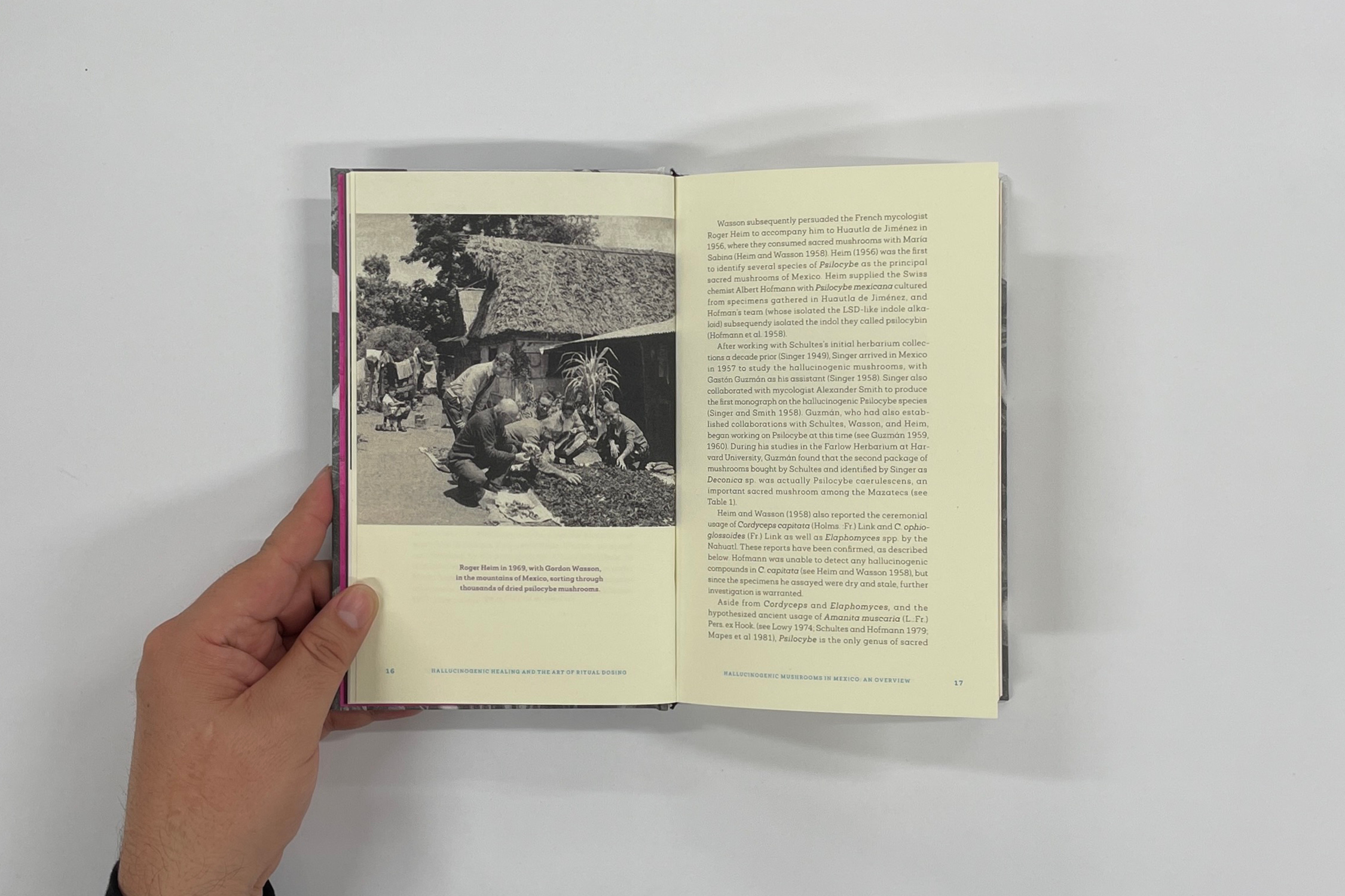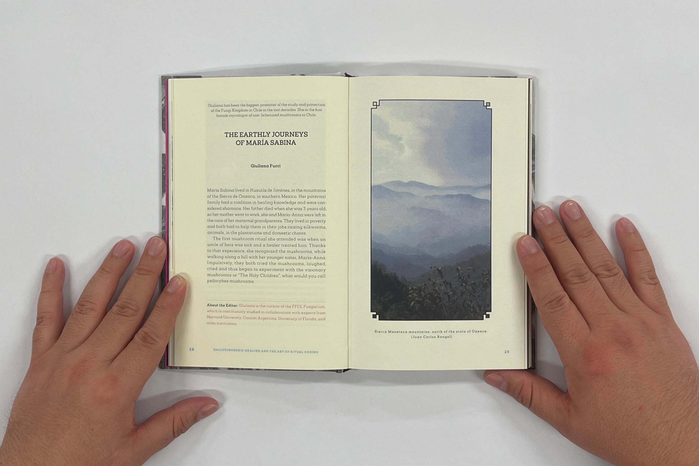 Hallucinogenic Healing and The Art of Ritual Dosing, is a book about the social impact of hallucinogenic mushrooms. Through curated content, the book academically focuses on Mesoamerican usage of psilocybin mushrooms and their widespread discovery. The book finish size is 5”x8”; Cover is printed on Uncoated Text Lynx #100 Text with scratch-proof lamination and raised digital foil (holographic); Pages are printed on Mohawk Via Vellum I-Tone Cream #80 Text.
