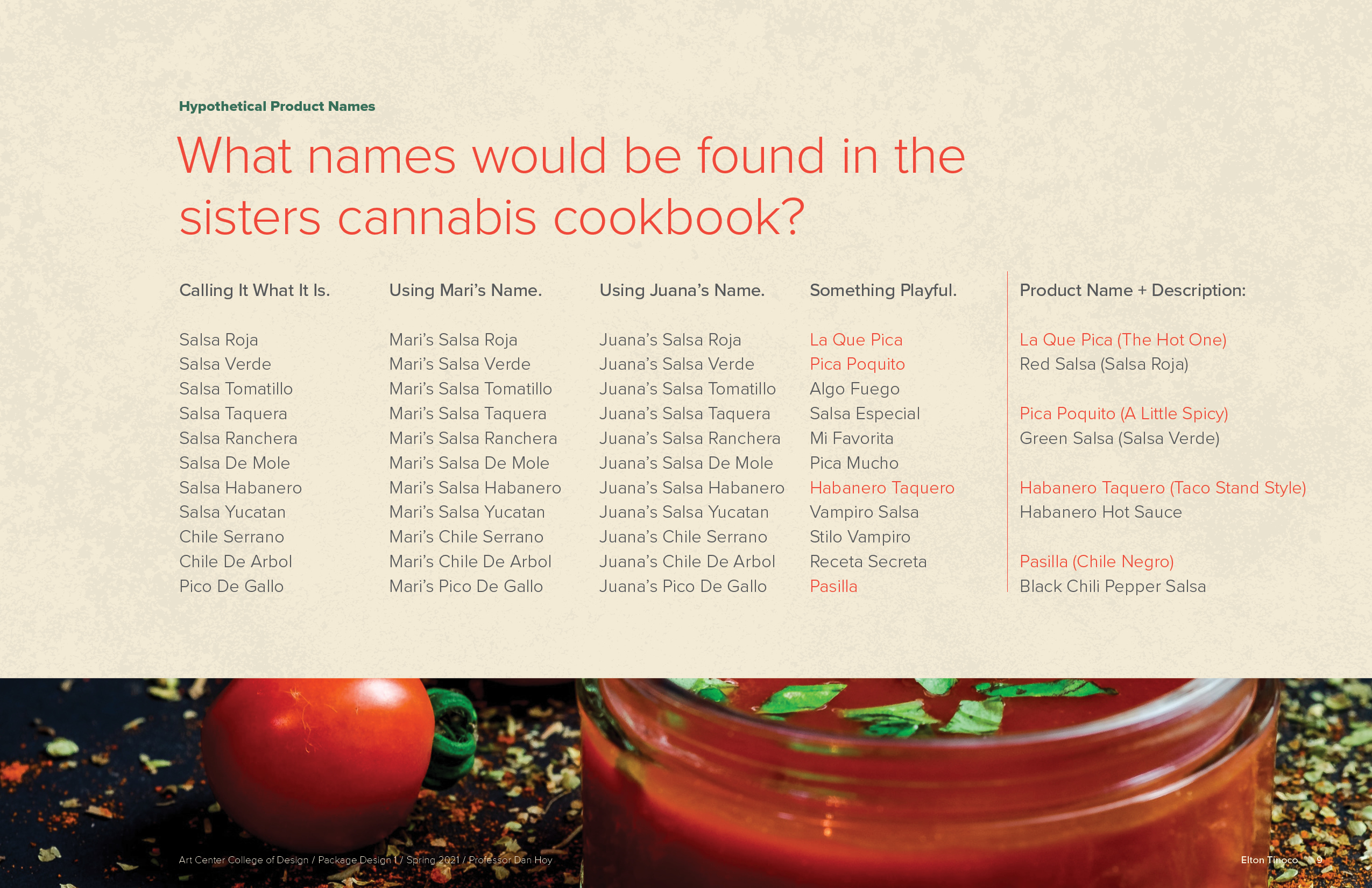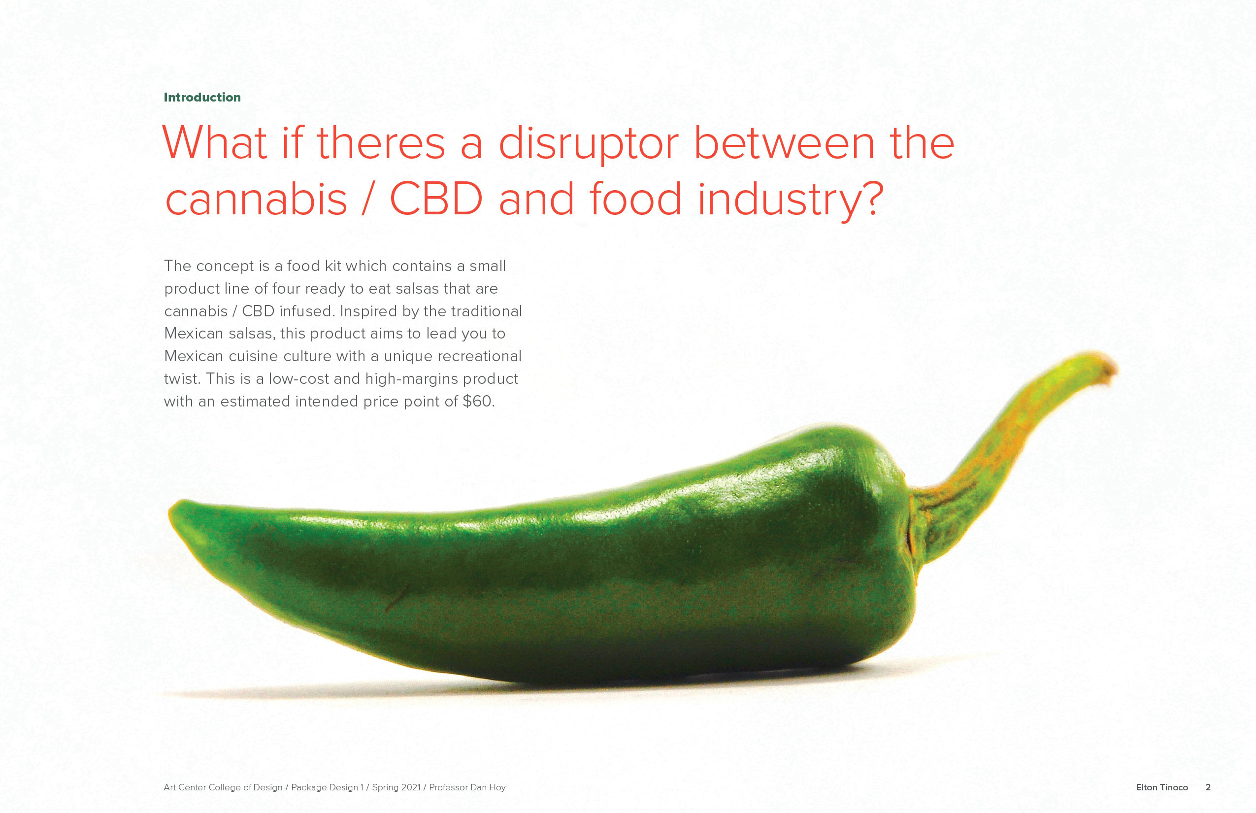 The concept is a food kit which contains a small product line of four ready to eat salsas that are cannabis infused. Inspired by the traditional Mexican salsas, this product aims to lead you to Mexican cuisine culture with a unique recreational twist. This is a low-cost and high-margins product with an estimated intended price point of $60.
