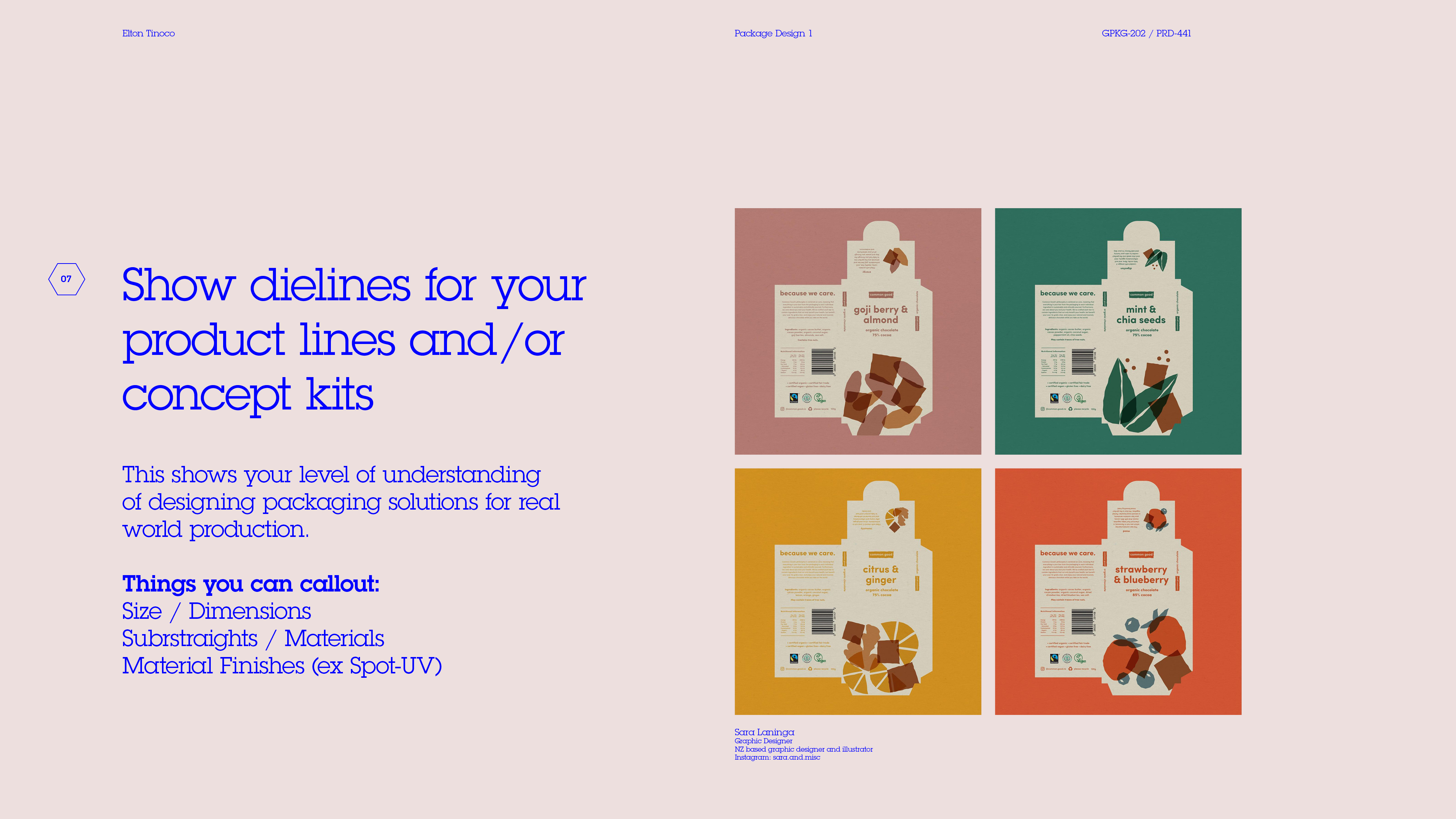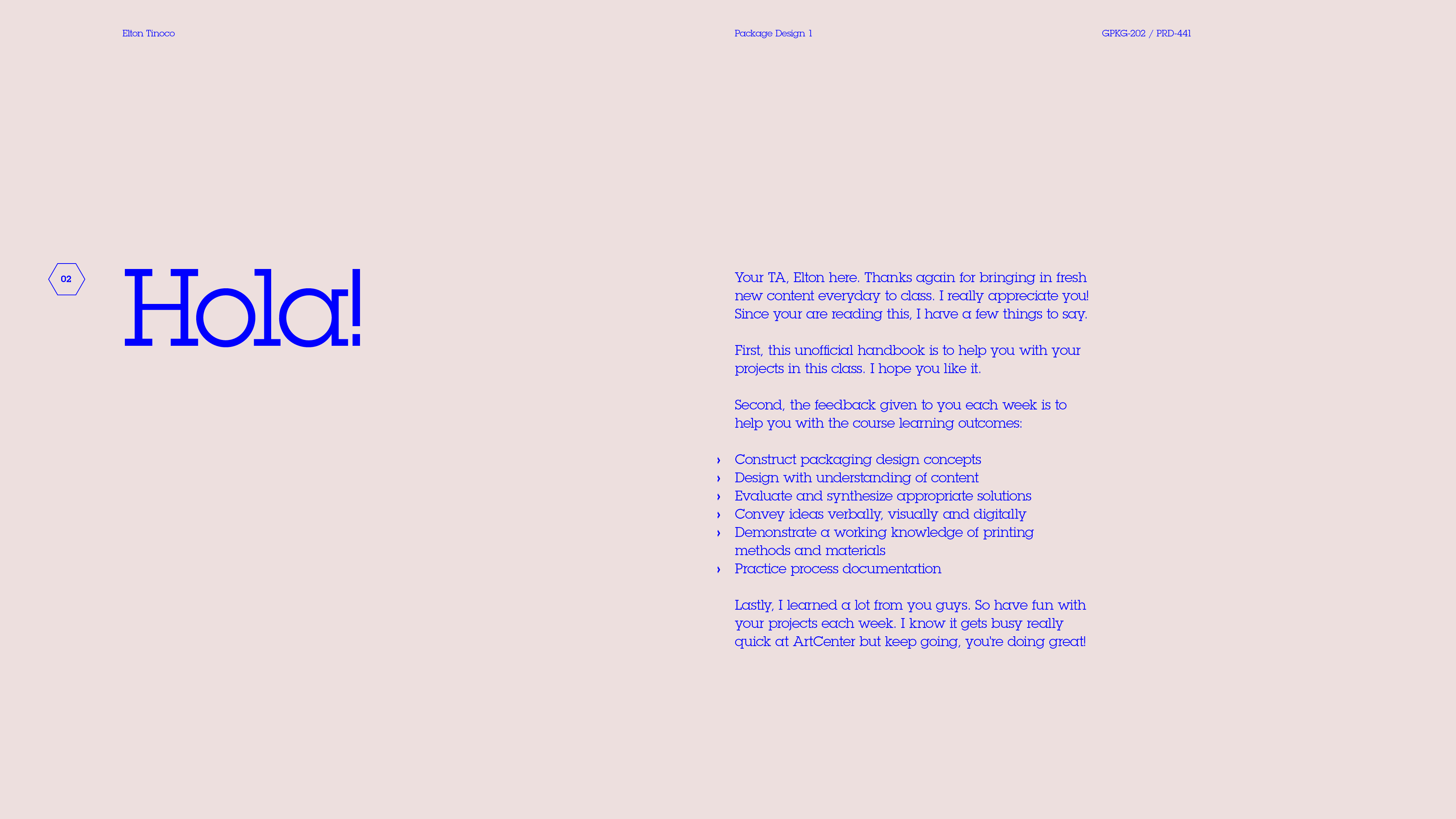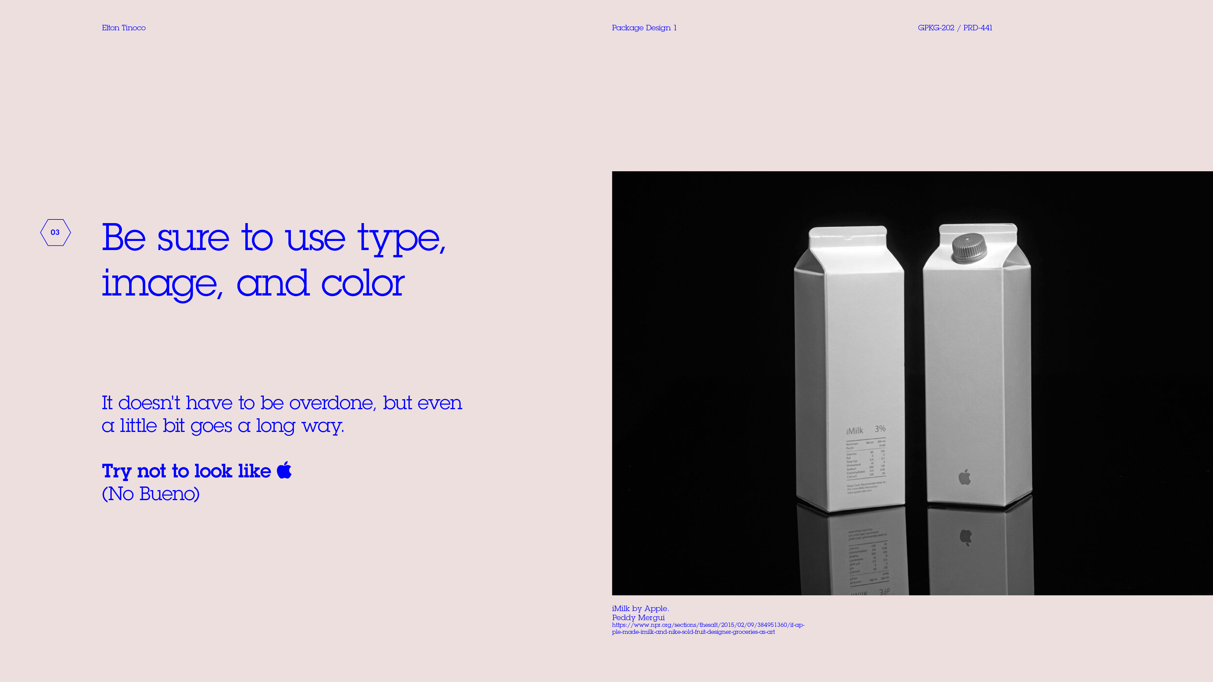 I'm currently a teaching assistant for package design 1 professor, Dan Hoy. This being my first term as a TA, I thought something I can do to be a better serve the class was to create a simple presentation deck of useful tips. As someone who is a visual learner myself, I thought this would be a helpful guide to the spectrum of student majors within the class. The idea was to show just enough but not too much, allowing for students in the class to still explore their design sensibilities.