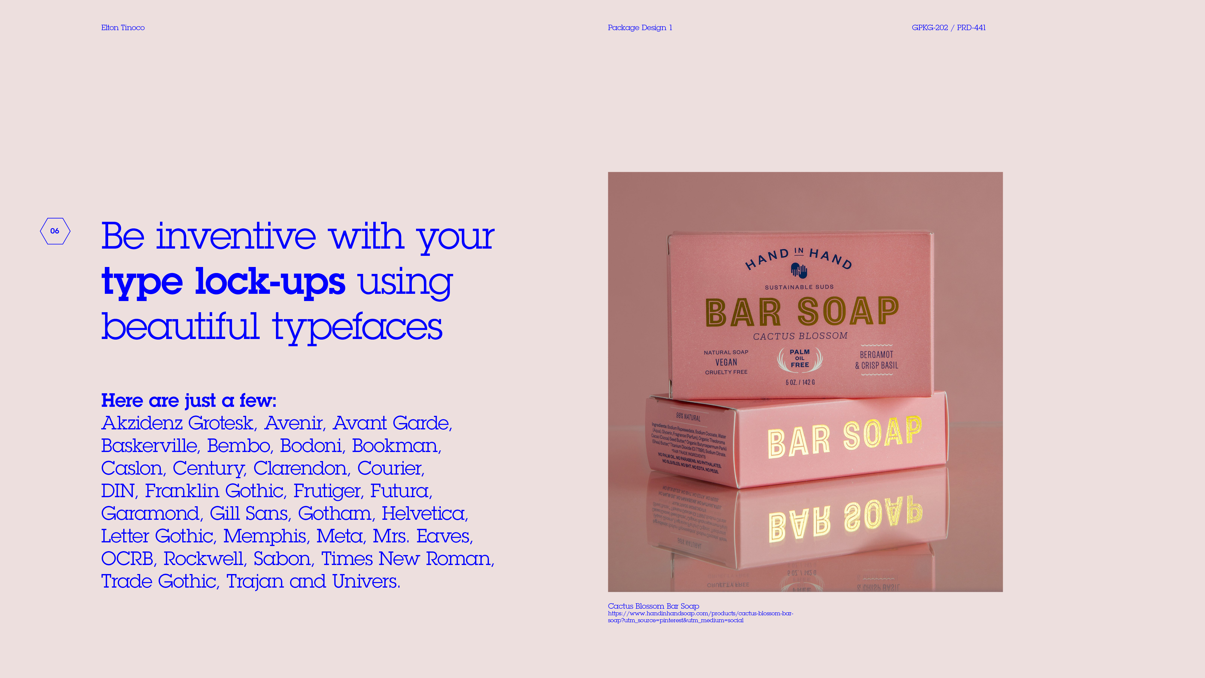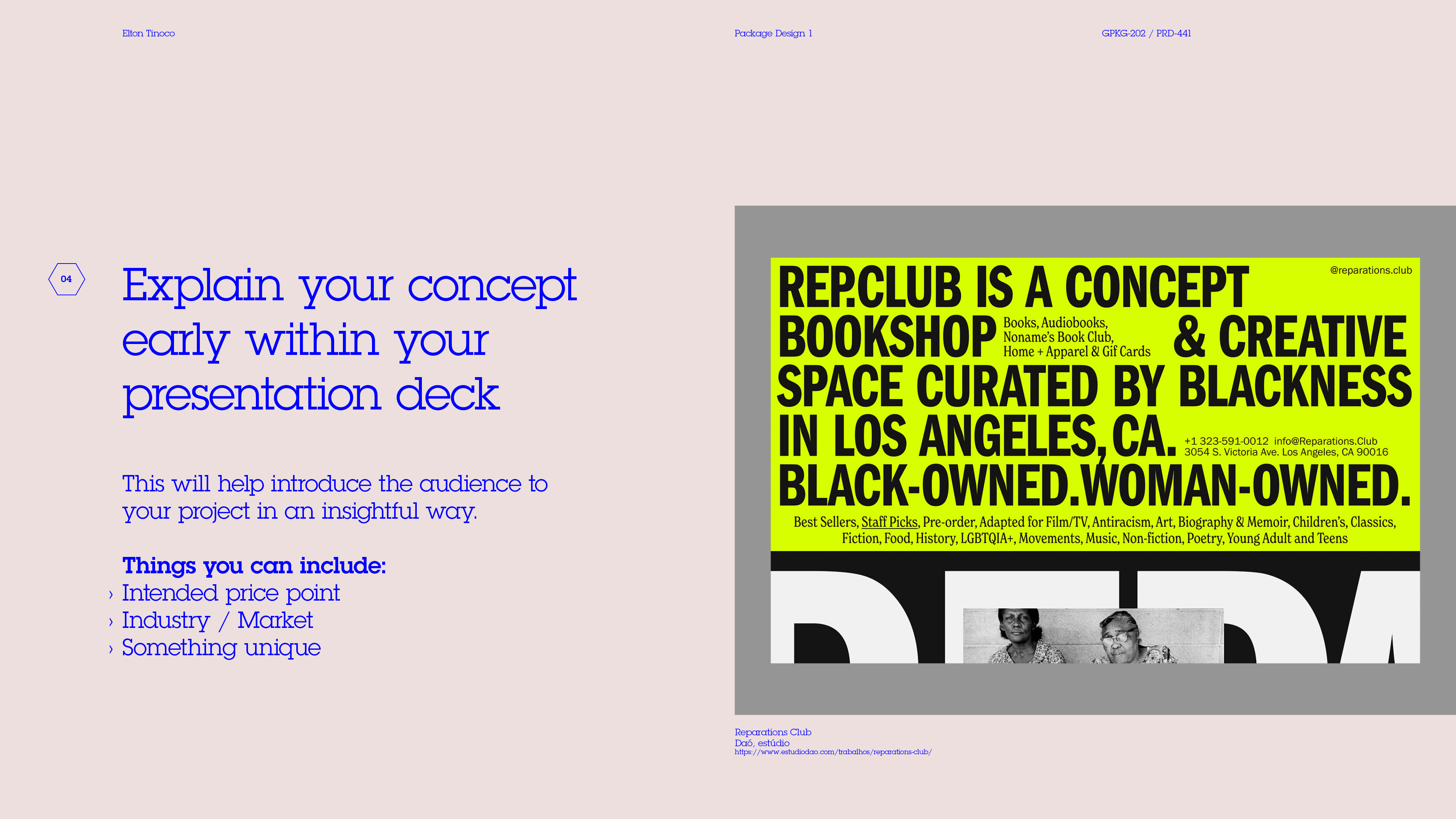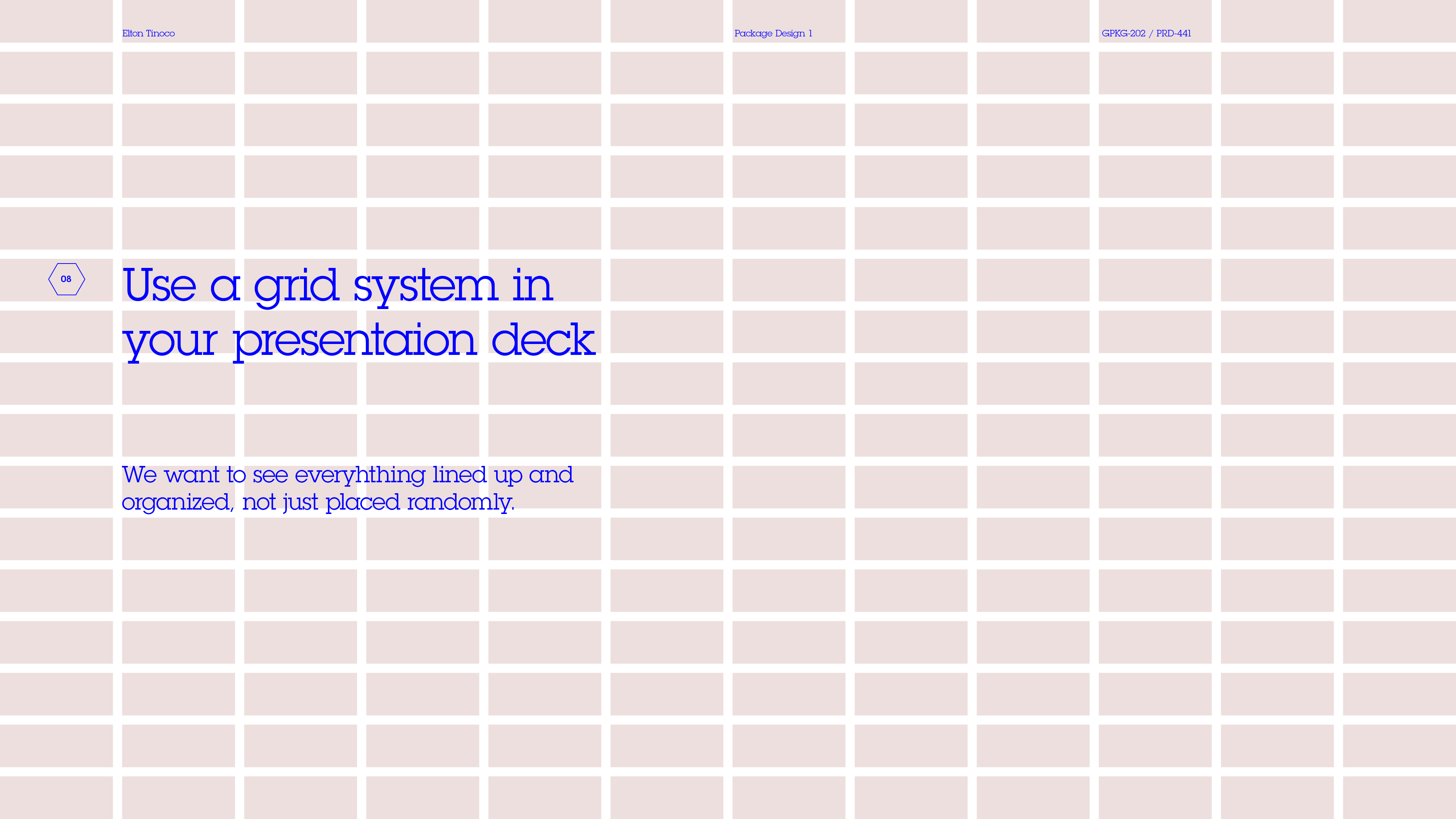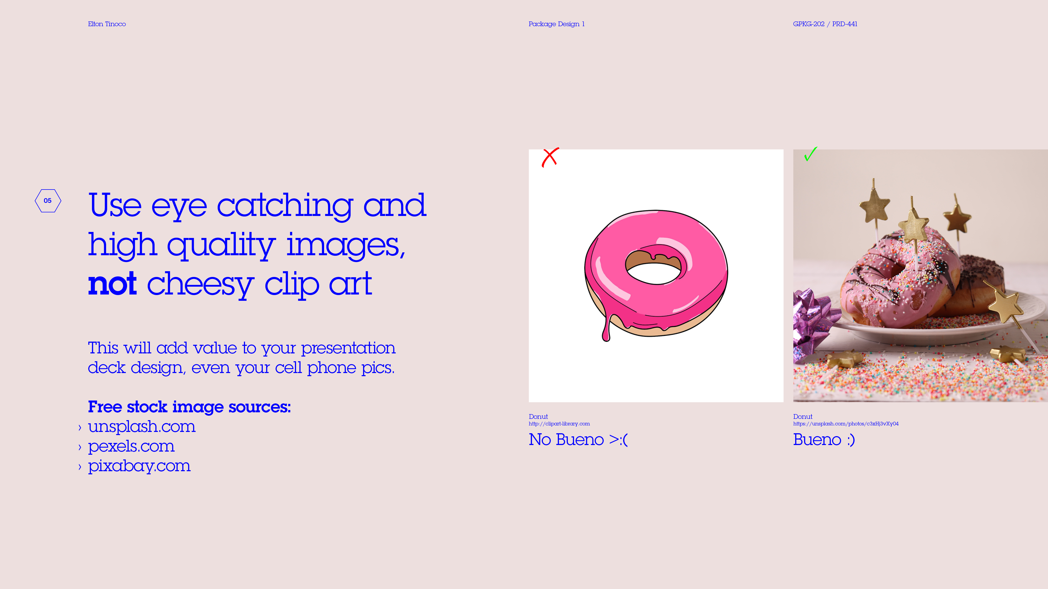 I'm currently a teaching assistant for package design 1 professor, Dan Hoy. This being my first term as a TA, I thought something I can do to be a better serve the class was to create a simple presentation deck of useful tips. As someone who is a visual learner myself, I thought this would be a helpful guide to the spectrum of student majors within the class. The idea was to show just enough but not too much, allowing for students in the class to still explore their design sensibilities.