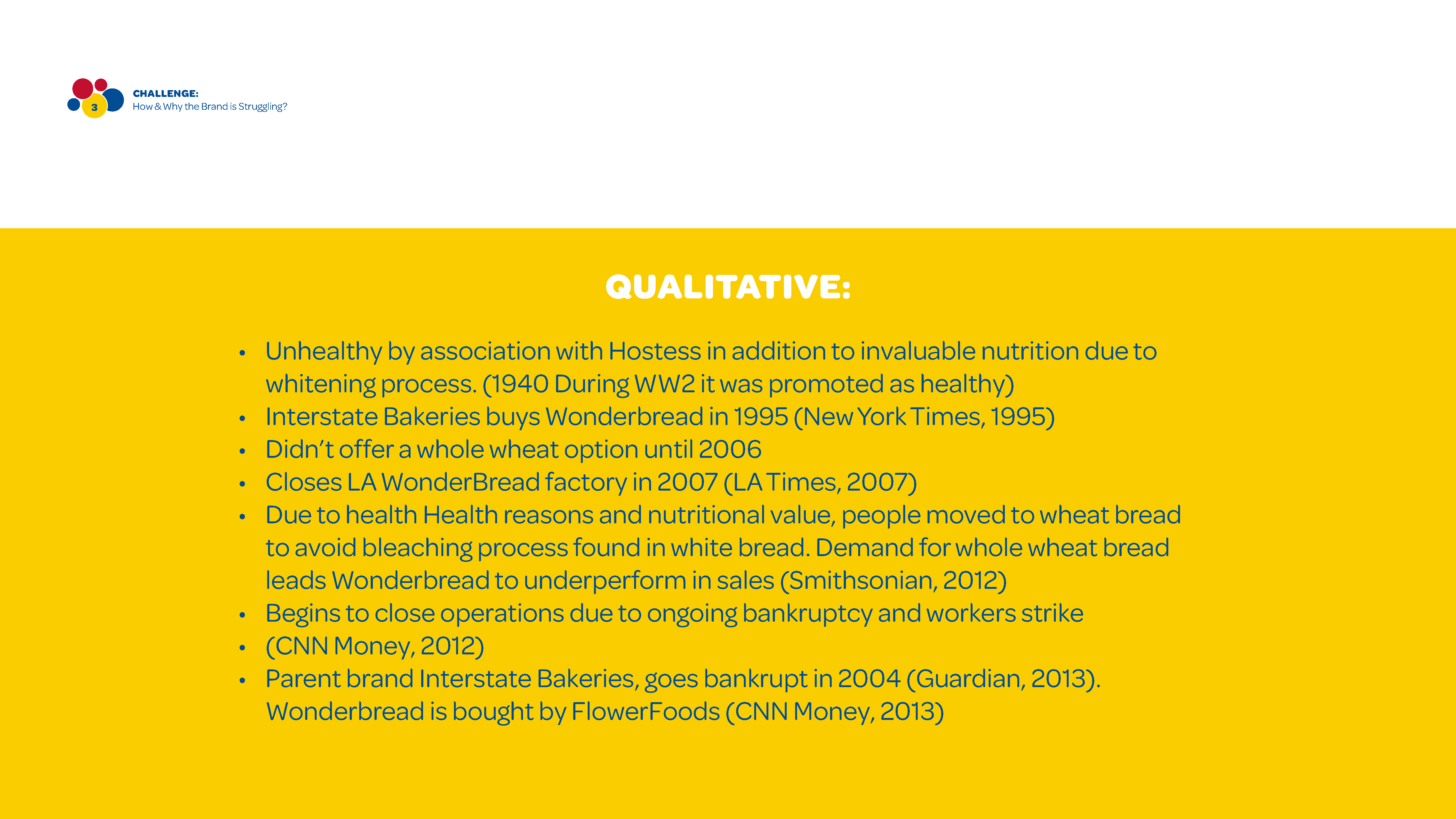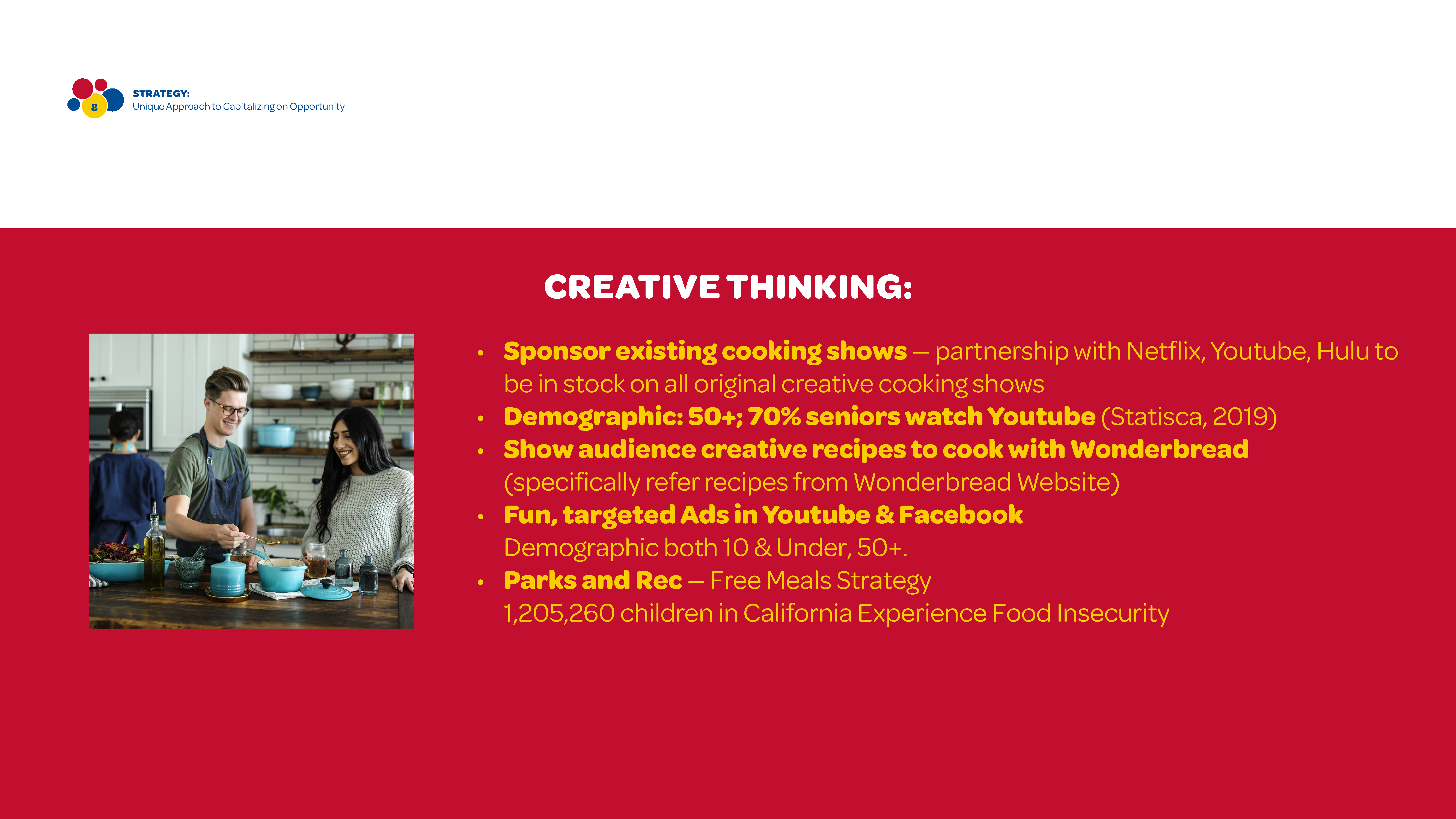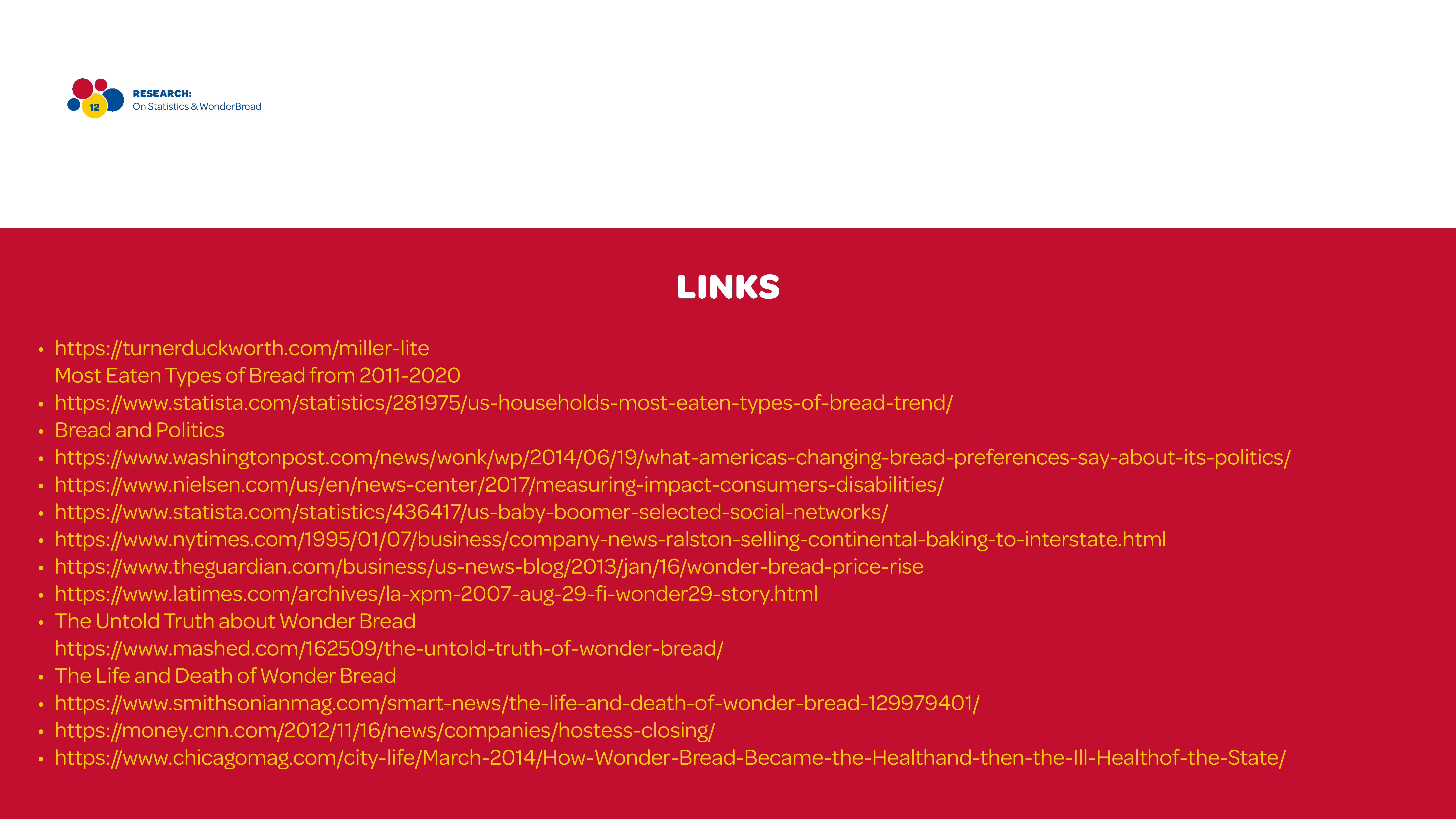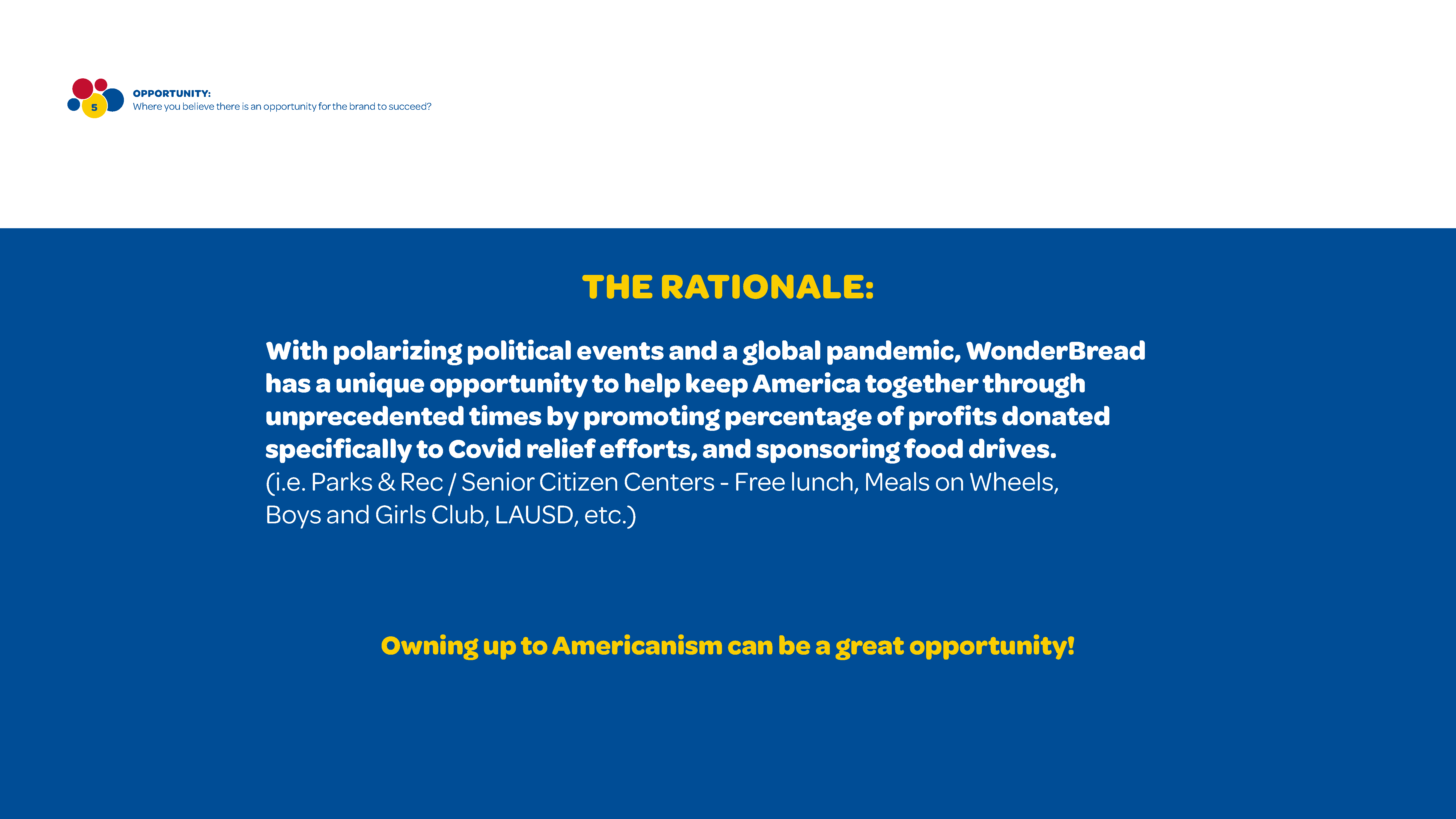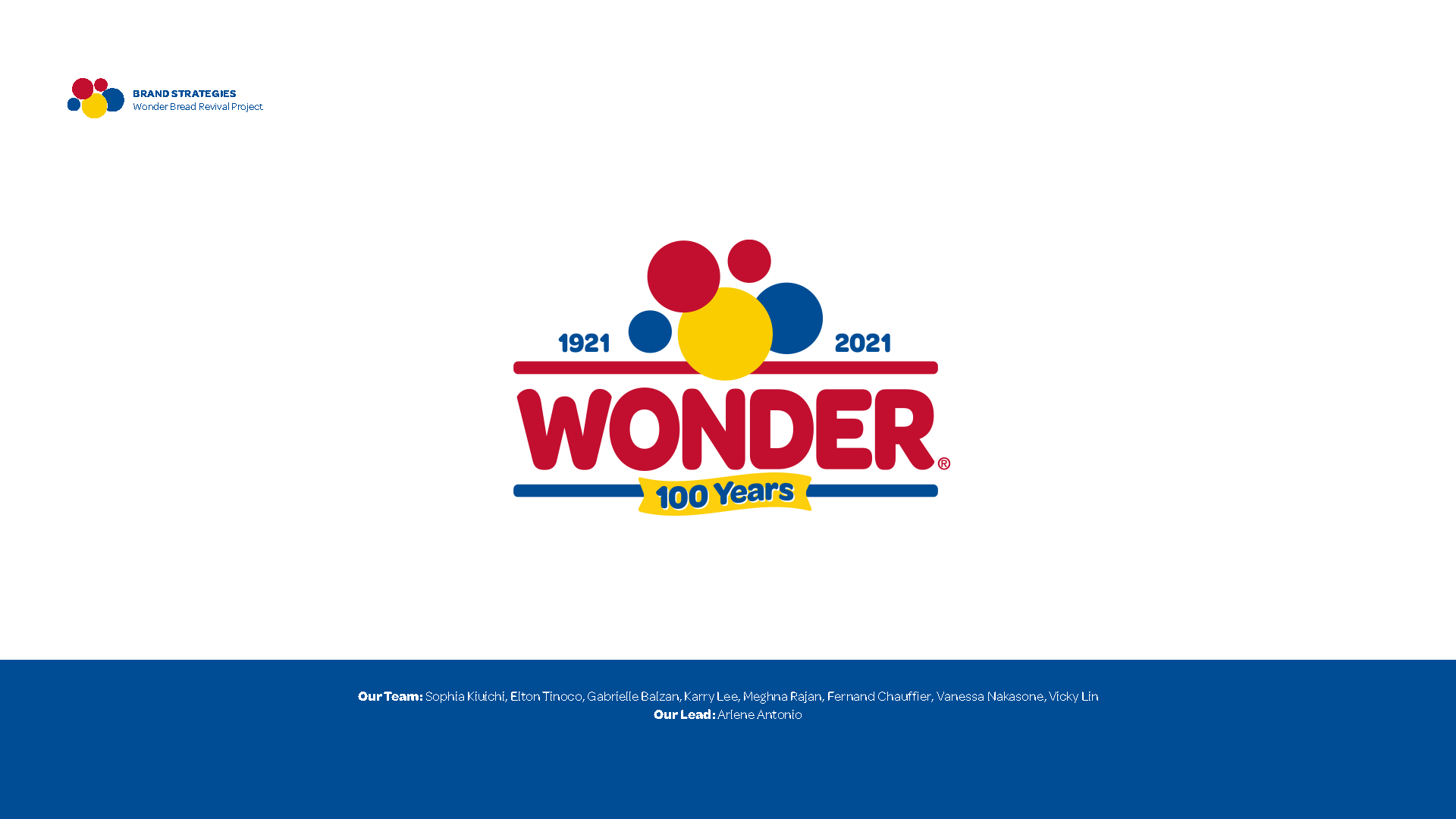 For Brand Strategies with Terry Stone, our final project was to work with a group to develop a strategy for a struggling brand. In this case, it was for Wonder Bread. Along with my team members, we conducted research and developed a pitch deck for the company suggesting what it can do to come back into relevance regardless of its bad reputation. Additionally I designed the presentation deck and helped lead presenting it in class for out final.