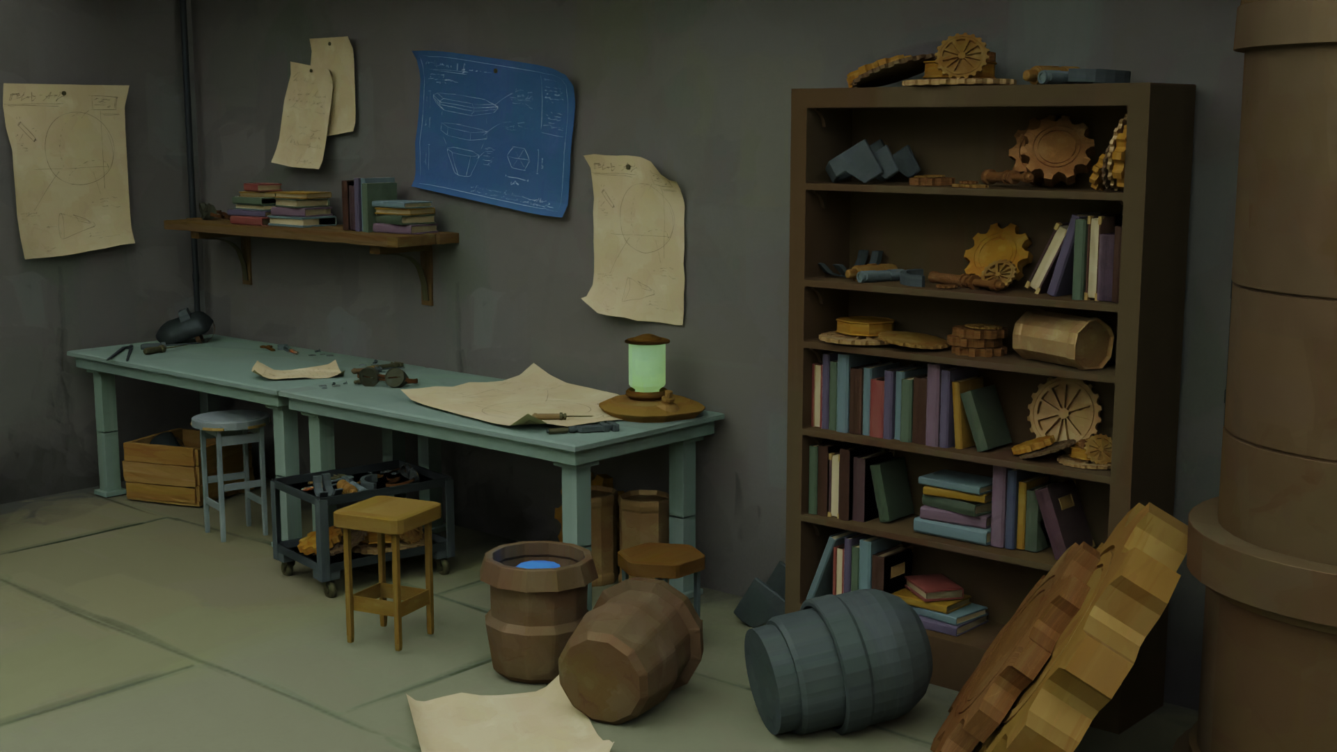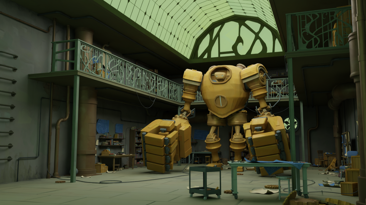 I was so inspired by Fortiche's work on Arcane that I wanted to dedicate a project to studying the design and style of that show. I created this warehouse workshop, set in Zaun, where a group of engineers have been refurbishing a giant robot, which is a variation of the character "Blitzcrank," which is why I maintained a similar silhouette to the original.