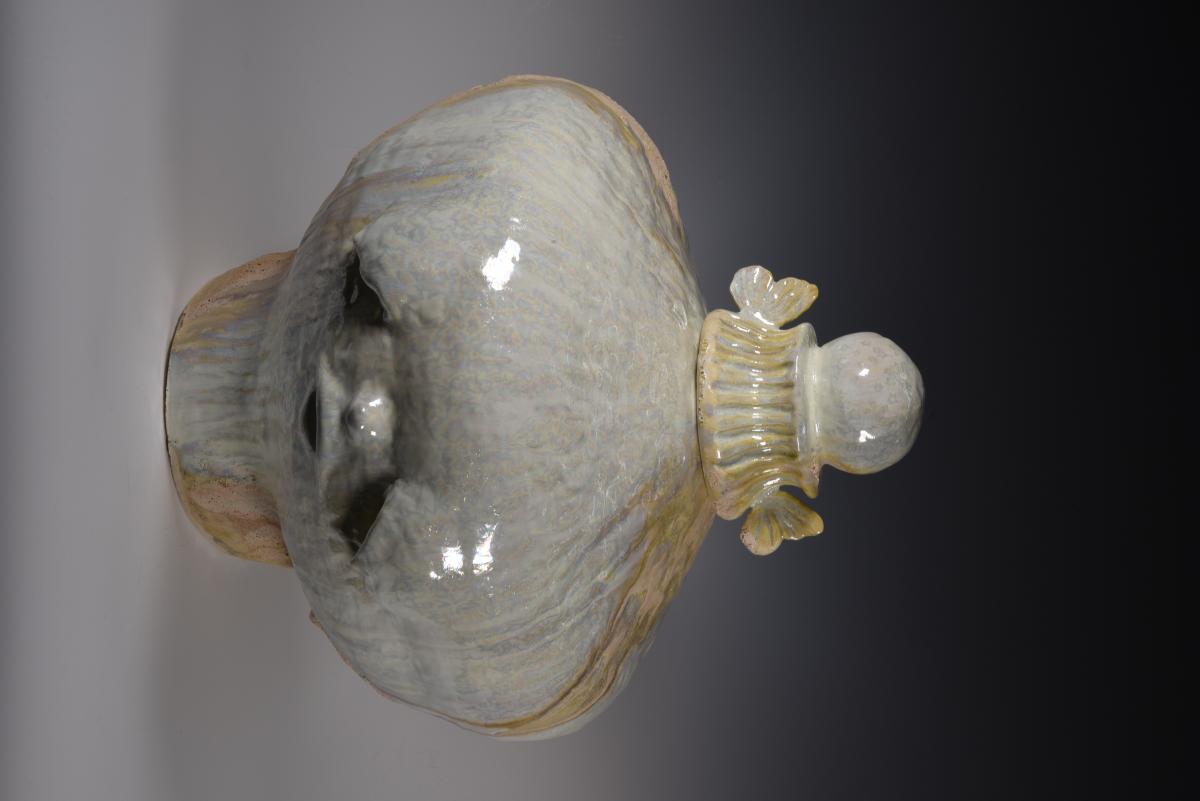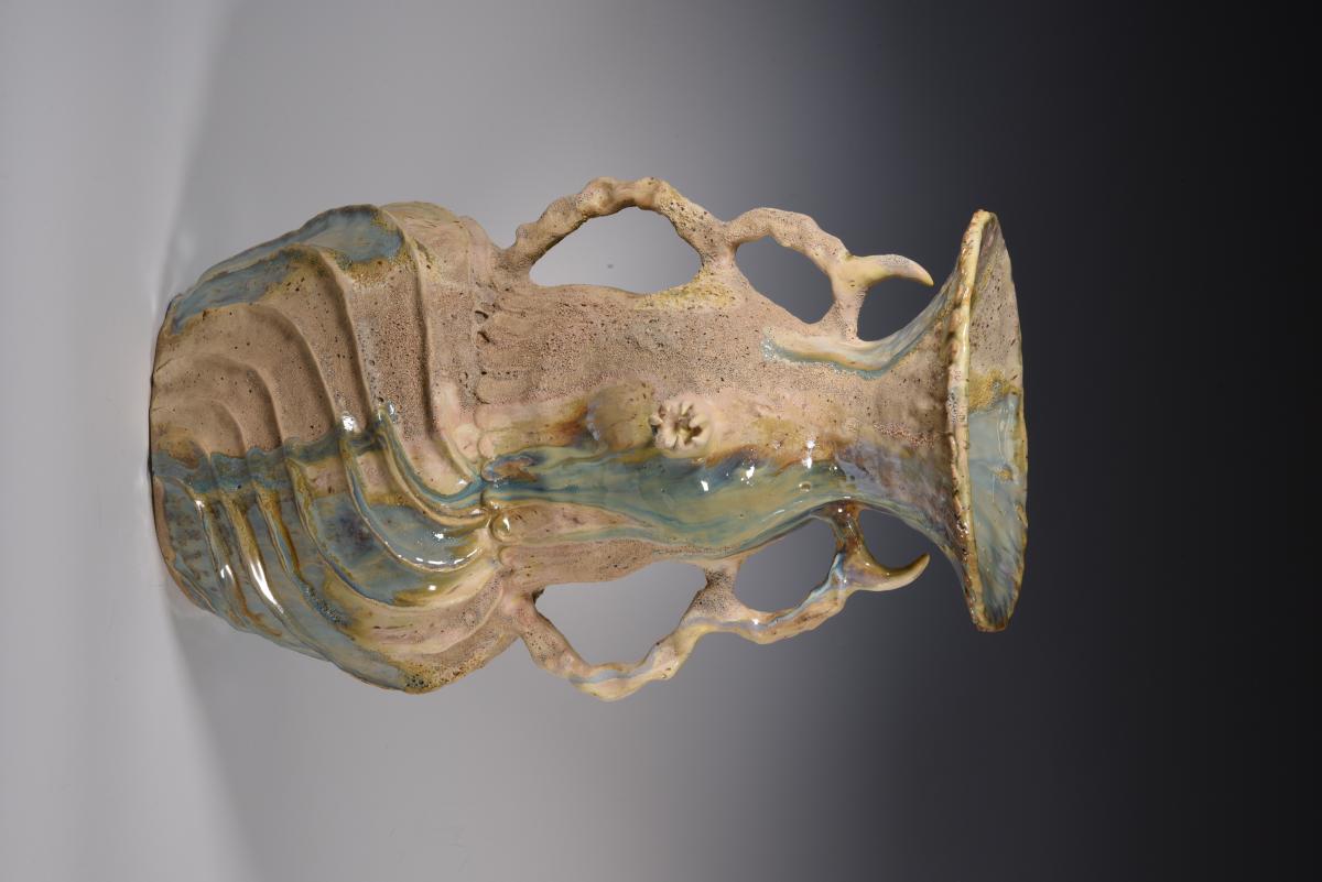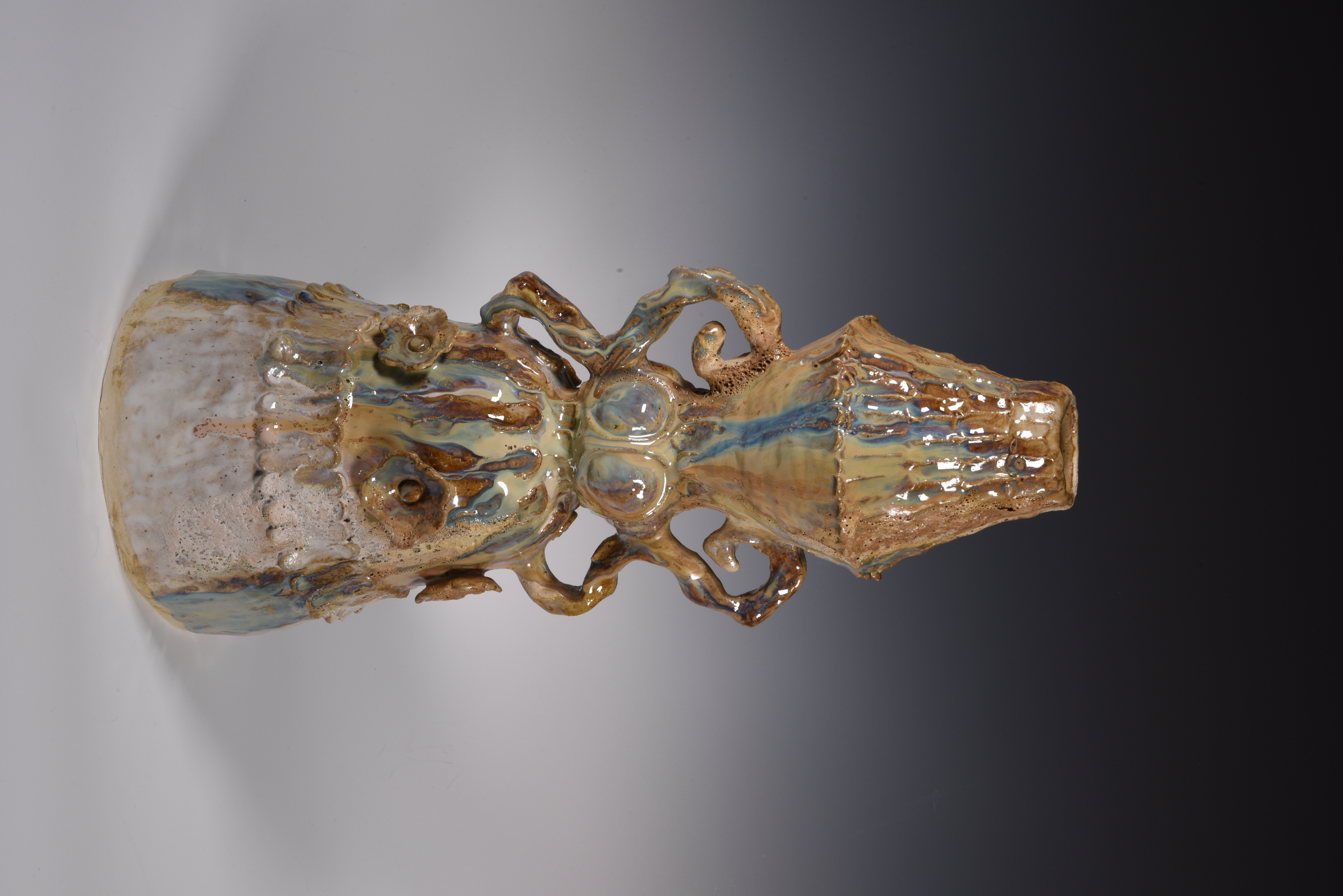 I intuitively sculpted 3 large vessels to challenge myself with scale. The shapes were sculpted intuitively but the surface textures and glaze colors are inspired by elements in nature such as rust, eroding rocks, insects, and flowers. The vessels range from 18"-22" tall and stand together in a series.