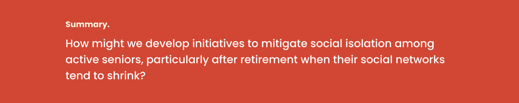 Social isolation among active seniors is a pressing issue today. After retirement, connections from work and social activities often diminish, leading to a smaller social circle. Family members may also be busy or distant, making communication difficult. To address this, programs and services supporting seniors' social connections are crucial. Our 'able' platform will facilitate new friendships and shared interests, reducing isolation and improving quality of life.