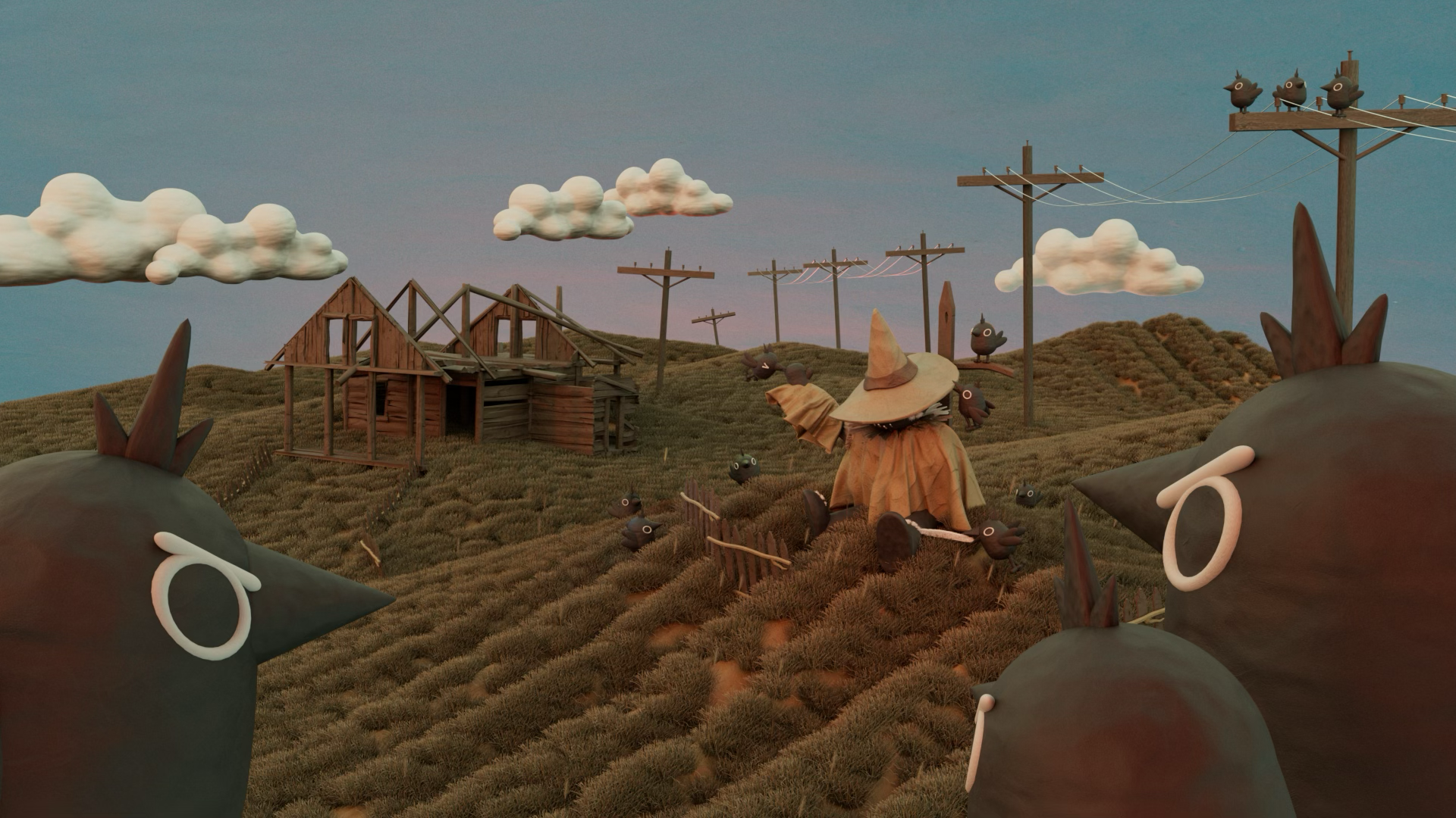 I wanted empathy in this project to run two ways. One way for the tortured scarecrow and its even darker downfall into the villain and the other for the crows and how their mistreatment becomes the result of their deaths. While difficult to figure out the story path from bad to worse, it was an exciting challenge to figure out narratives can go downhill even more.