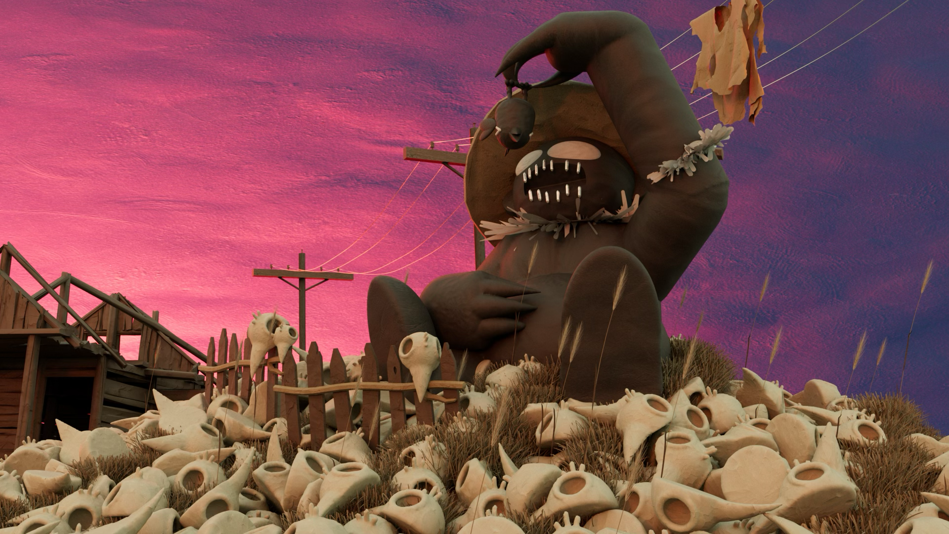There was a scarecrow who stood up on a hill, constantly harassed by a murder of crows it was meant to scare off. It stayed still and quiet, with no complaints. One day, the scarecrow suddenly grabbed a crow by the neck, shocking the others and sending them into fight or flight. It grabbed and tortured the crows that had annoyed it for so long. Eventually, the scarecrow ate them up and all that remained on the field was nothing but the scarecrow, plump and full, with a pile of bones.