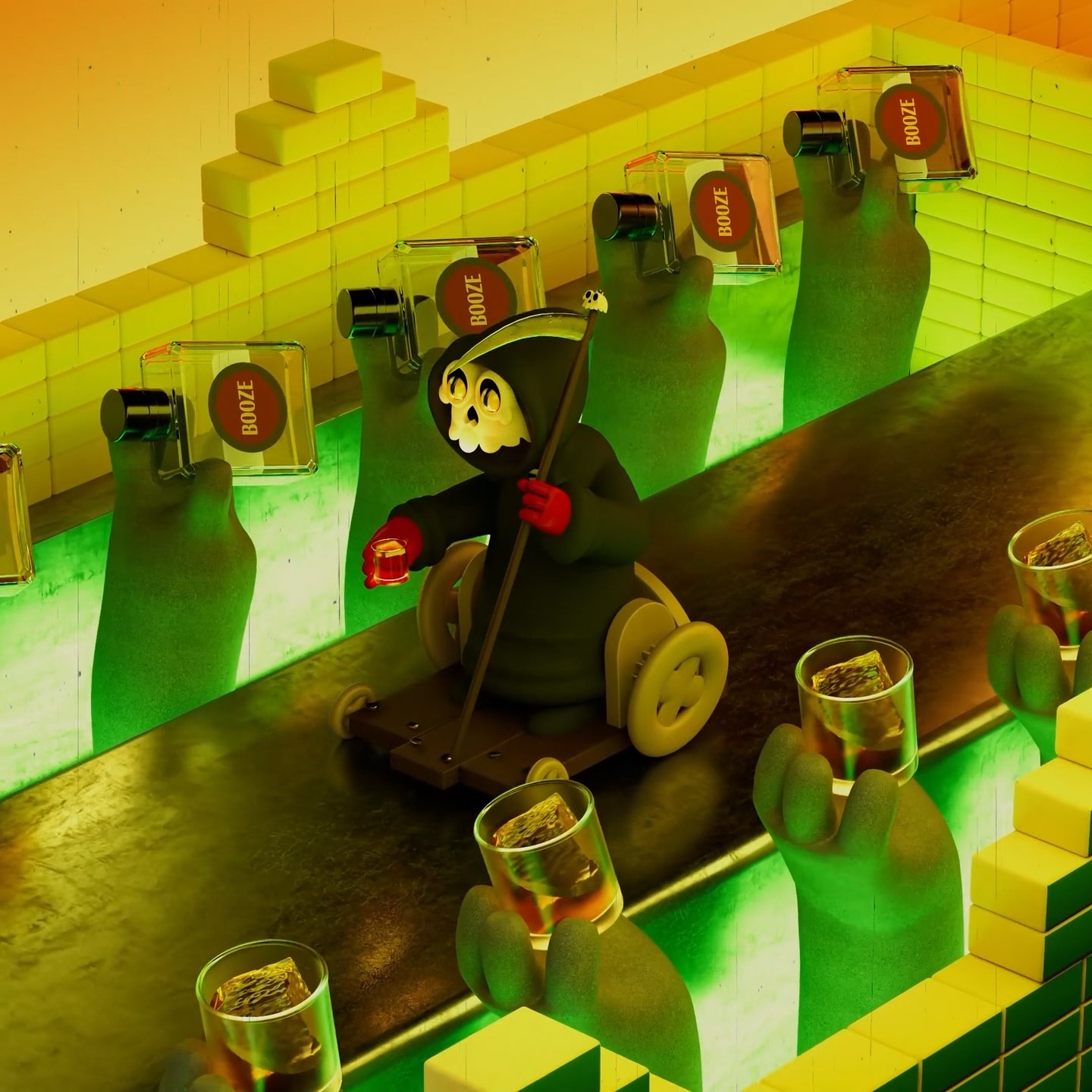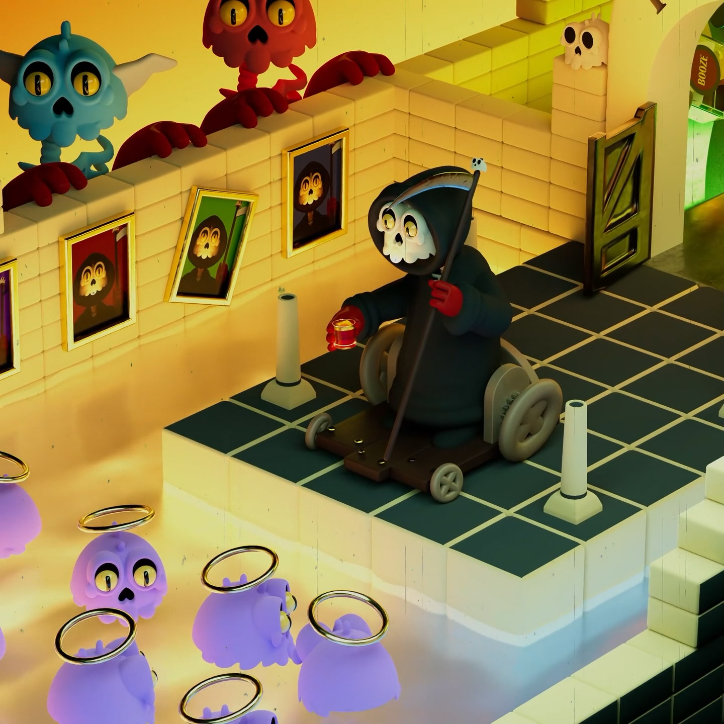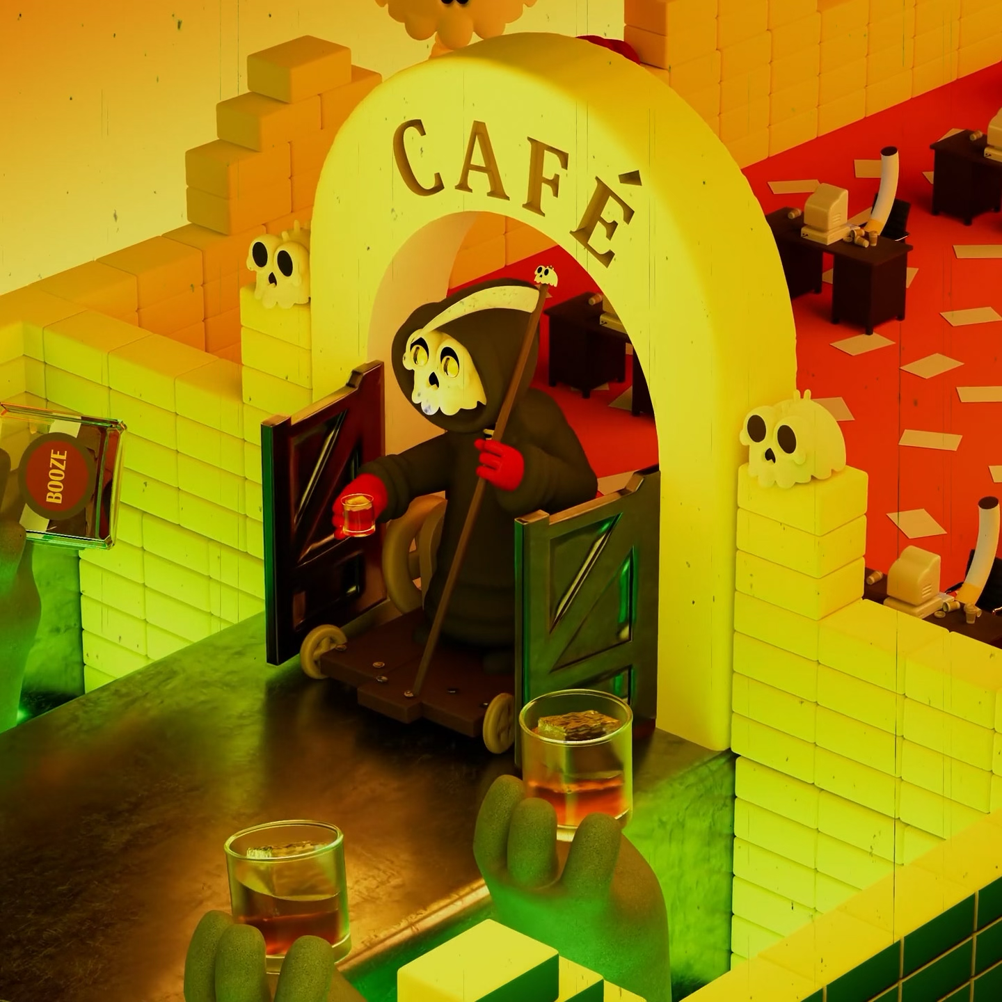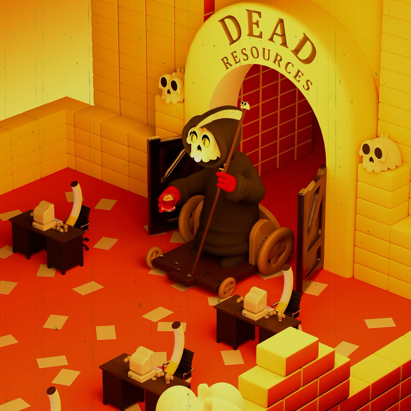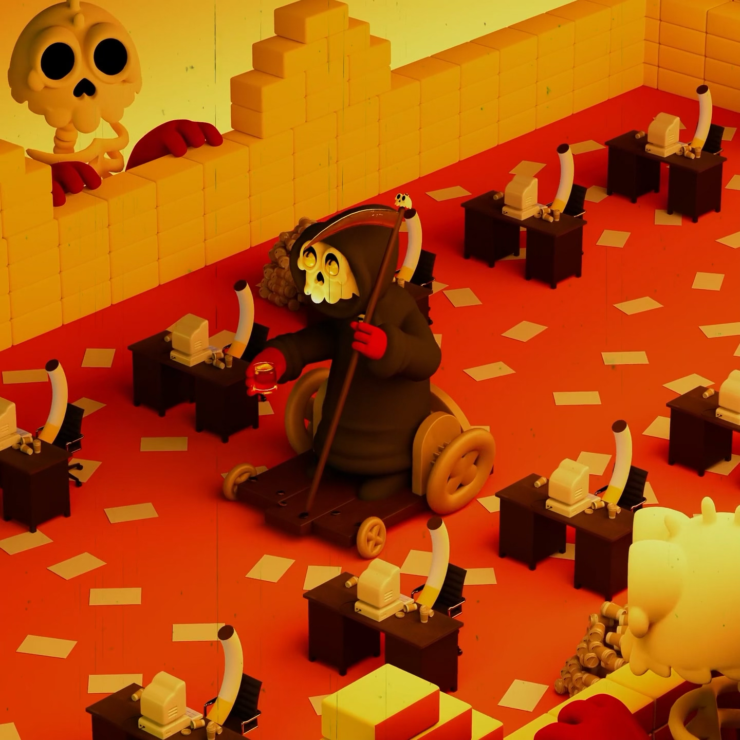 3D animated abstract narrative to show a depiction of a daily routine for a grim reaper. It would show it's daily process of going through the paperwork/office, grabbing a quick drink from the office cafe, and eventually pick up souls that have yet to be judged in the drop-off zone.