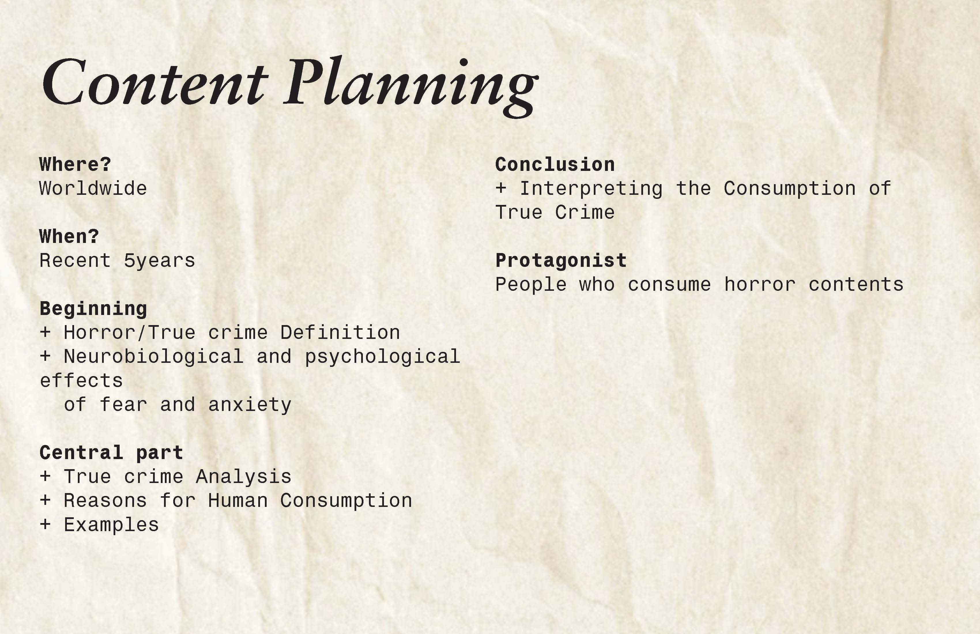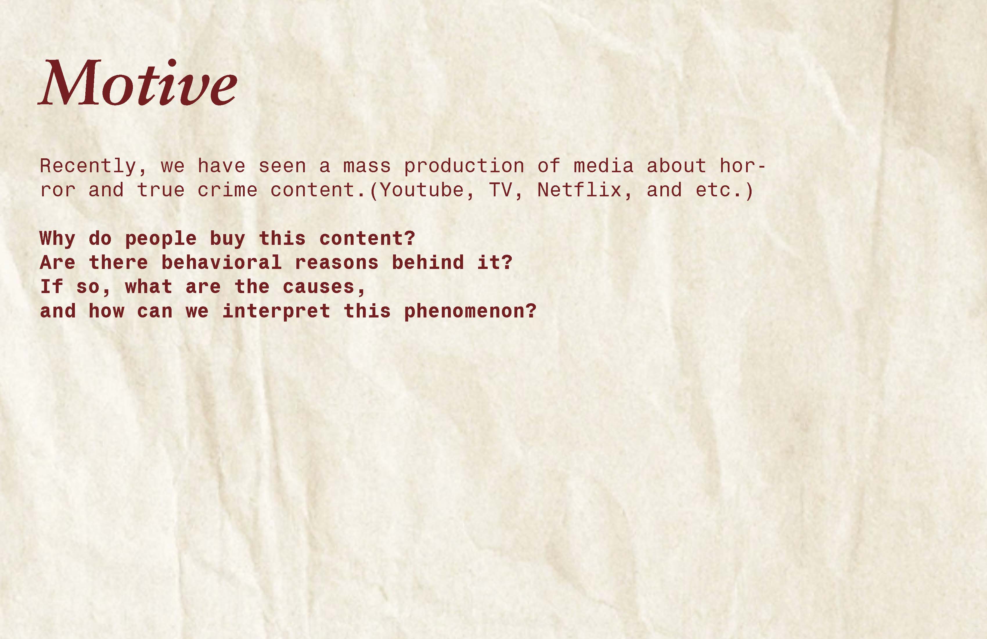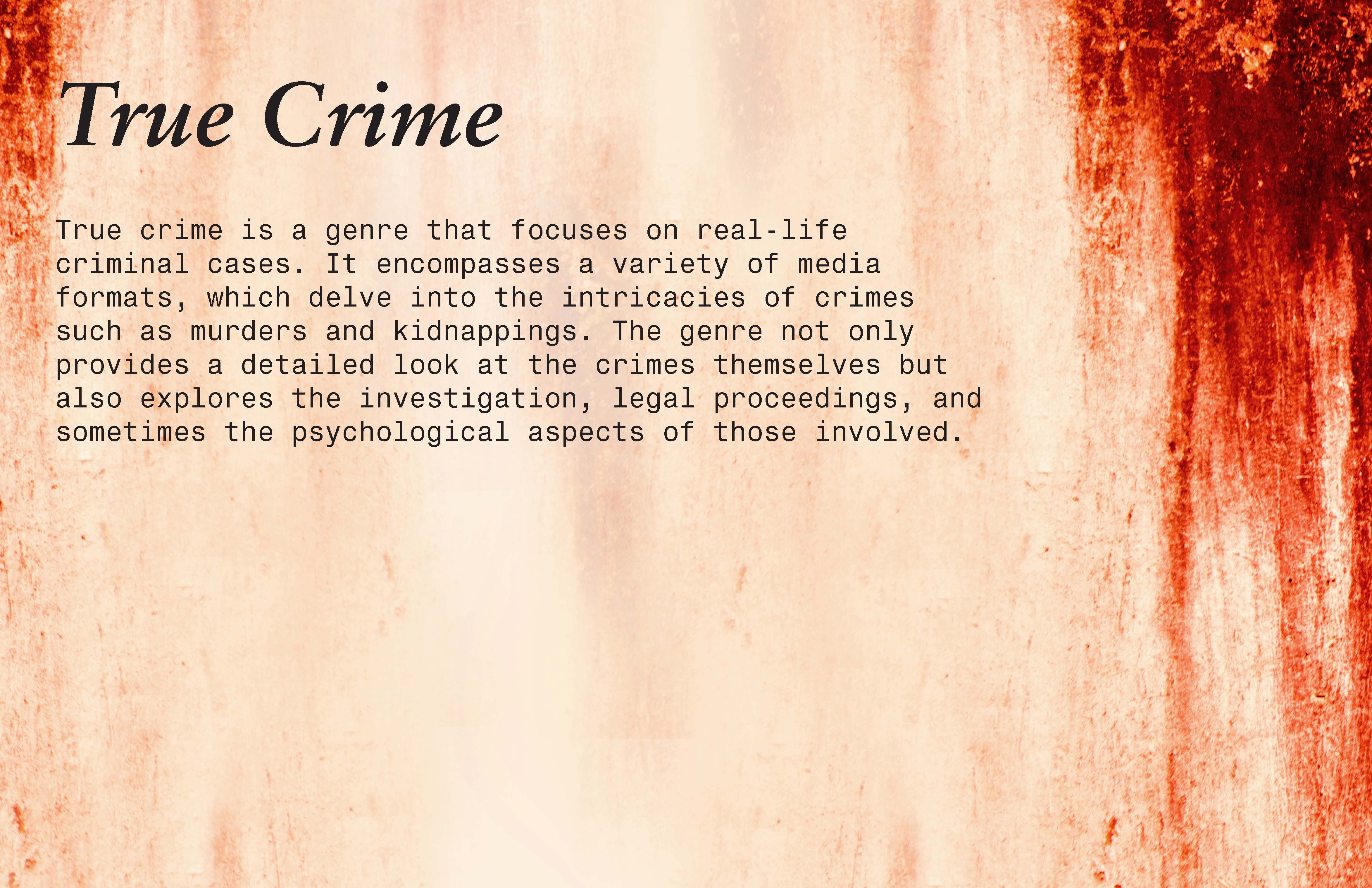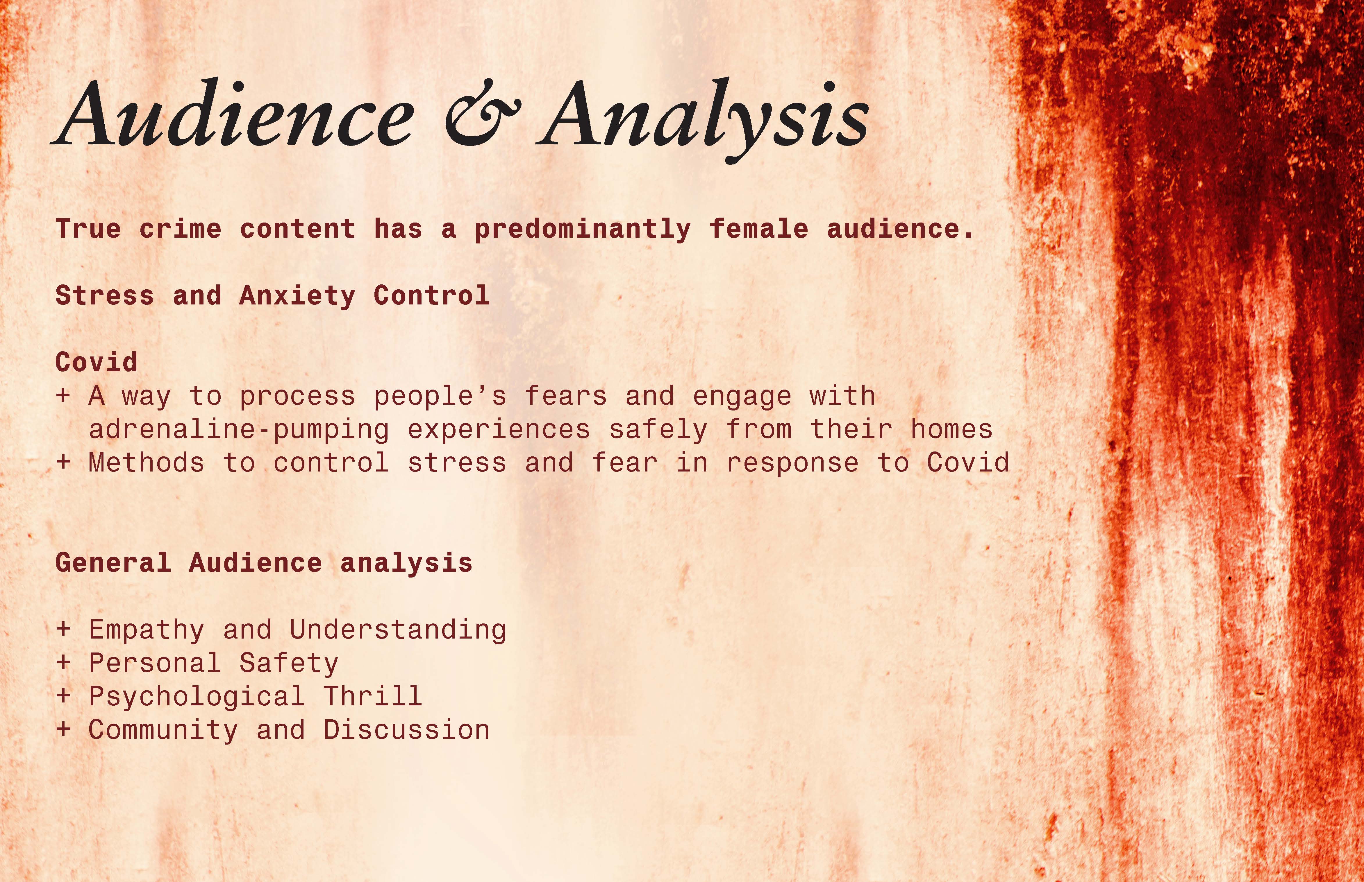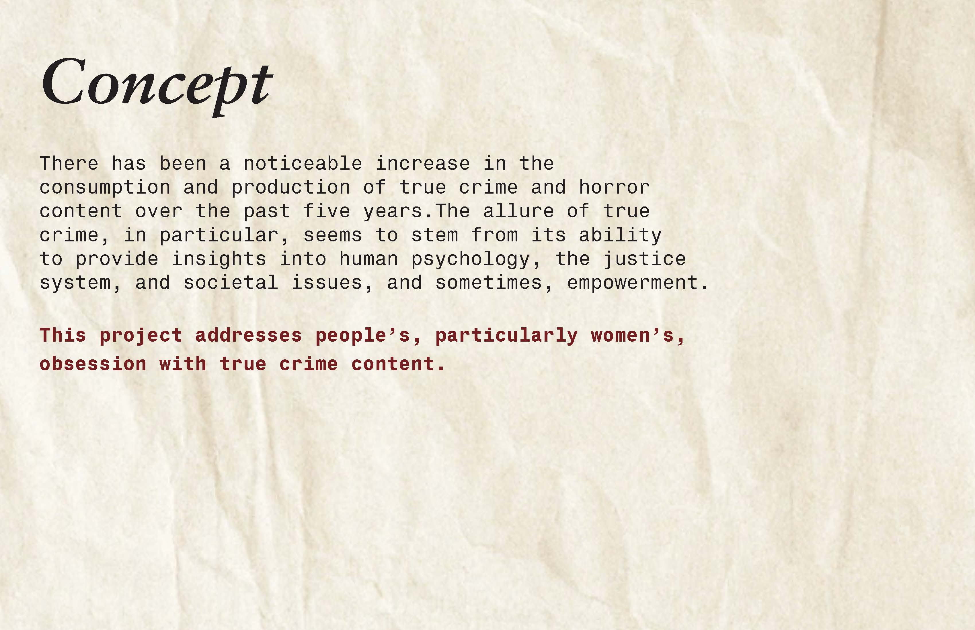 There has been a noticeable increase in the consumption and production of true crime and horror content over the past five years.The allure of true crime, in particular, seems to stem from its ability to provide insights into human psychology, the justice system, and societal issues, and sometimes, empowerment. This project addresses people’s, particularly women’s, obsession with true crime content.
