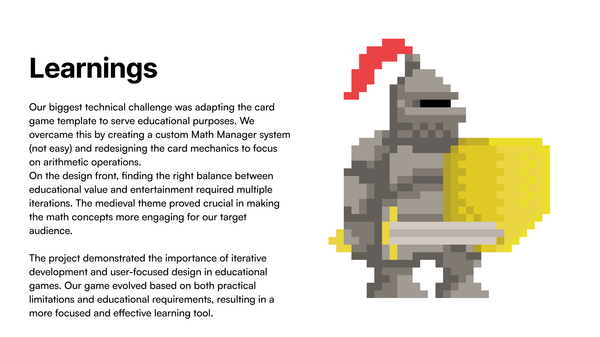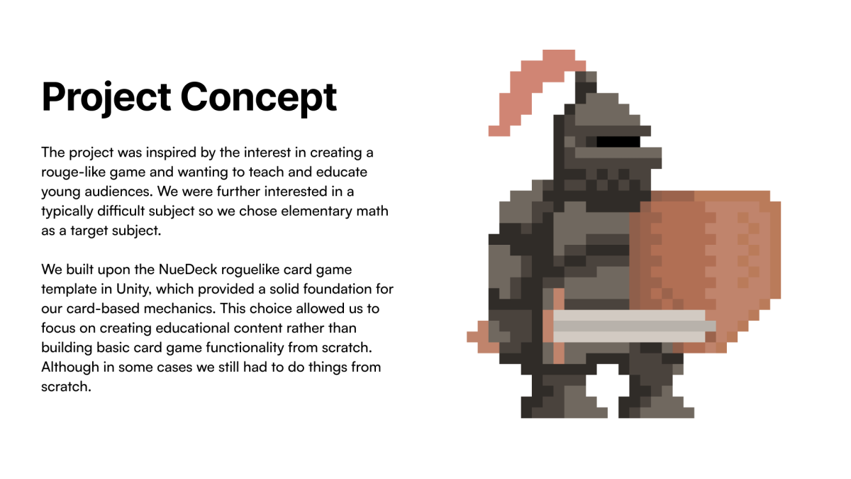 Number Knight emerged from a collaborative effort to create an engaging math learning experience for elementary students through a blend of roguelike gameplay and arithmetic challenges.