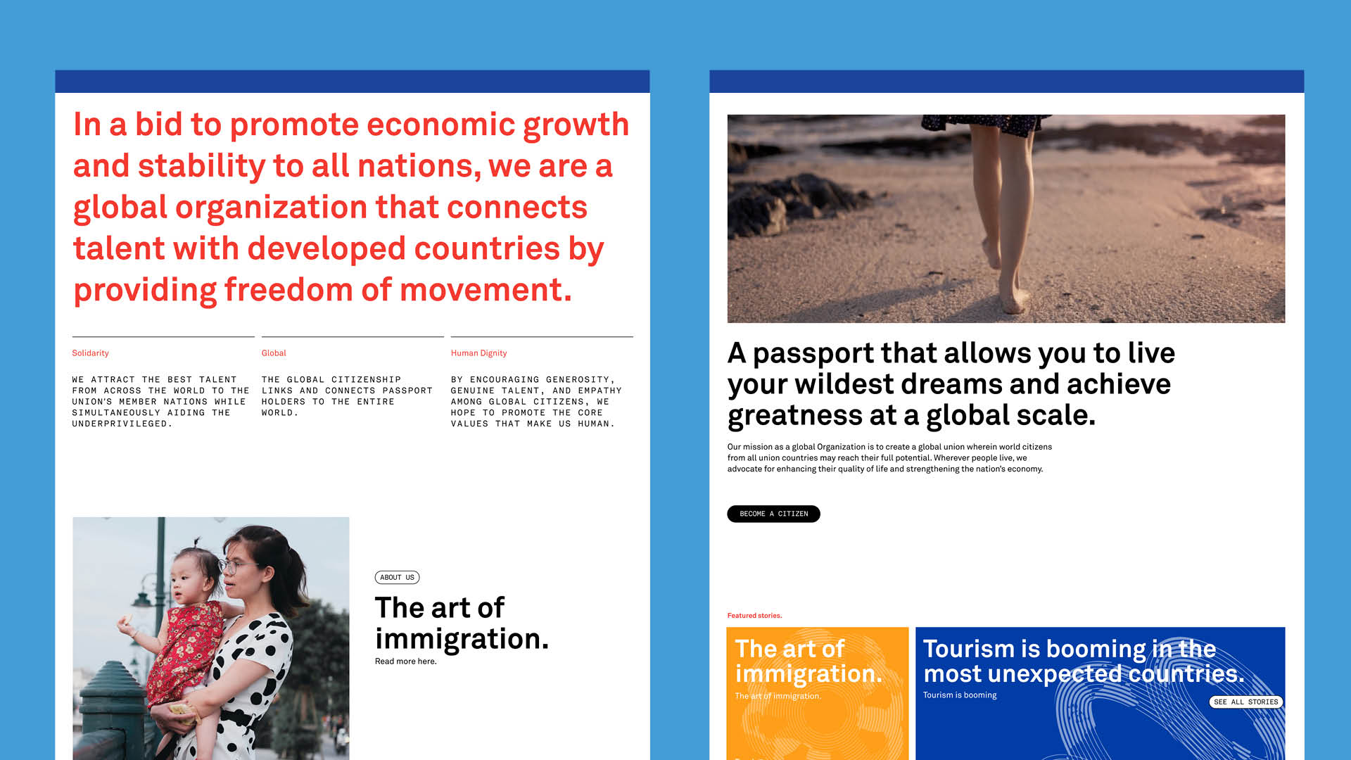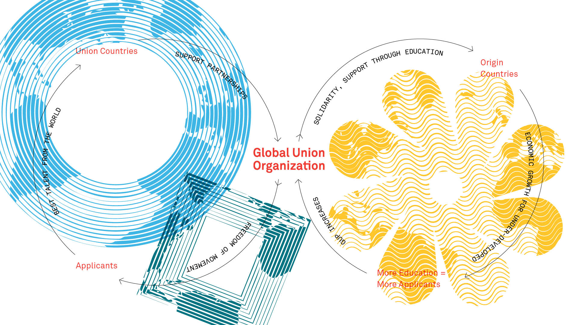 The Global Union is a one of a kind organization that seeks to establish a worldwide system granting skilled talent to work anywhere around the world, creating a global workforce.The Union is tailored to meet the unique needs of an ever-changing global economy, allowing qualified individuals that meet the Union criteria to apply for a World Citizen Passport. As an organization that exudes inclusivity and hopefulness, I decided to create a brand and strategy that would resonate and endure.