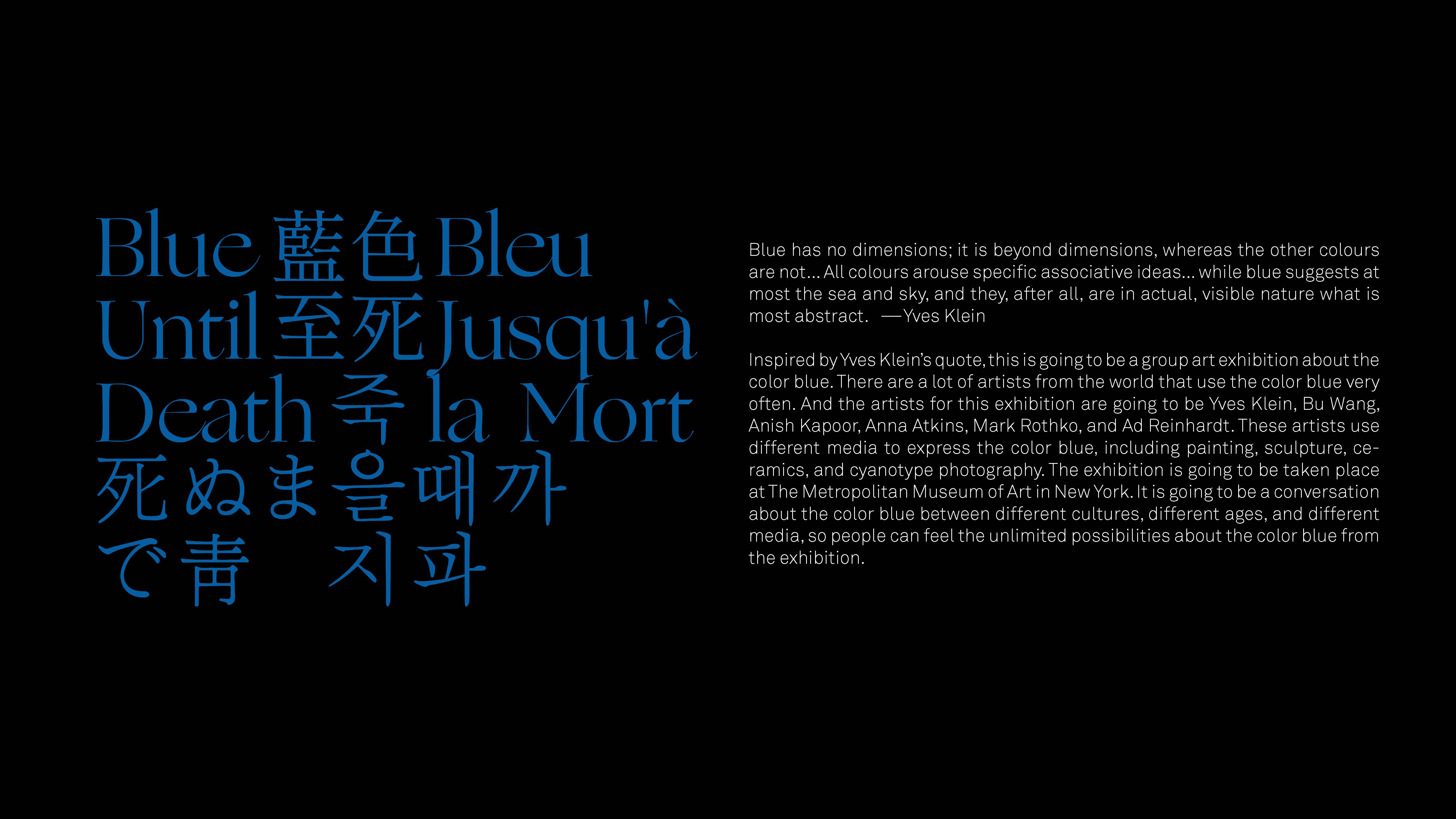 Inspired by Yves Klein’s quote, this is going to be a group art exhibition about the color blue. There are a lot of artists from the world that use the color blue very often. And the artists for this exhibition are going to be Yves Klein, Bu Wang, Anish Kapoor, Anna Atkins, Mark Rothko, and Ad Reinhardt. These artists use different media to express the color blue, including painting, sculpture, ceramics, and cyanotype photography.