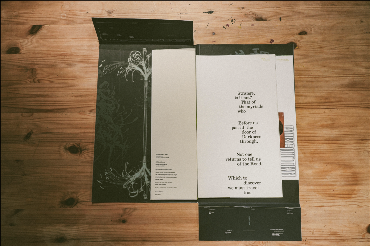 An immersive exhibition and book that explores the universal human experience of death and mortality through a diverse range of cultural customs such as funerals, rituals, and festivals. It unravels various perceptions surrounding death by diving into the lore of various gods, myths, beliefs, and artworks. In order to prompt reflections on the fleeting nature of existence, the beauty of life, and the interconnectedness of all living beings.