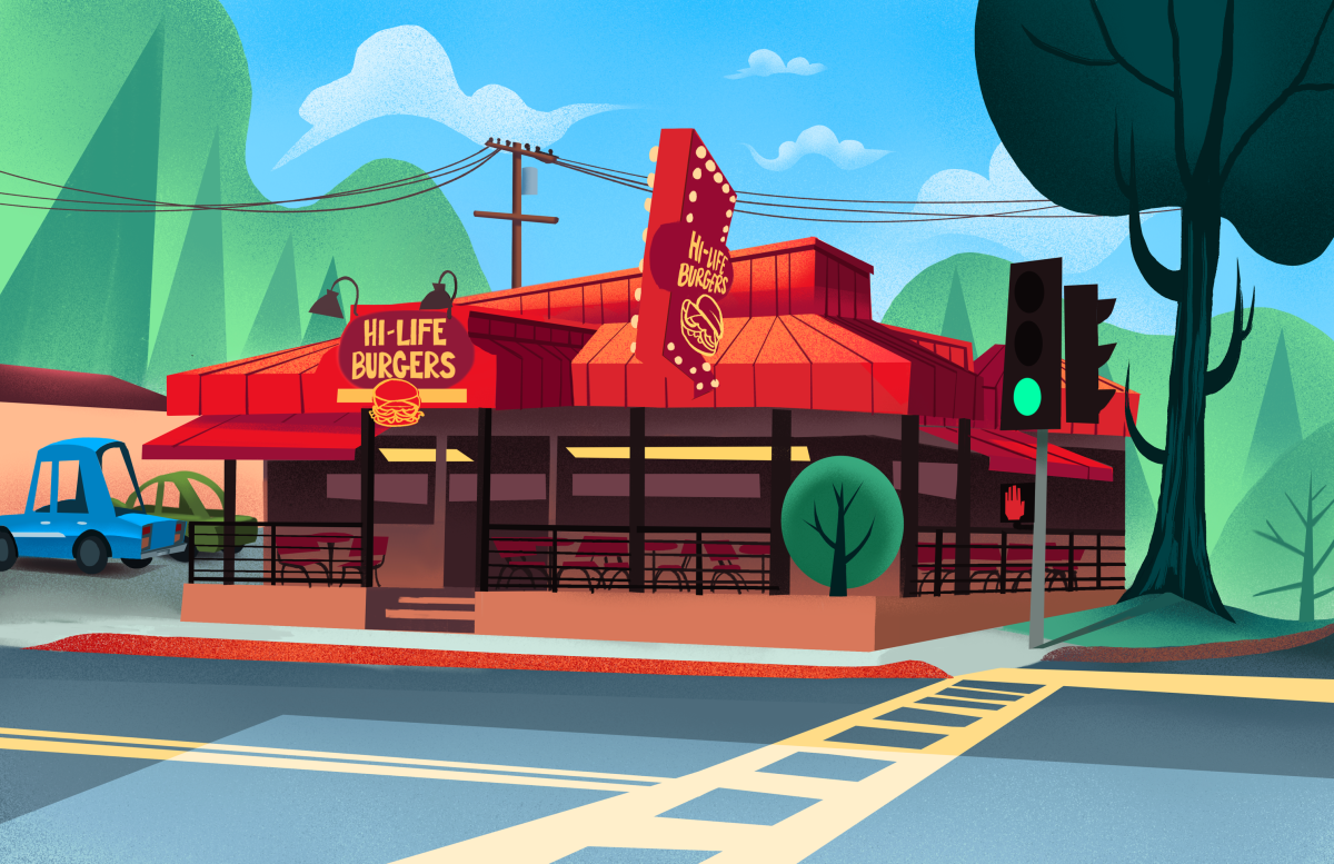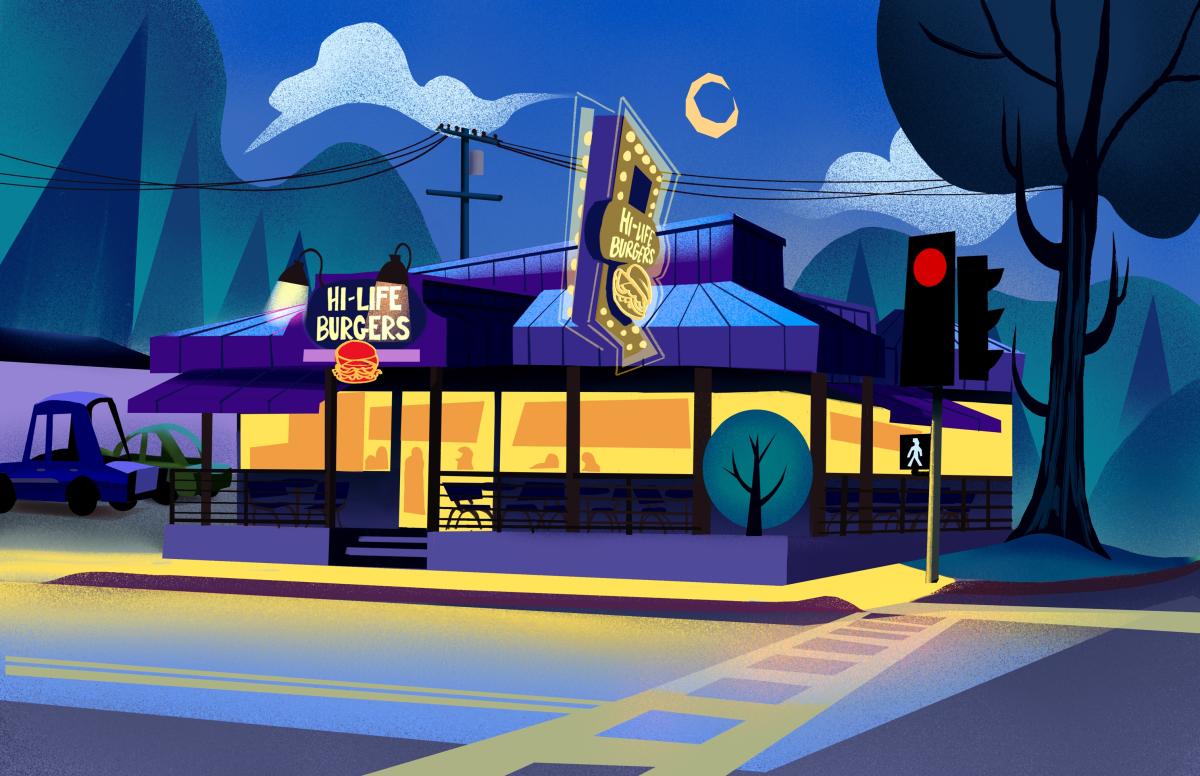 Day and night variations of the Hi-Life Burger exterior inspired by background design from early 2000's cartoons.