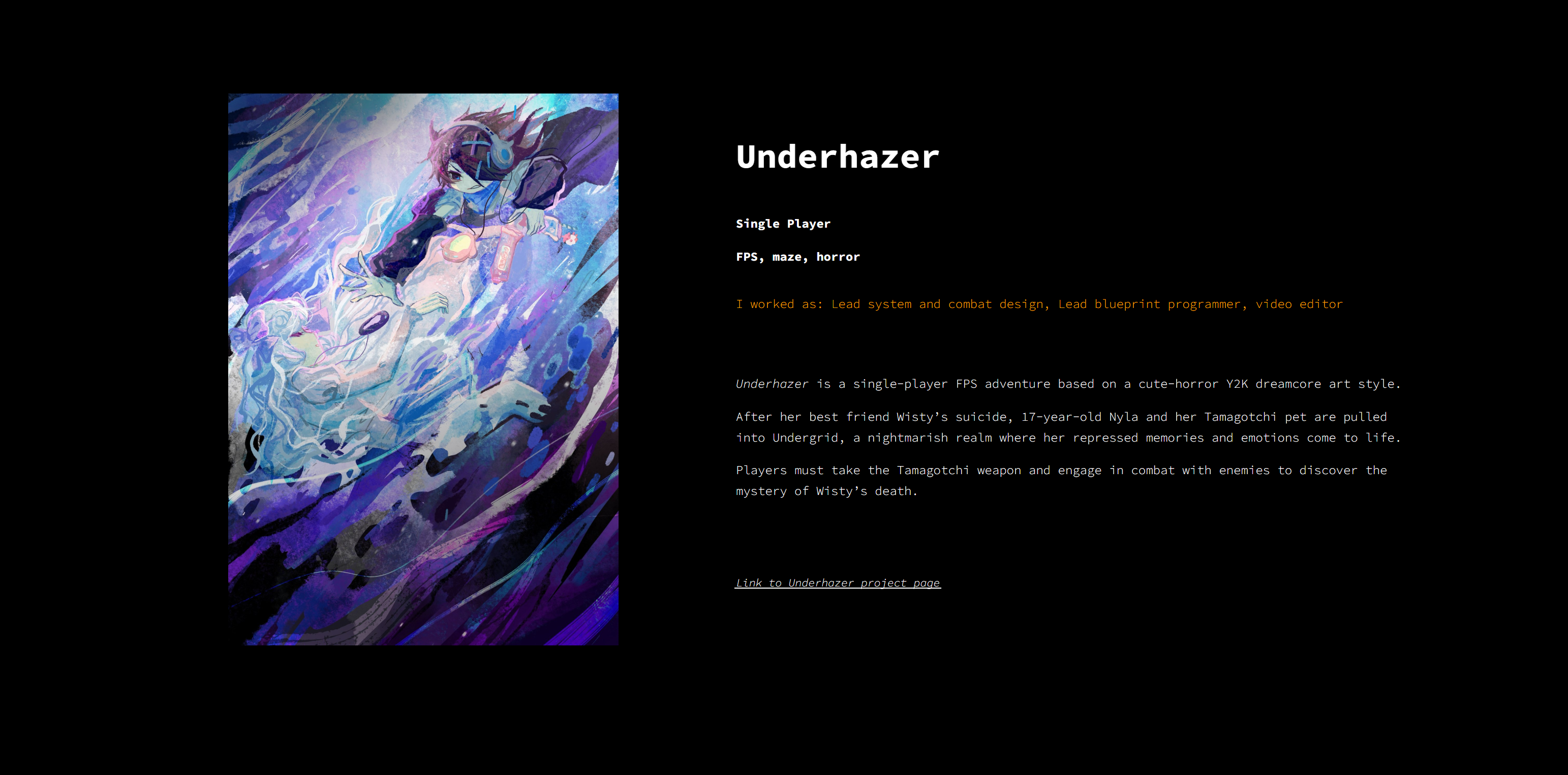Underhazer is a single-player FPS adventure based on a cute-horror Y2K dreamcore art style. After her best friend Wisty’s suicide, 17-year-old Nyla and her Tamagotchi pet are pulled into Undergrid, a nightmarish realm where her repressed memories and emotions come to life. Players must take the Tamagotchi weapon and engage in combat with enemies to discover the mystery of Wisty’s death.