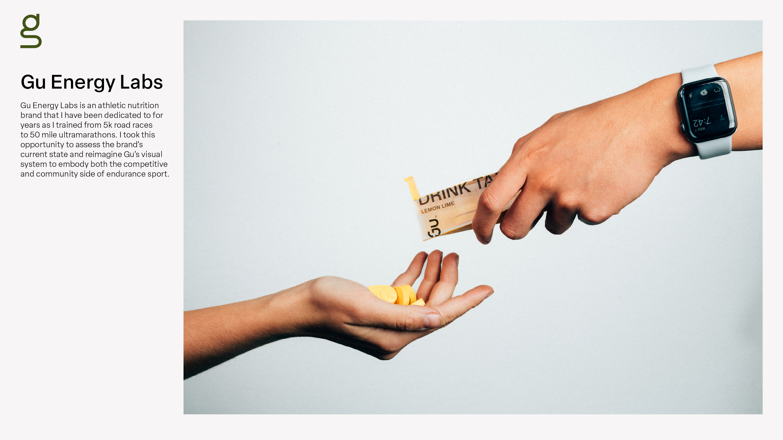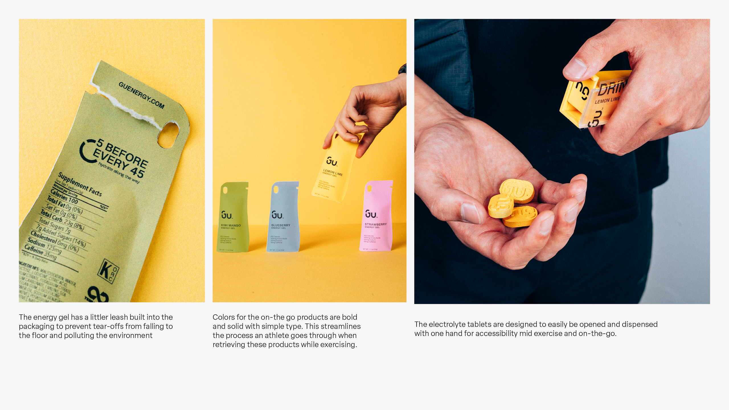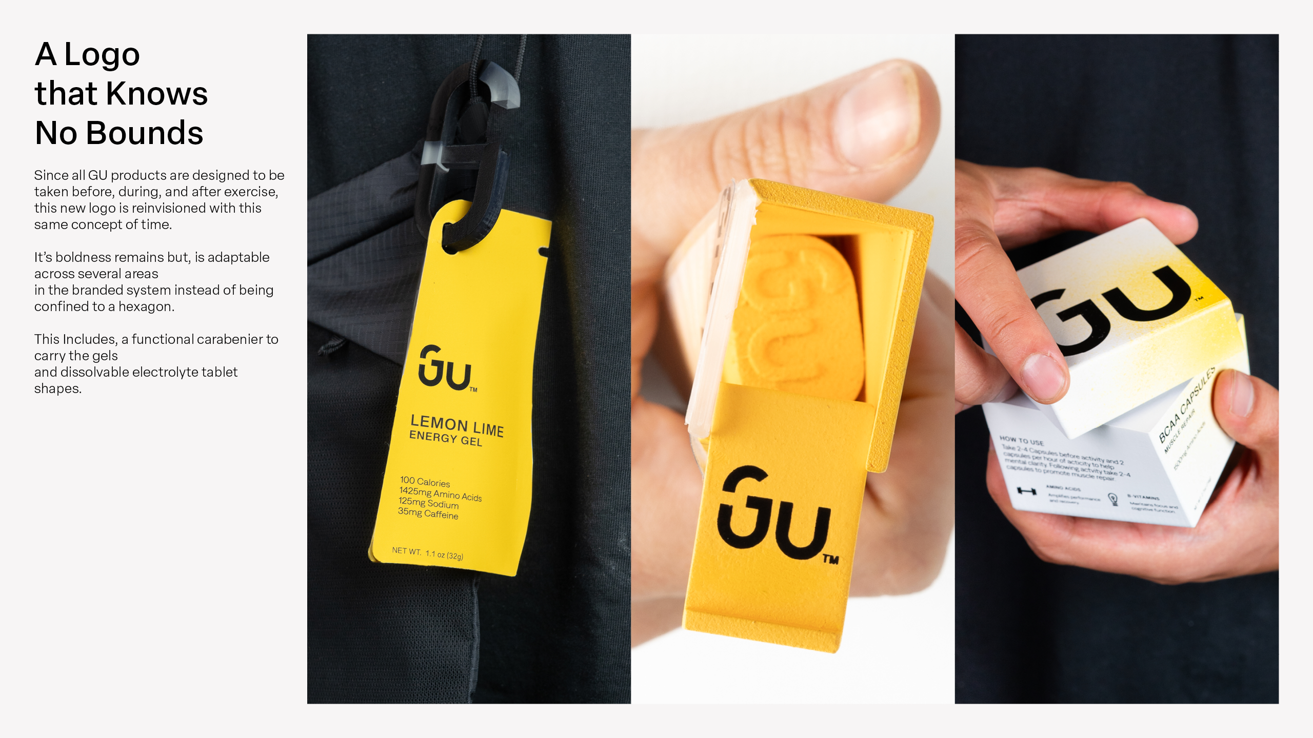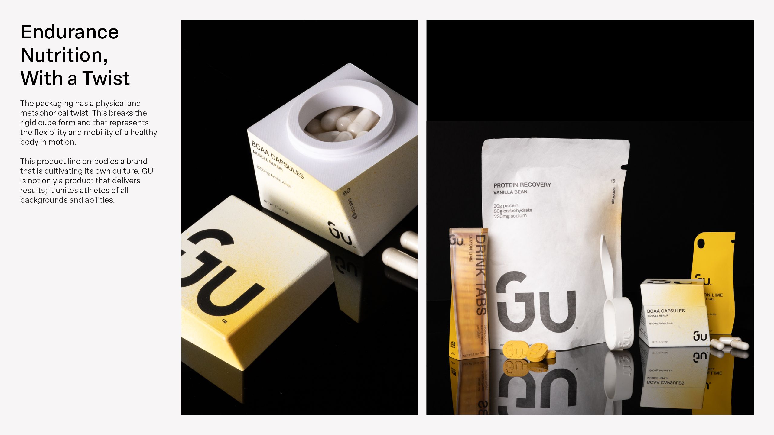 Gu Energy Labs develops sports nutrition for endurance athletes. Although they were the first to market, their current identity and packaging has caused them to blend-in with the rest of the market. These products work and enable athletes to conquer unimaginable feats but they are only halfway there. Inspired by activewear fashion and brands that have created a culture of its own, the new Gu identity embodies the aspirations and outstanding abilities of its team, their customers.