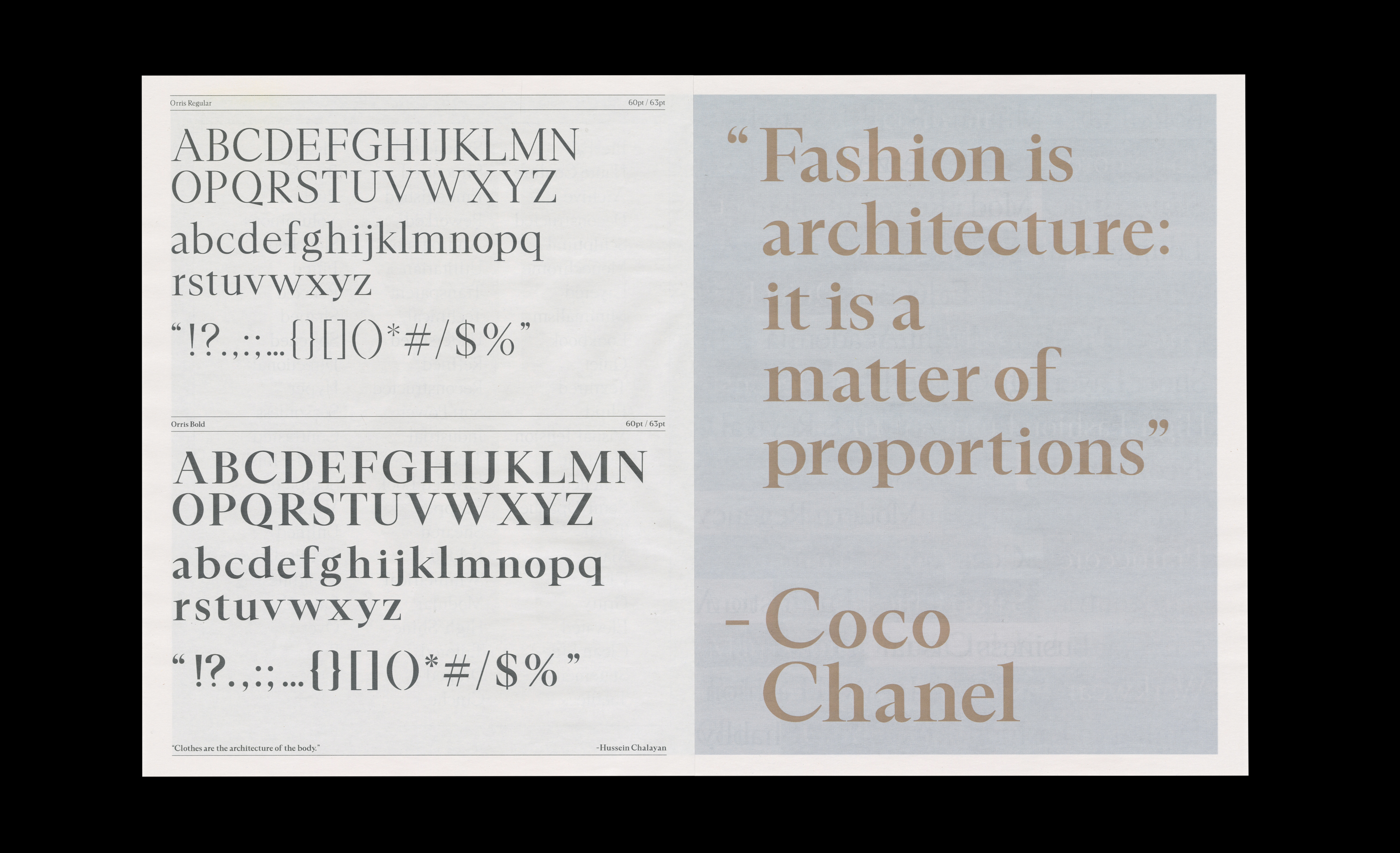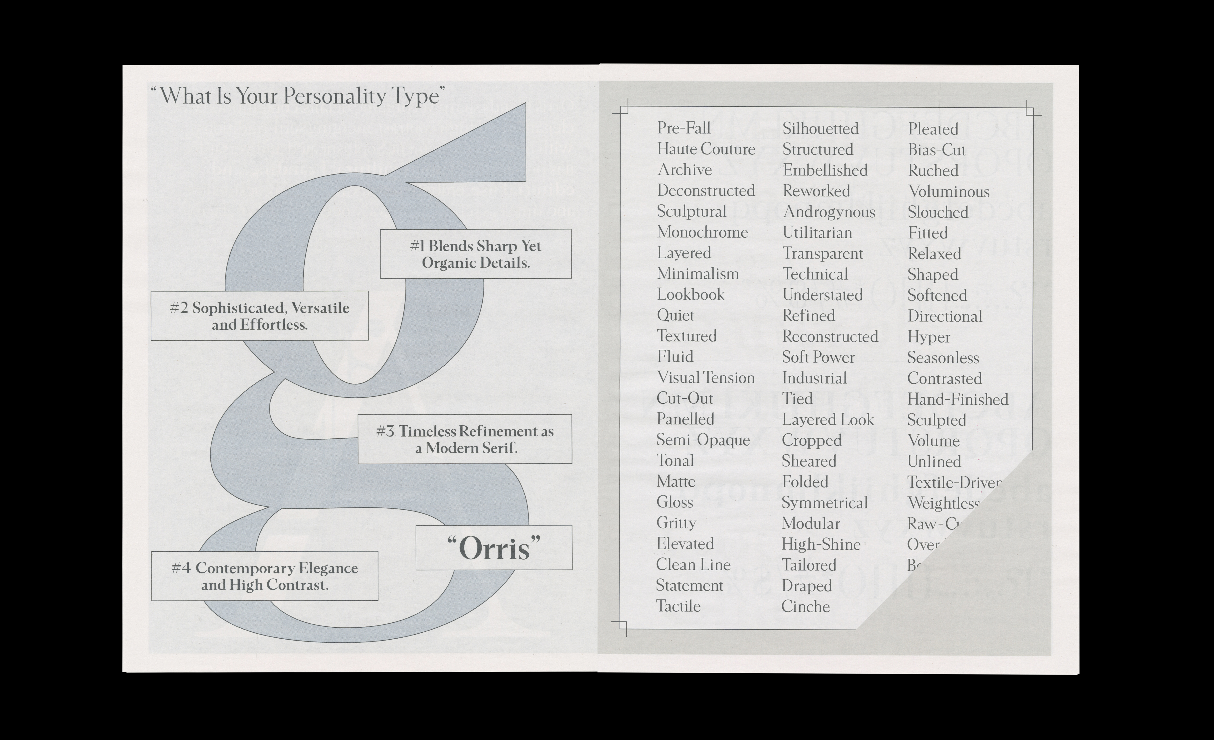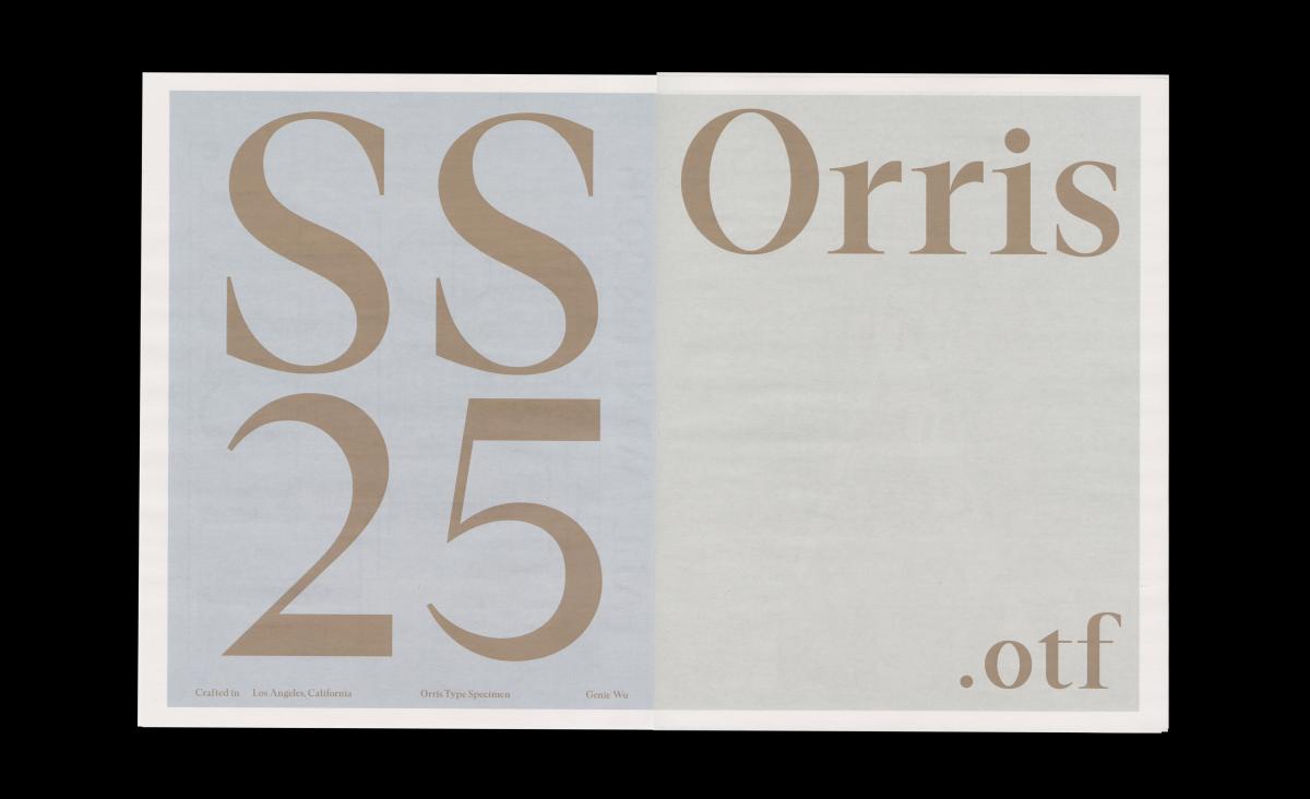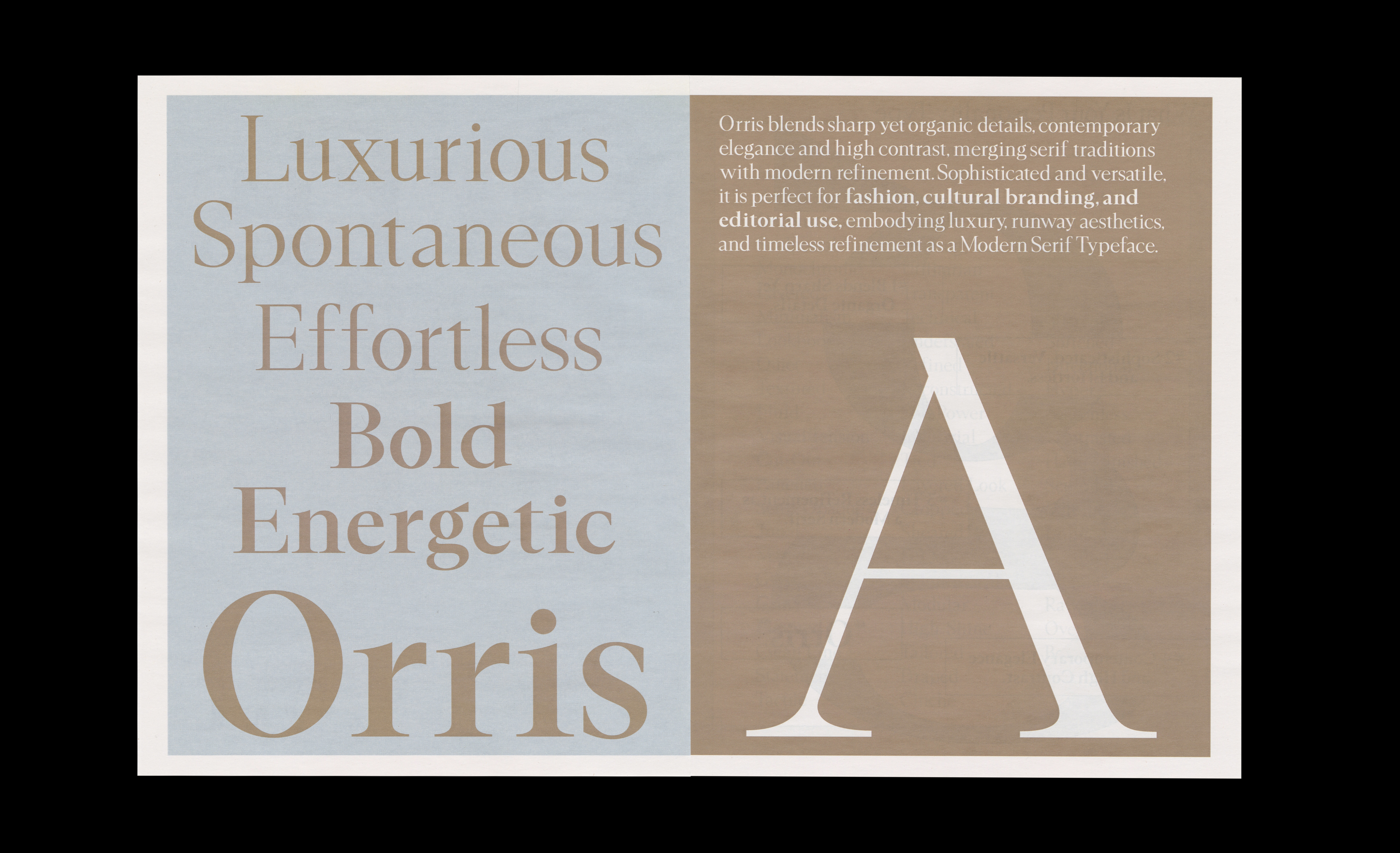 Orris blends sharp yet organic details, contemporary elegance, and high contrast, merging serif traditions with modern refinement. Sophisticated and versatile, it is perfect for fashion, cultural branding, and editorial use, embodying luxury, runway aesthetics, and timeless refinement as a Modern Serif Typeface.