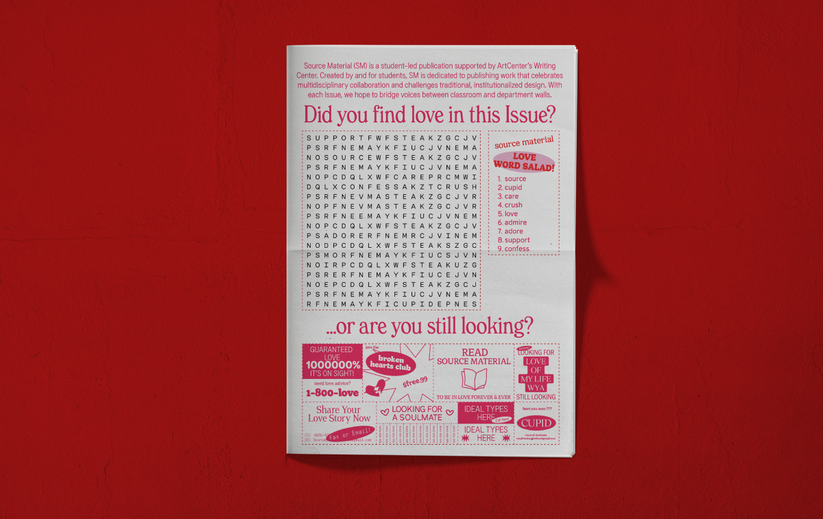 Source Material is a student-led publication supported by ArtCenter's Writing Center. Created by and for students, SM is dedicated to publishing work that celebrates multi-disciplinarv collaboration and challenges traditional, institutionalized design.