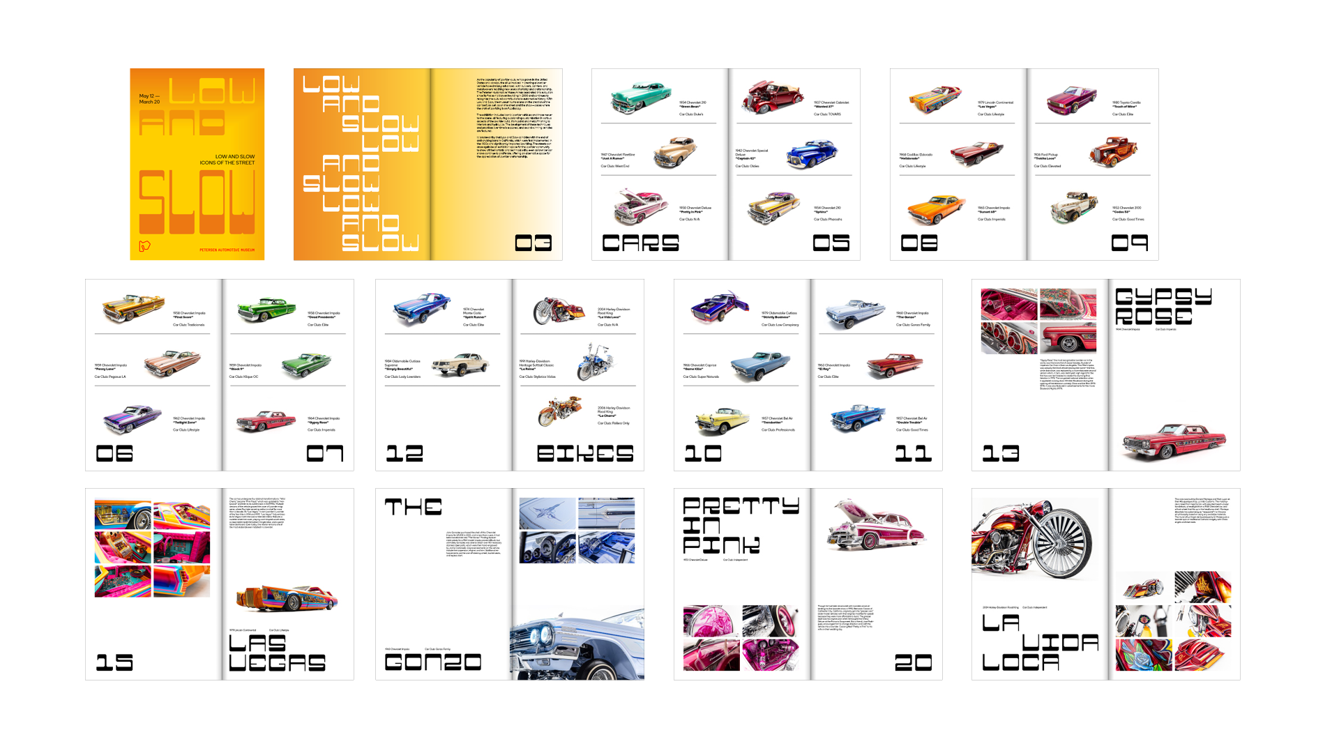 The core concept of the design focuses on movement and transformation, inspired by the hydraulic systems that allow lowriders to lift and drop with precision. This is reflected in the custom typeface, which extends vertically to mimic the up-and-down motion of the cars. The typeface also draws inspiration from the intricate pinstriping art commonly found on lowriders.