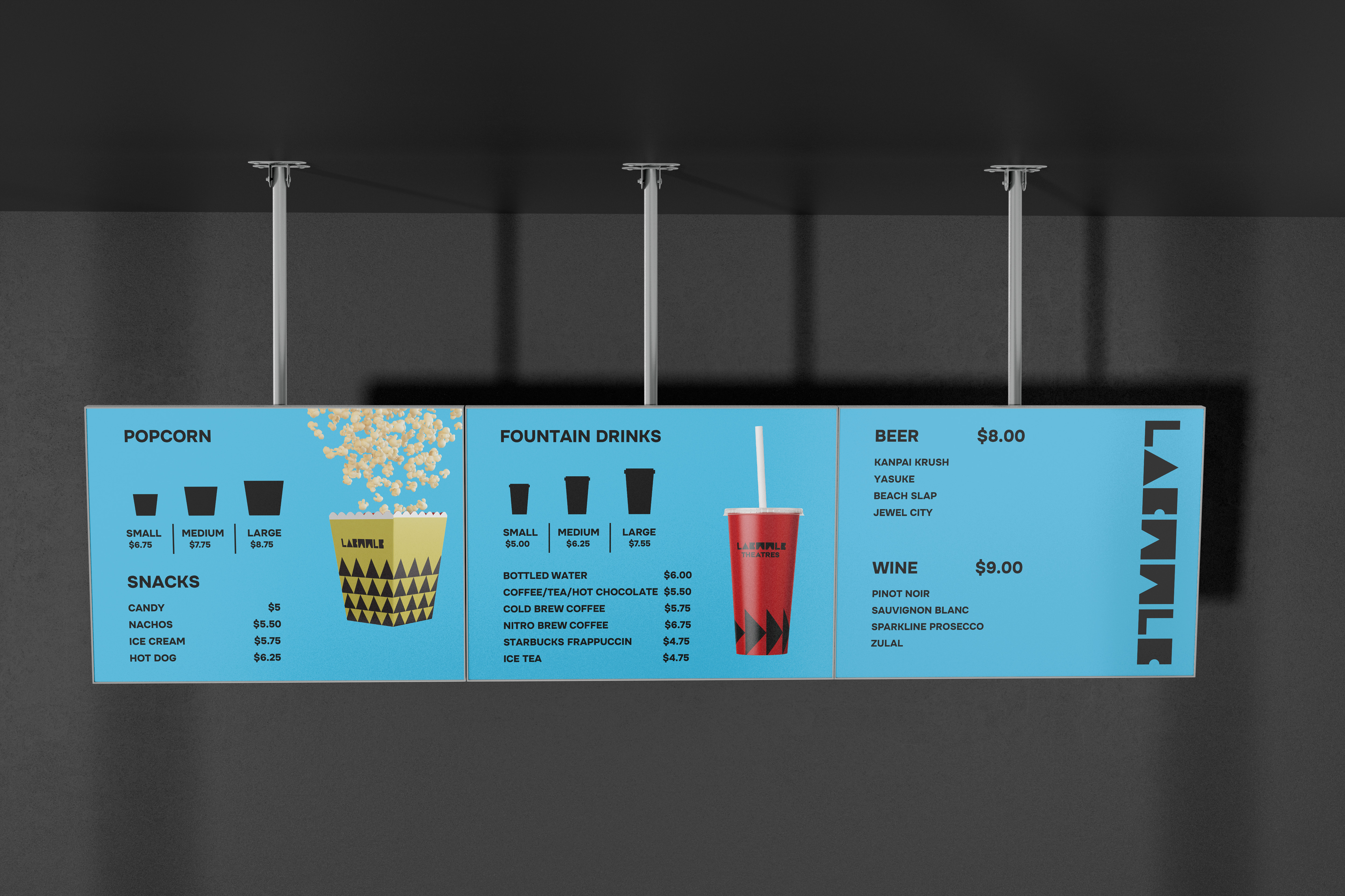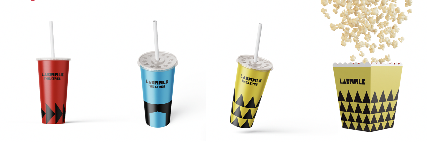 I redesigned Laemmle's hanging menu, popcorn and beverage packaging to align with the rebranding identity. Different drink sizes are represented by distinct colors, and the menu’s blue hue was updated to a lighter sky blue for consistency. Additionally, a souvenir movie ticket was introduced as a collectible for audiences.