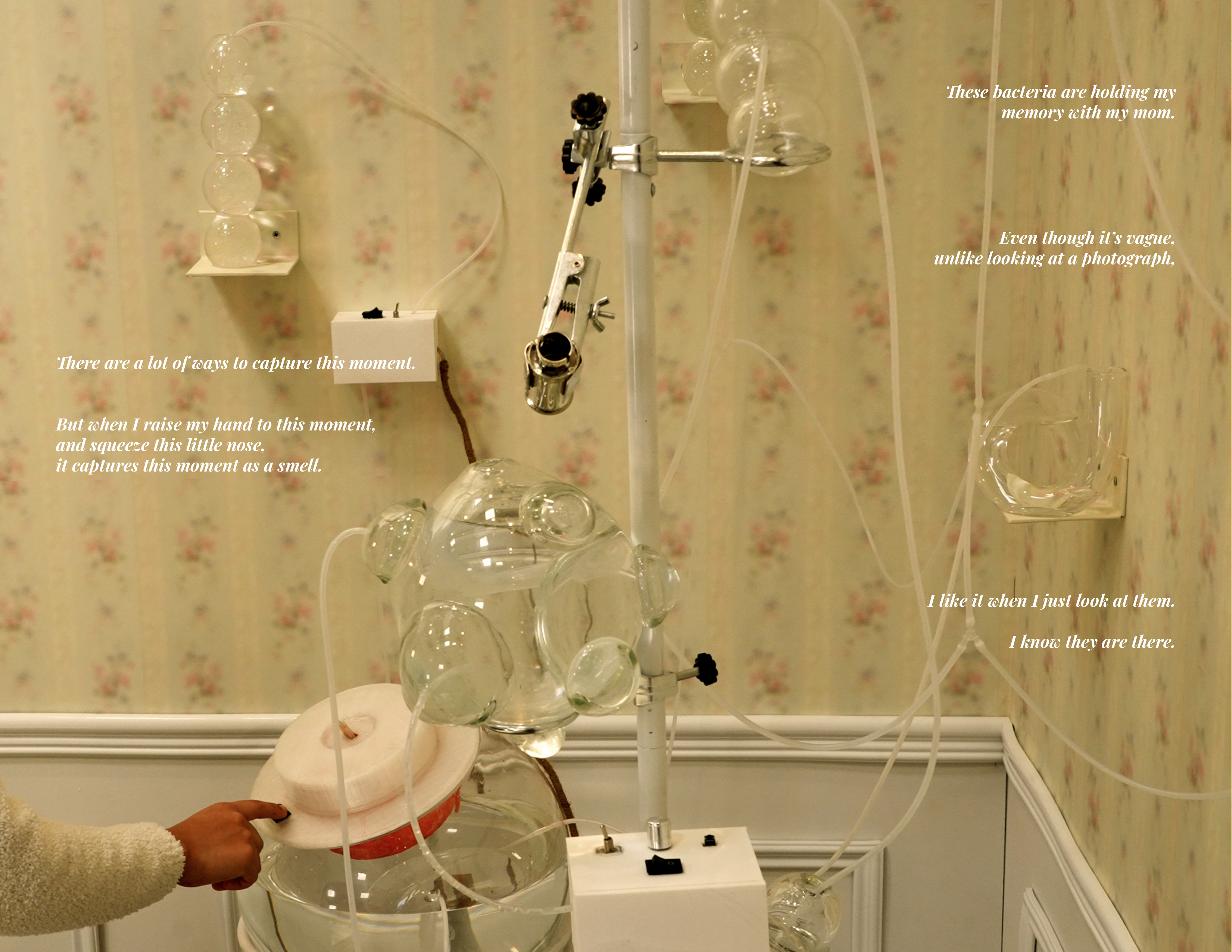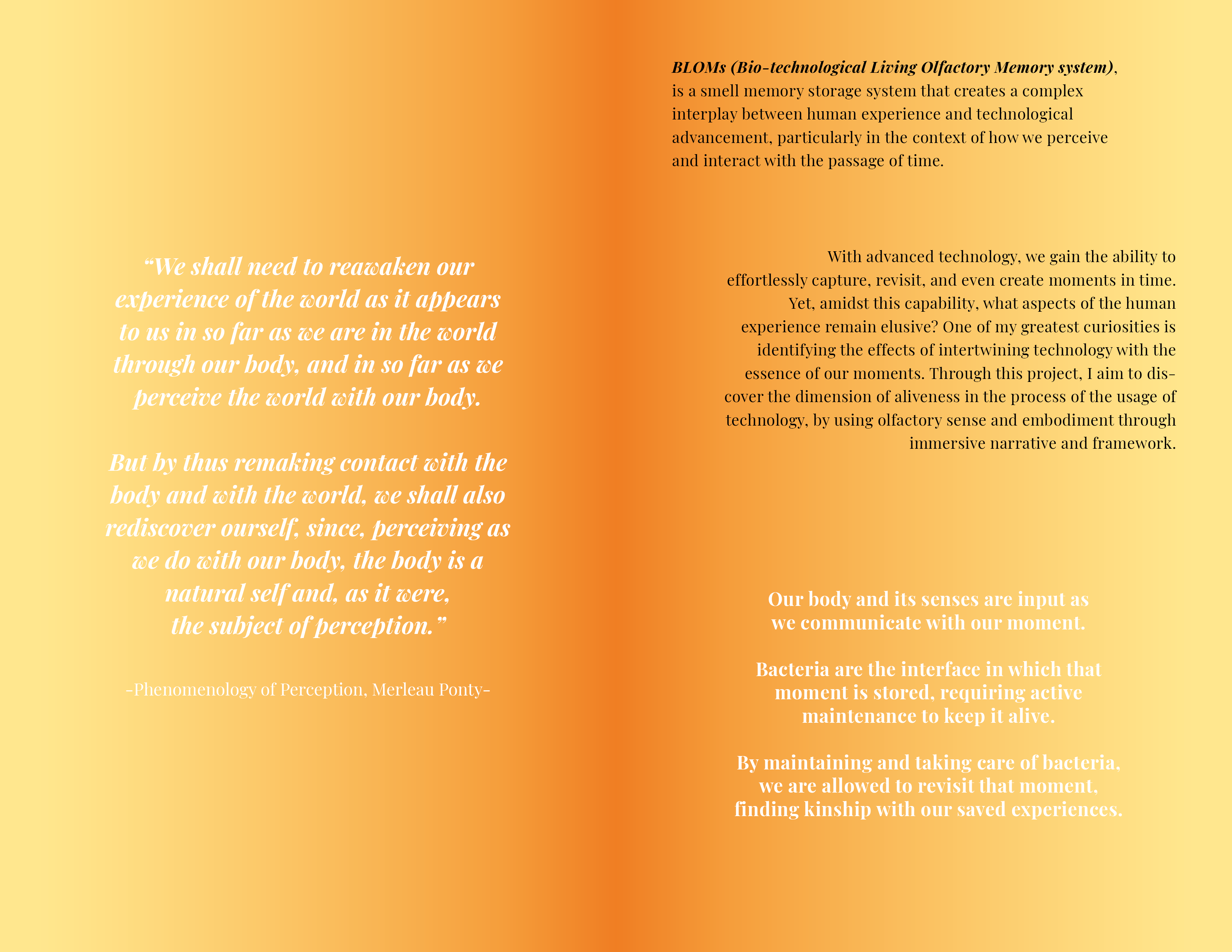 BLOMs (Bio-technological Living Olfactory Memory system), is a smell memory storage system that creates a complex interplay between human experience and technological advancement, particularly in the context of how we perceive and interact with the passage of time.