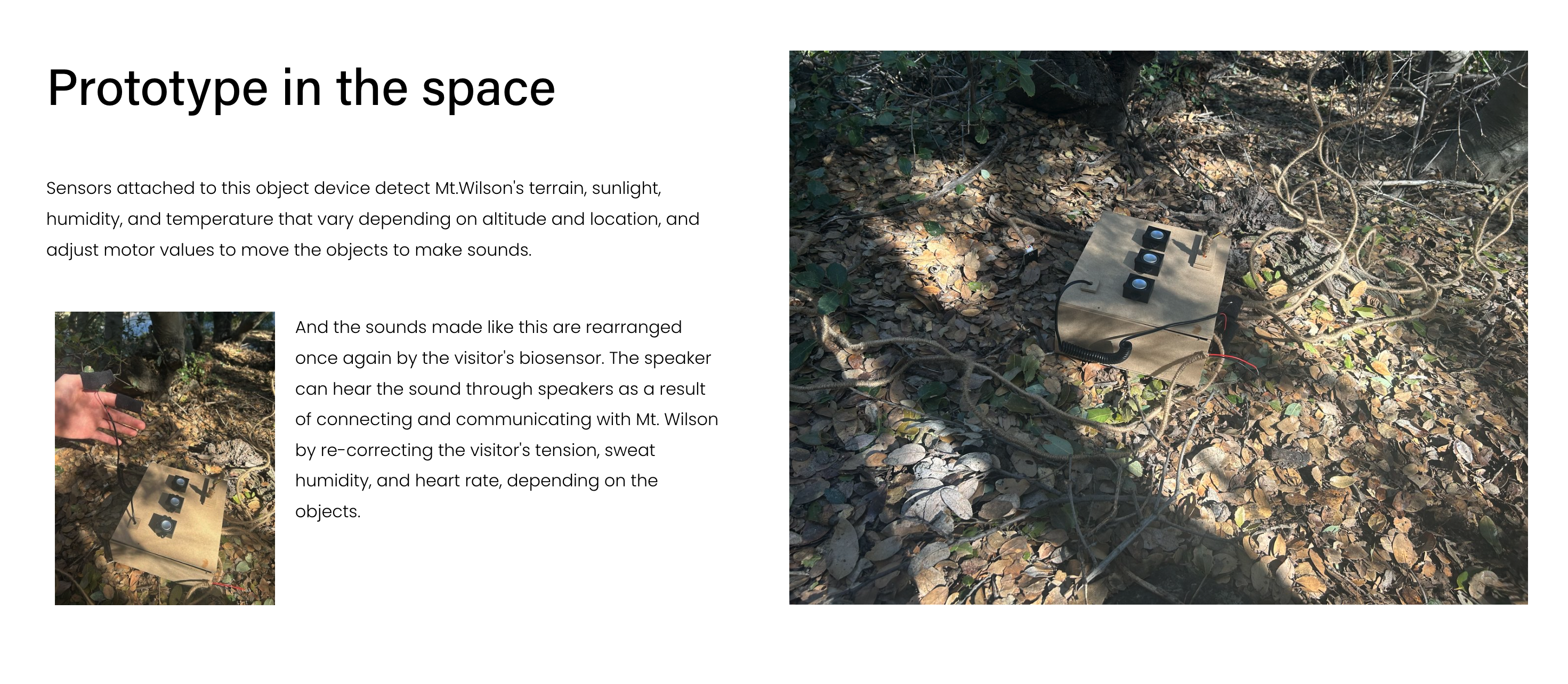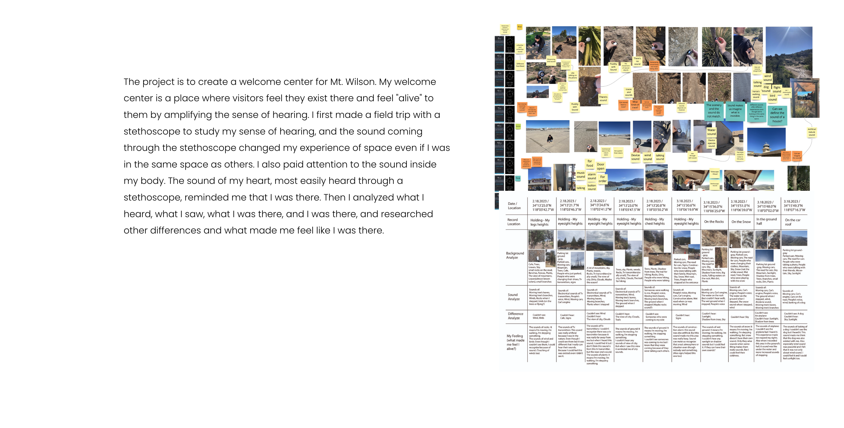 The project is to create a welcome center for Mt. Wilson. My welcome center is a place where visitors feel they exist there and feel "alive" to them by amplifying their sense of hearing.
