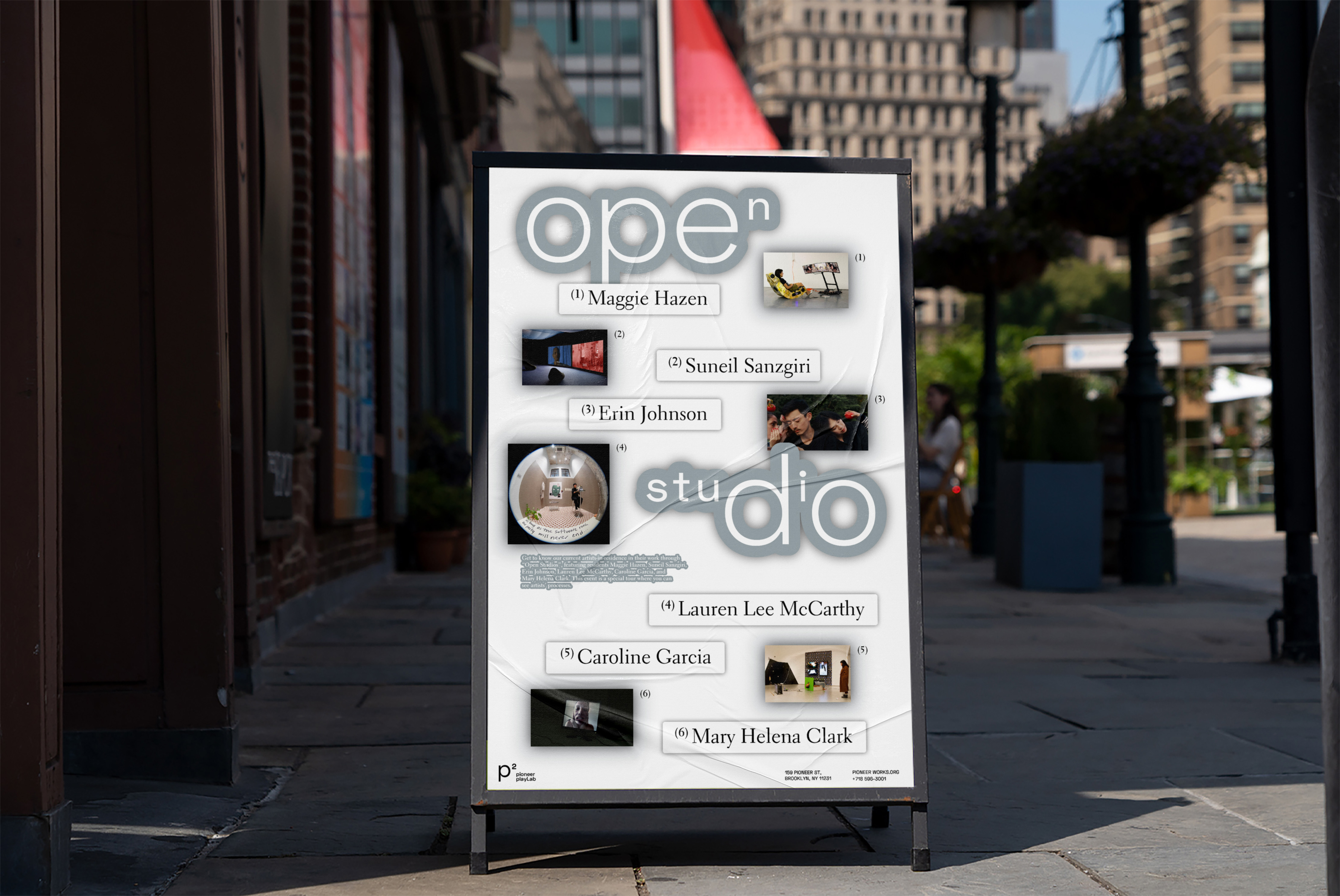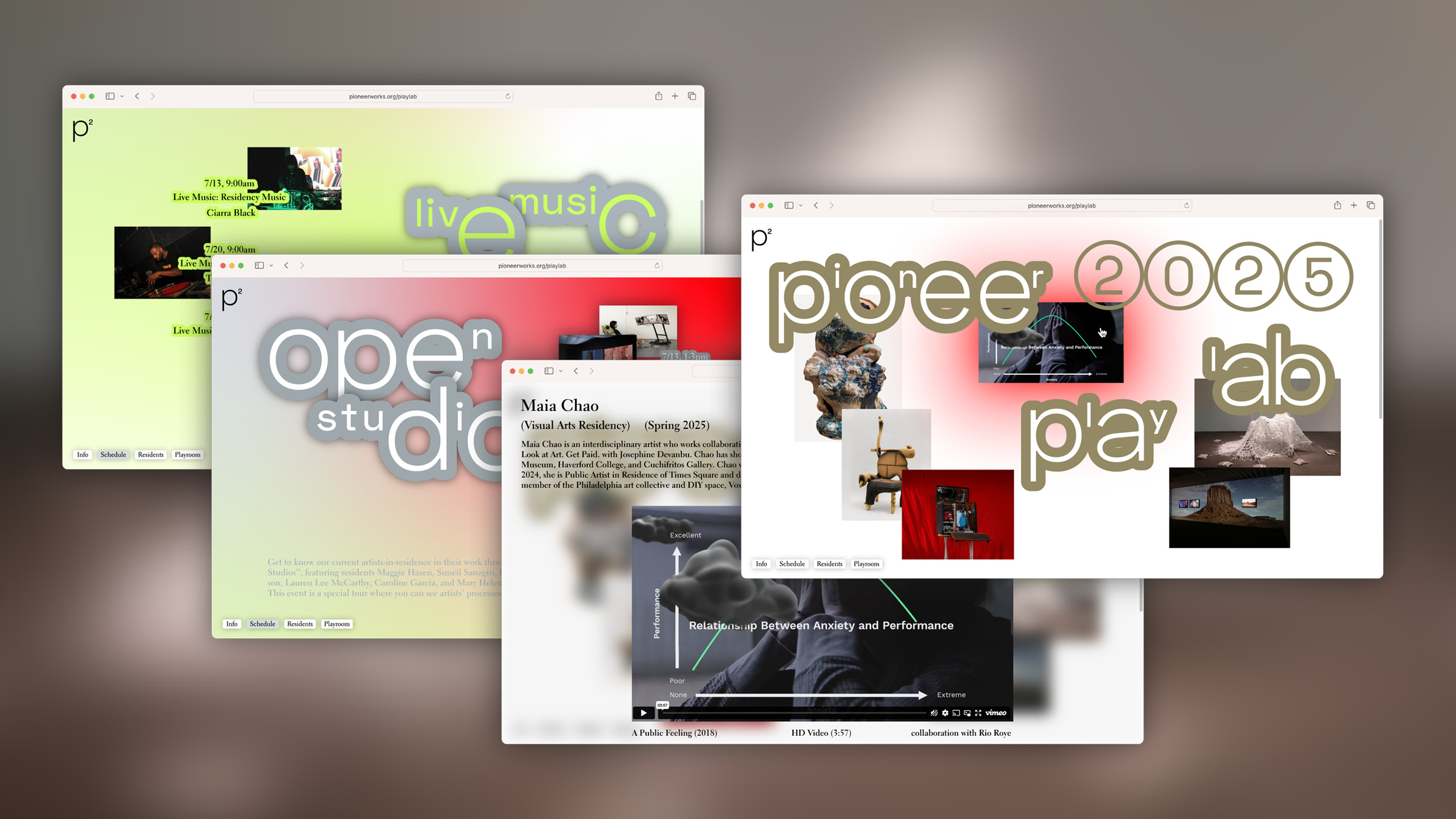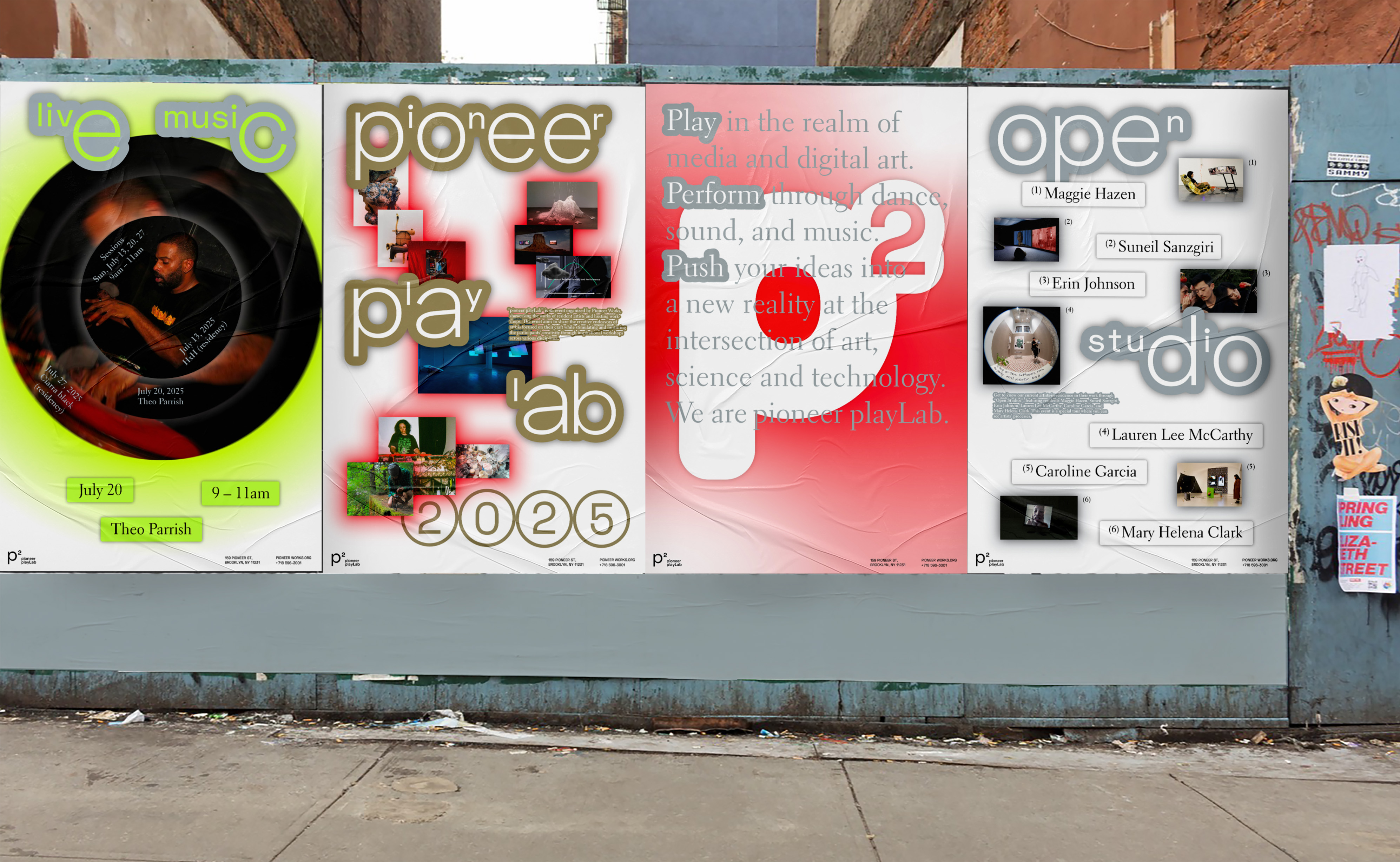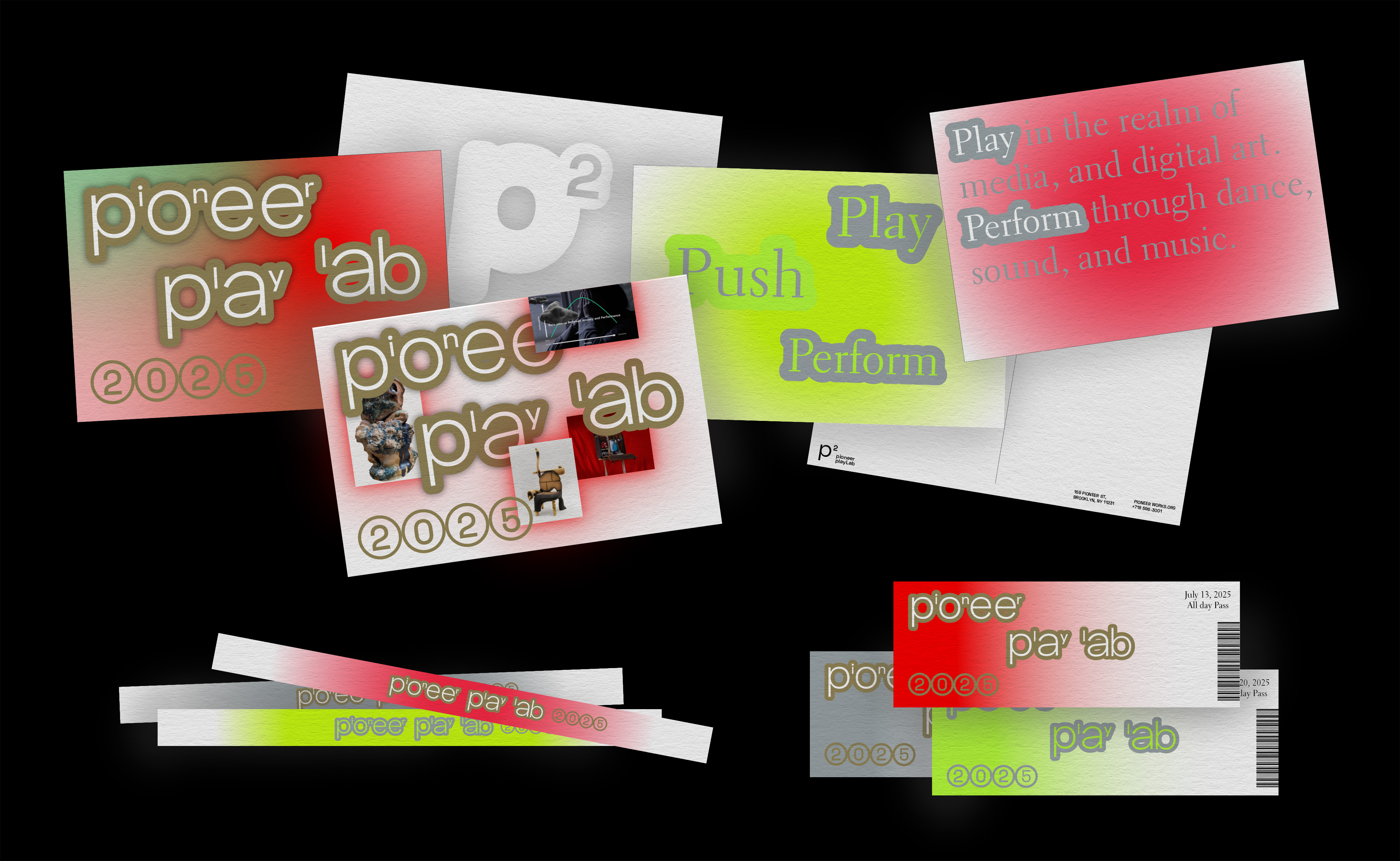 Pioneer PlayLab is an annual event at Pioneer Works. It consists of an artist symposium, an exhibition of residency works, and interactive experiences. The goal of the event is to share Pioneer Works' spirit and goals with everyone and give artists opportunities to showcase their works. The logo mark, the "p" squared stands for Pioneer Play Lab, and it expresses a space where pioneers from various fields gather to double their possibilities and curiosity.