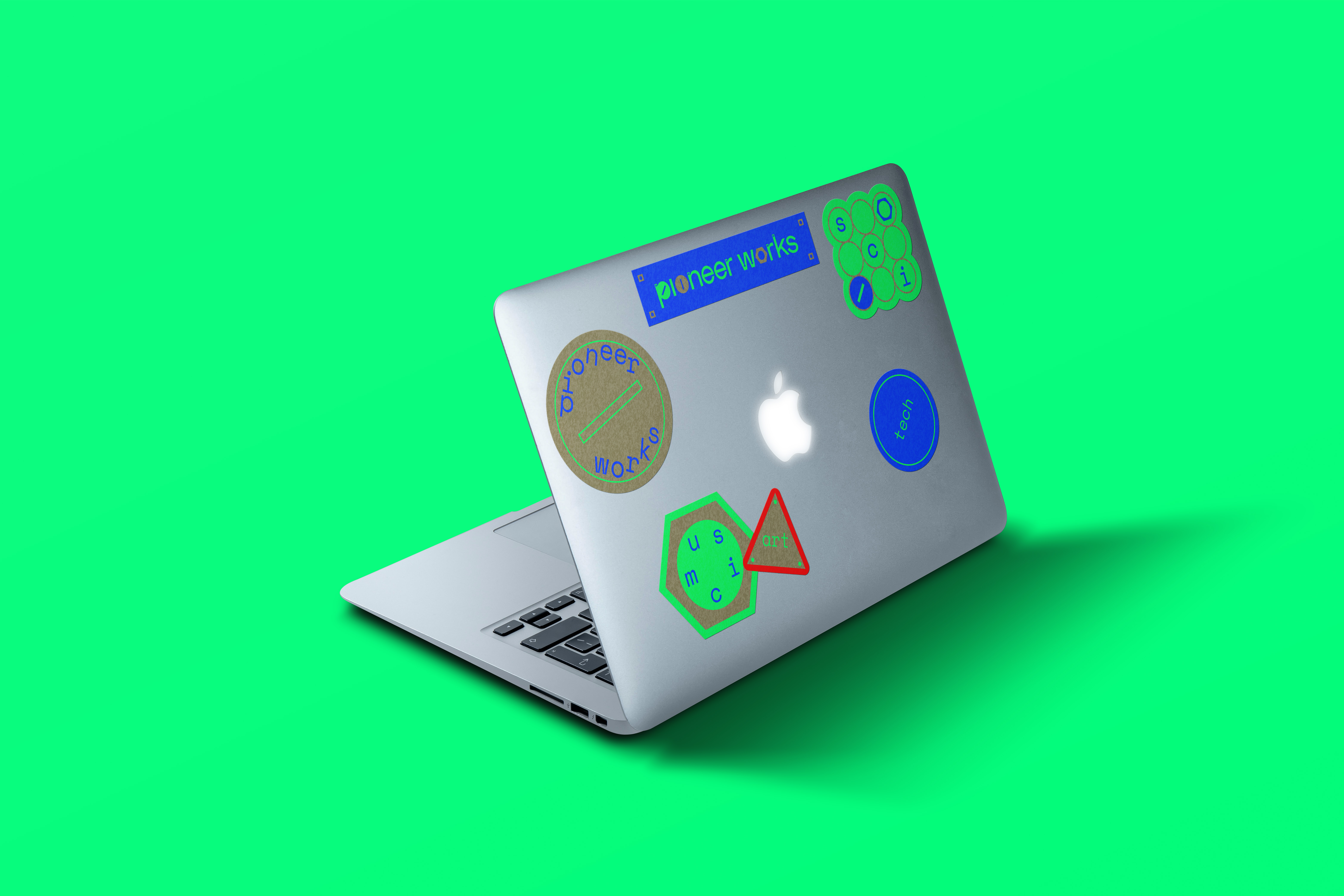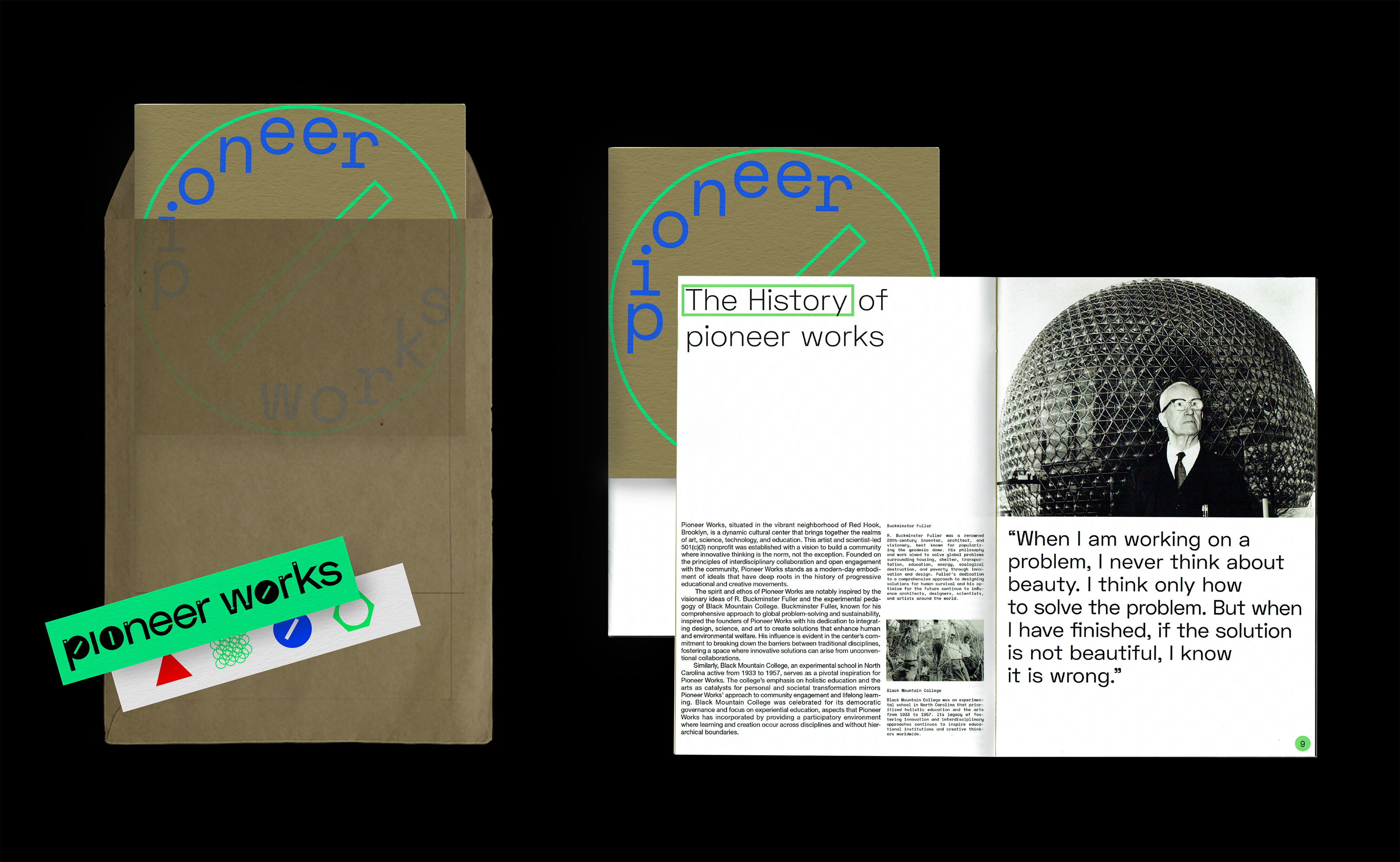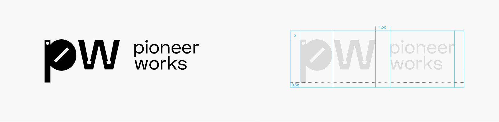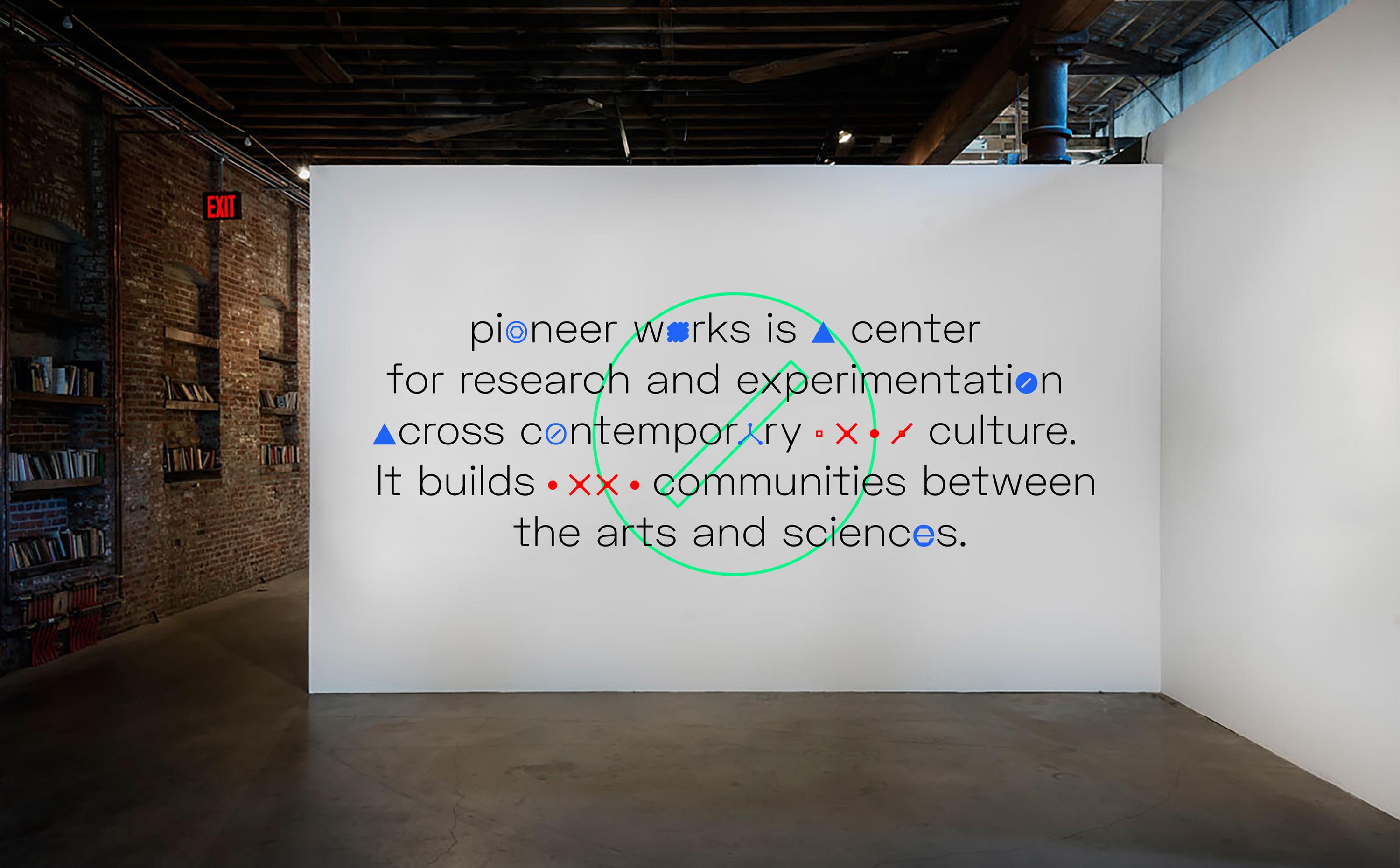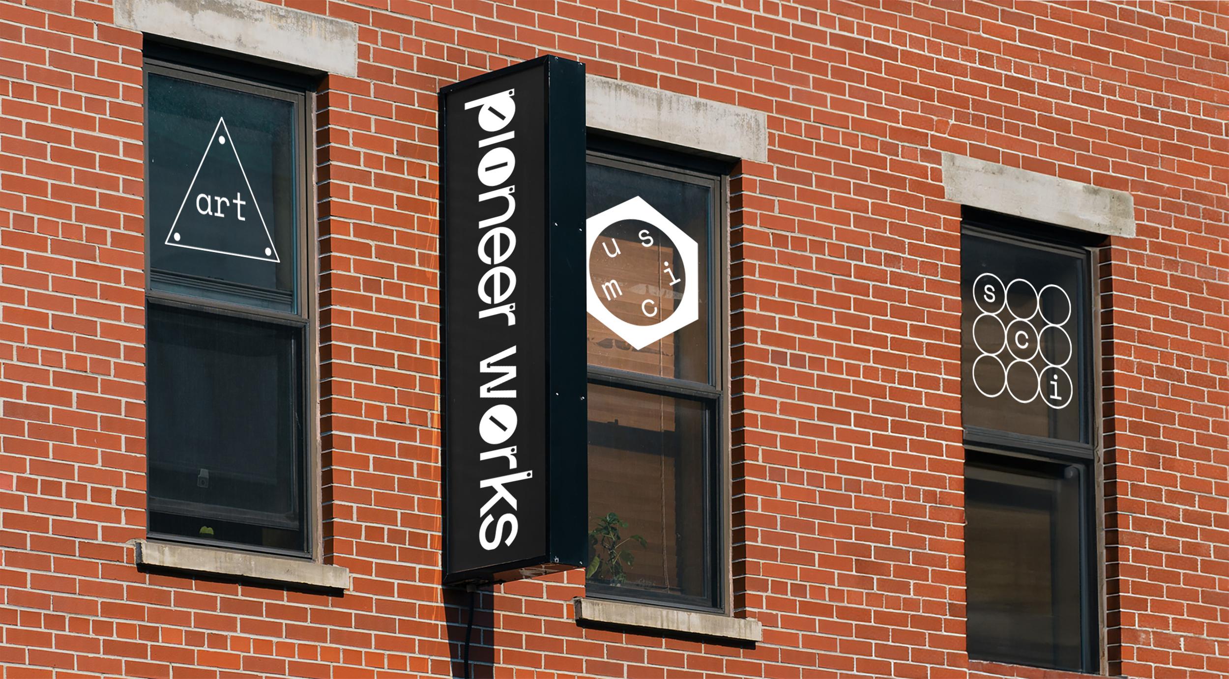 Pioneer Works is a cultural space in New York where artists and scientists come together to create new ideas. It aims to foster artists at the intersection of art, music, science, and technology. The overall brand identity is inspired by assembling movement between screw and bolt. The logo metaphorically represents how different areas of experts communicate and interact, emphasizing the pioneering spirit and radical mindset of artists.
