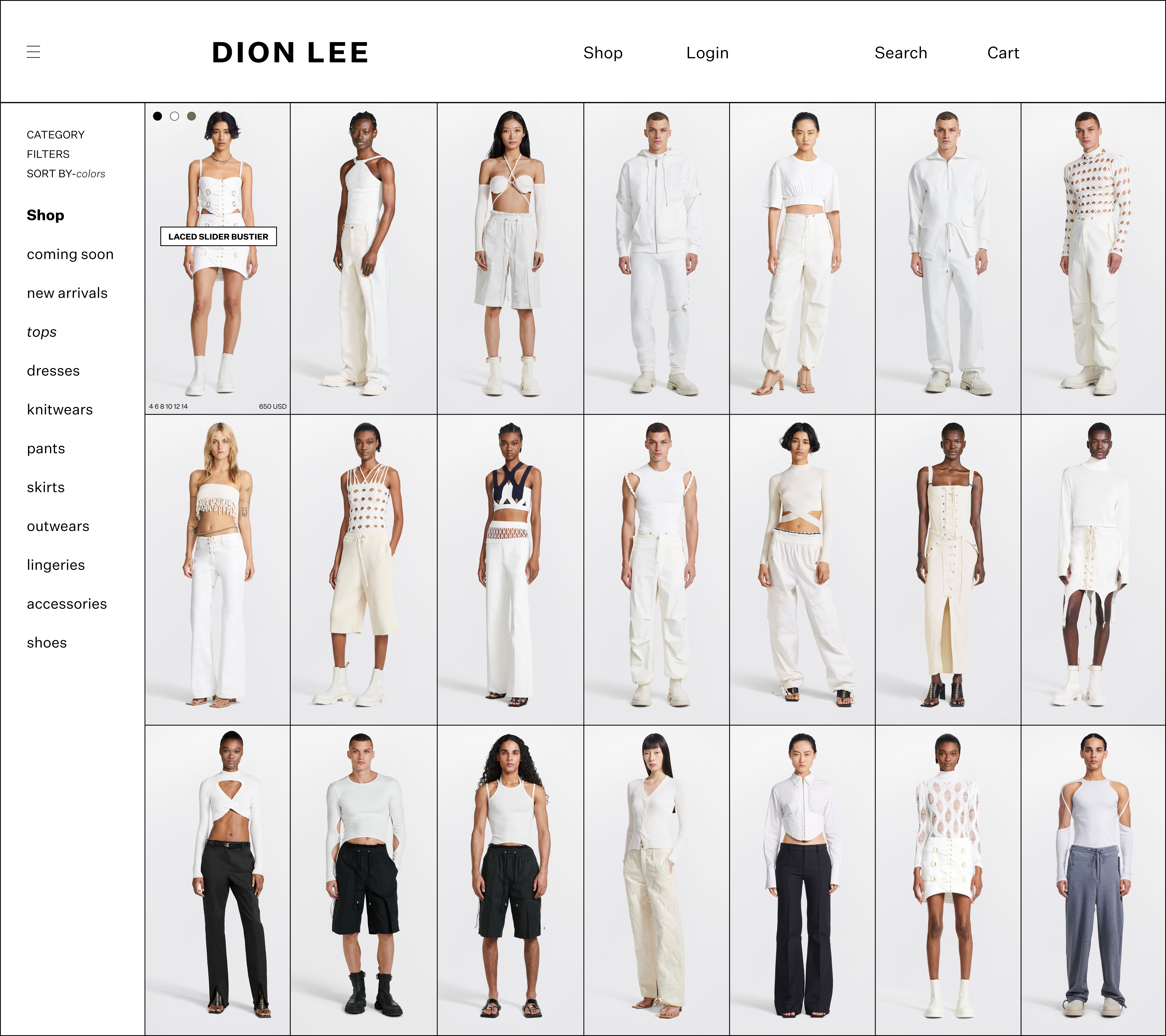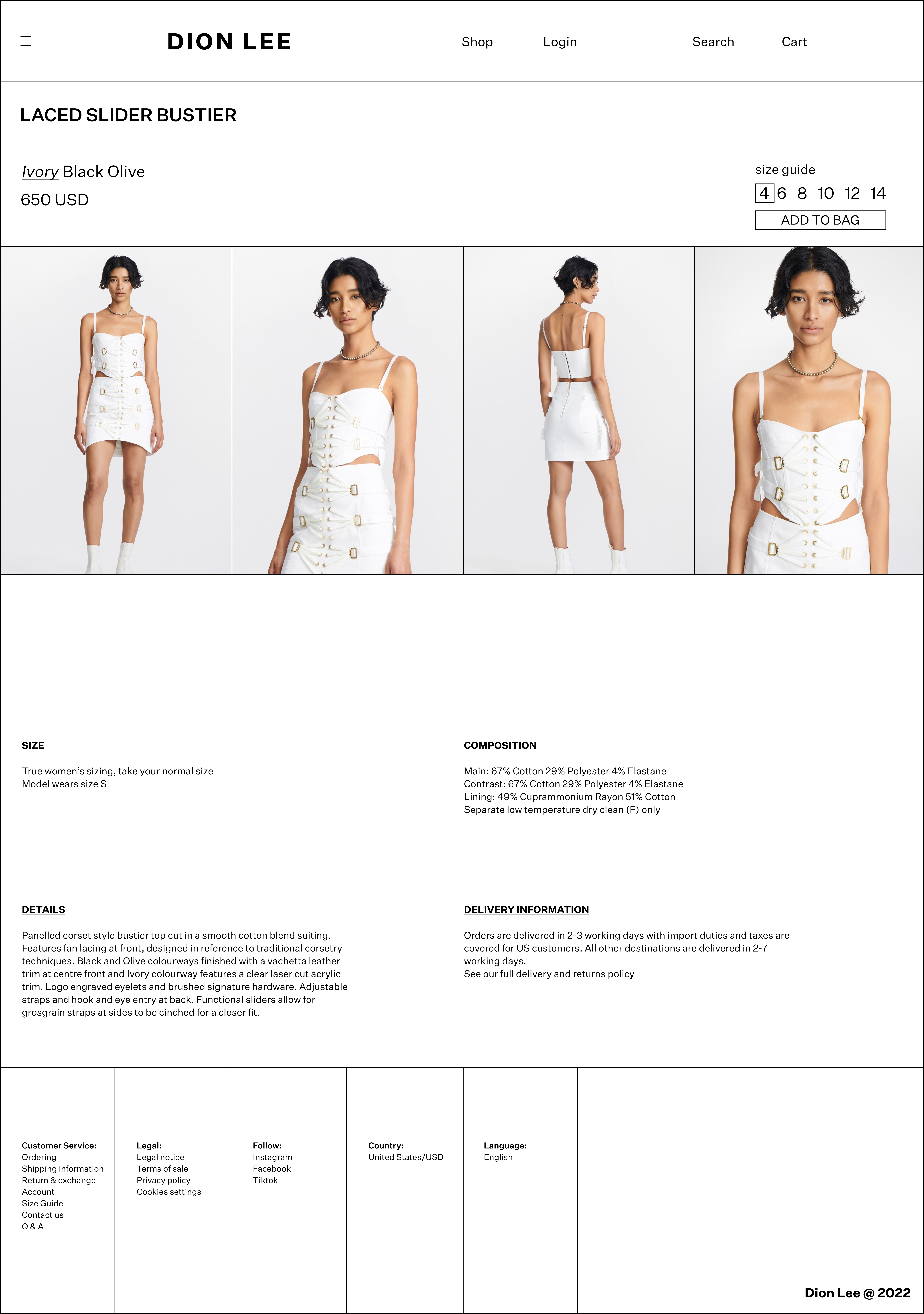 Graduates Select DepartmentBrand Design & StrategyCreative DirectionEntertainment DesignFilmFine ArtFurniture, Lighting and FixturesGraduate ArtGraduate FilmGraduate Graphic DesignGraduate Interaction DesignGraduate Spatial Experience DesignGraphic DesignIllustrationIndustrial DesignInteraction DesignMedia Design PracticesPhotography and ImagingProduct DesignSpatial Experience DesignTransportation DesignTransportation Systems and Design Back to Projects Han Wang BFA in Graphic Design — Graphic Design Course: GVXD-203 Visual Interaction Design 1: Intro to UI Dion Lee Website Redesign A redesign of the fashion brand Dion Lee's website to highlight their unisex item and fancy style with grid visuals and line elements. Image Image Image Image Image Image