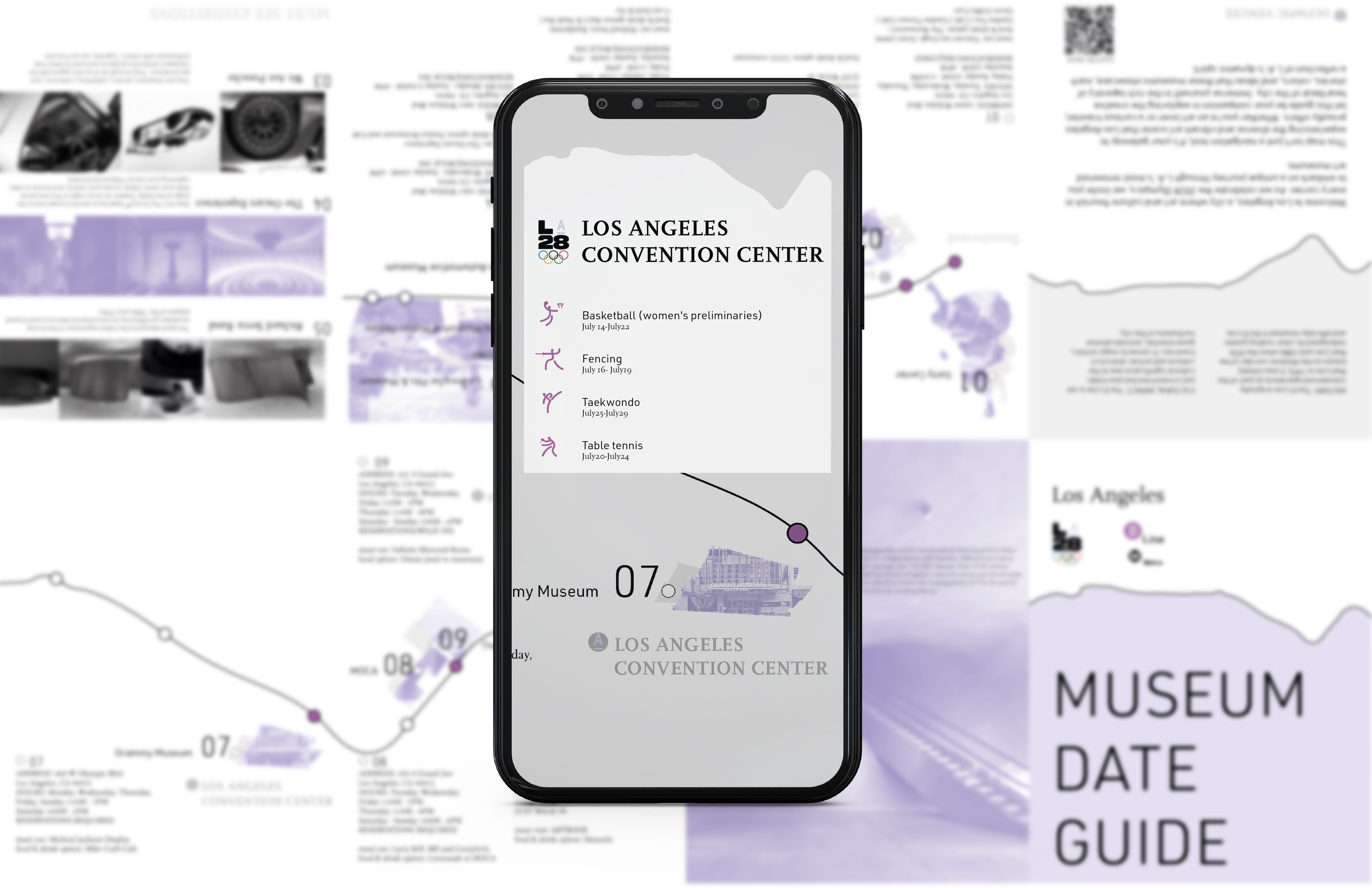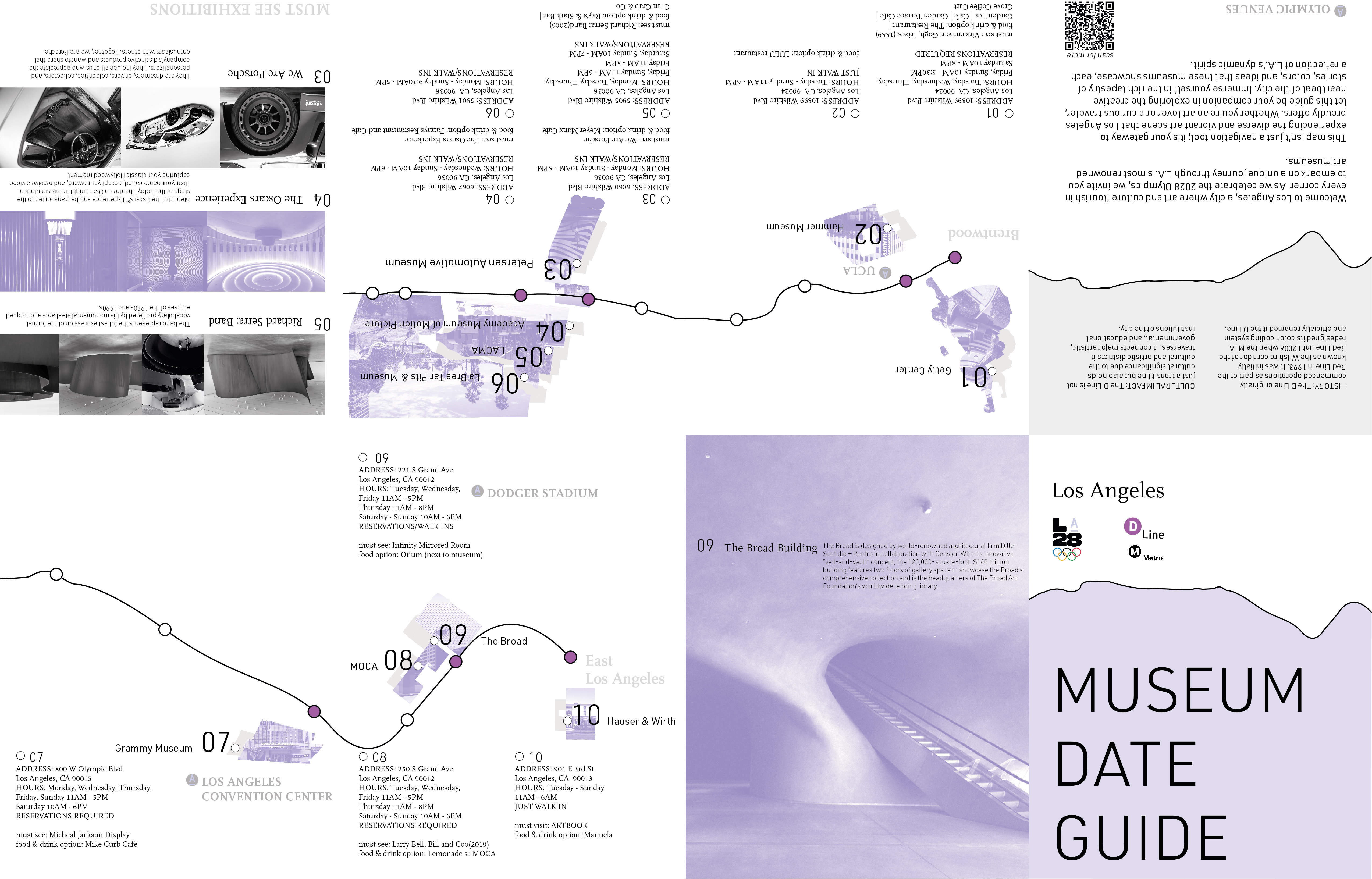 Graduates Select DepartmentBrand Design & StrategyCreative DirectionEntertainment DesignFilmFine ArtFurniture, Lighting and FixturesGraduate ArtGraduate FilmGraduate Graphic DesignGraduate Interaction DesignGraduate Spatial Experience DesignGraphic DesignIllustrationIndustrial DesignInteraction DesignMedia Design PracticesPhotography and ImagingProduct DesignSpatial Experience DesignTransportation DesignTransportation Systems and Design Back to Projects Han Wang BFA in Graphic Design — Graphic Design Course: GPRT-305 Information Design Faculty: Allison Goodman Metro museum date guide for LA28 A foldable map for the metro purple line that provides all tourist here for Olympic 2028 can fulfill their life with Los Angeles local art other than full of sport competition. Image Image Image Image Image