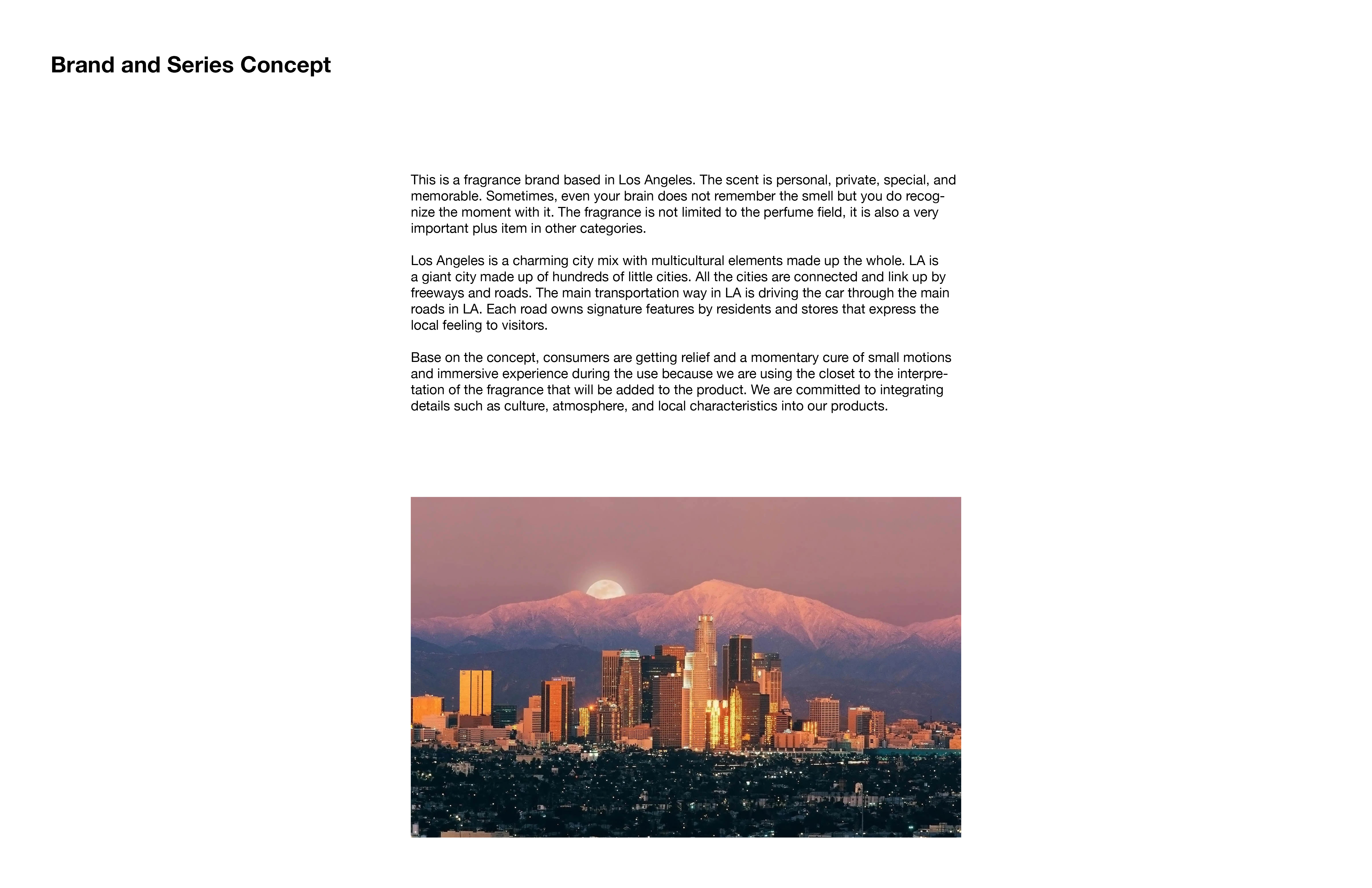 A personal home fragrance brand that is pulling all the scents from the city where I live Los Angeles. Using smell to travel around LA in the house and bring back all kinds of city memories.