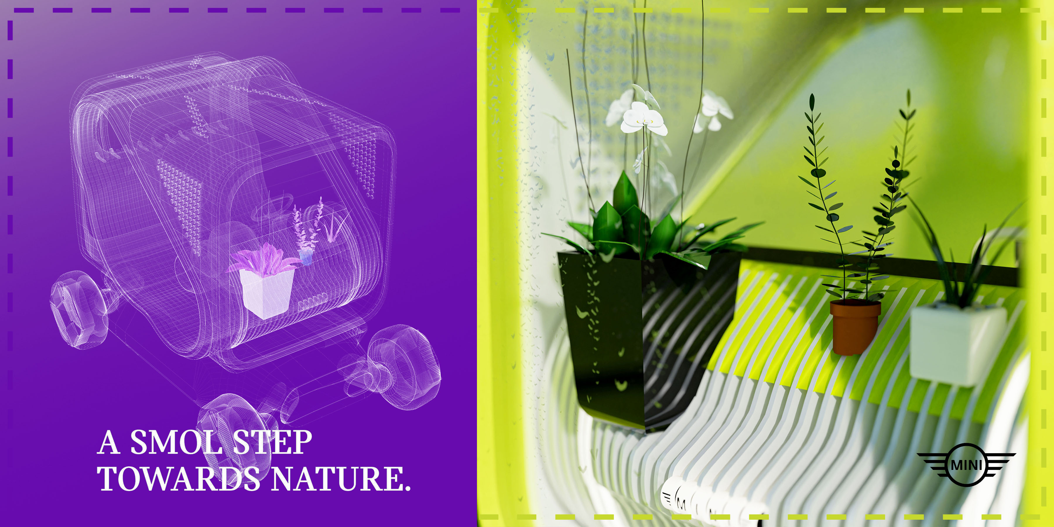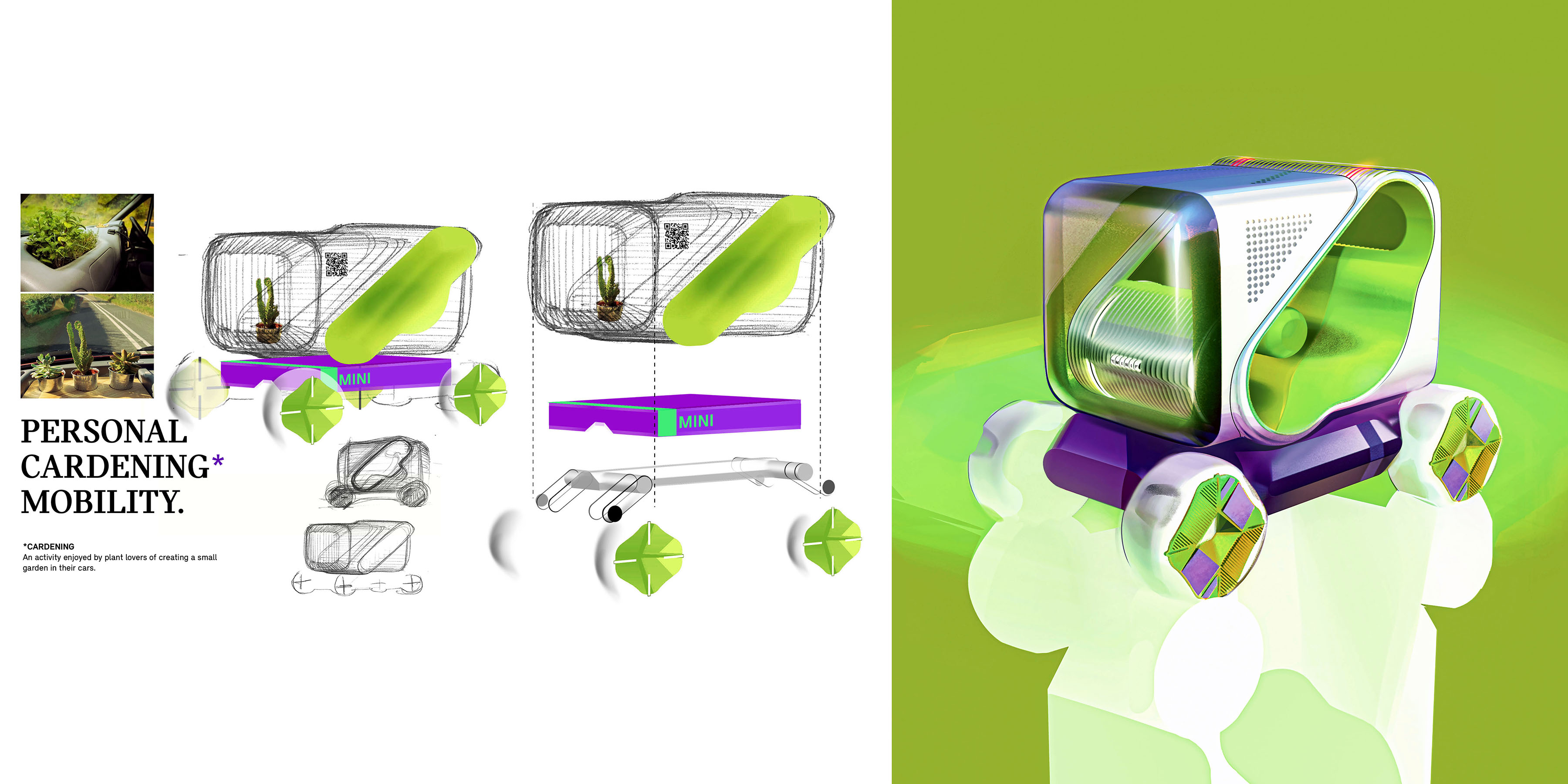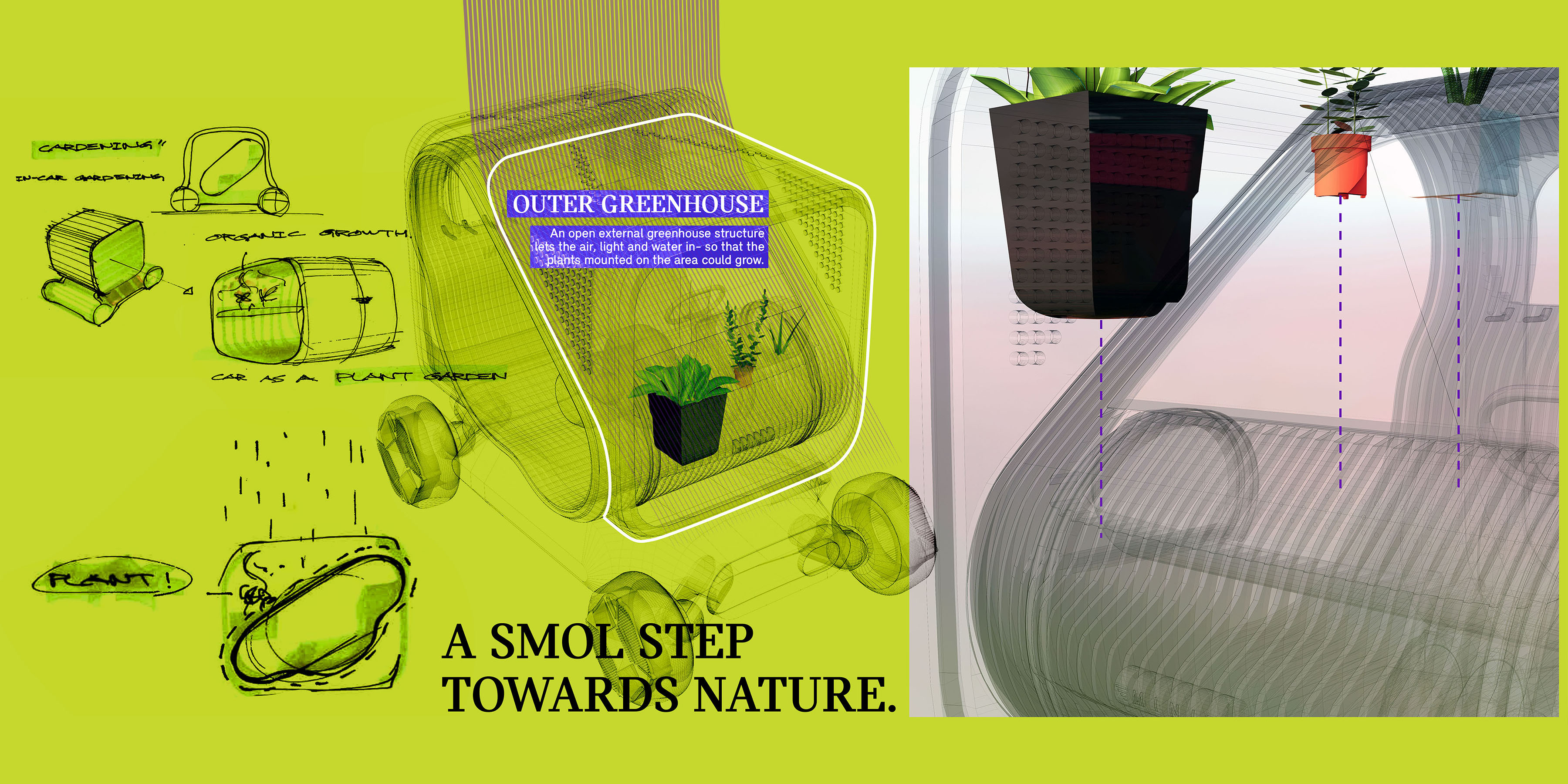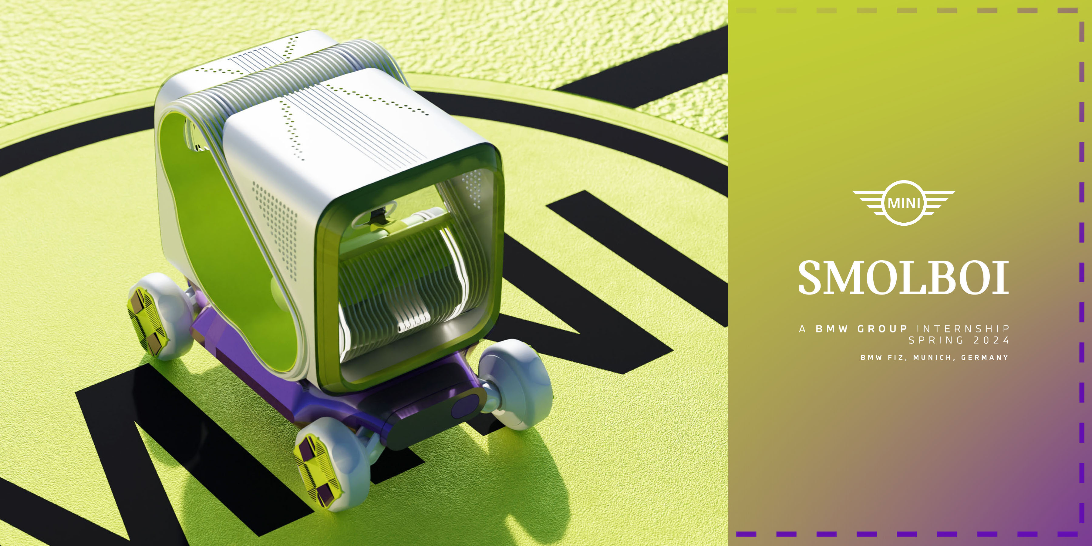 From January to May 2024, I was fortunate enough to be a part of the BMW design team as an exterior design intern at the headquarters studio in Munich, Germany. MINI Smolboi, a future urban mobility proposal for the MINI brand within the BMW Group, is a one-week sketch project about incorporating the emerging yet niche trend of in-car gardening into a vehicle with a city car footprint for urban use.