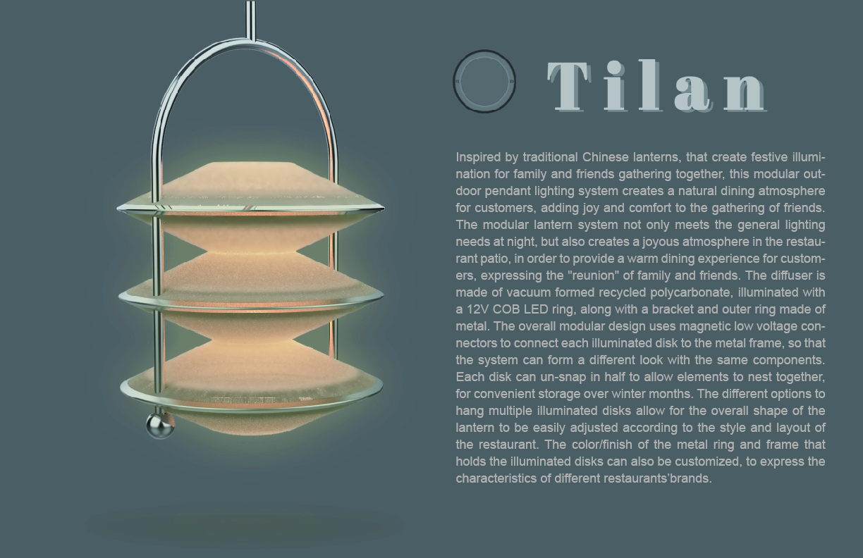The Tilan lamp is a multifunctional pendant light designed for restaurant exteriors. Through modular design, customers can get different display results. Inspired by the combination of Chinese lanterns and food boxes, it is a product with a strong cultural atmosphere. At the same time, the special structure facilitates disassembly and assembly. And the folding and storage function can meet the needs of most scenes.