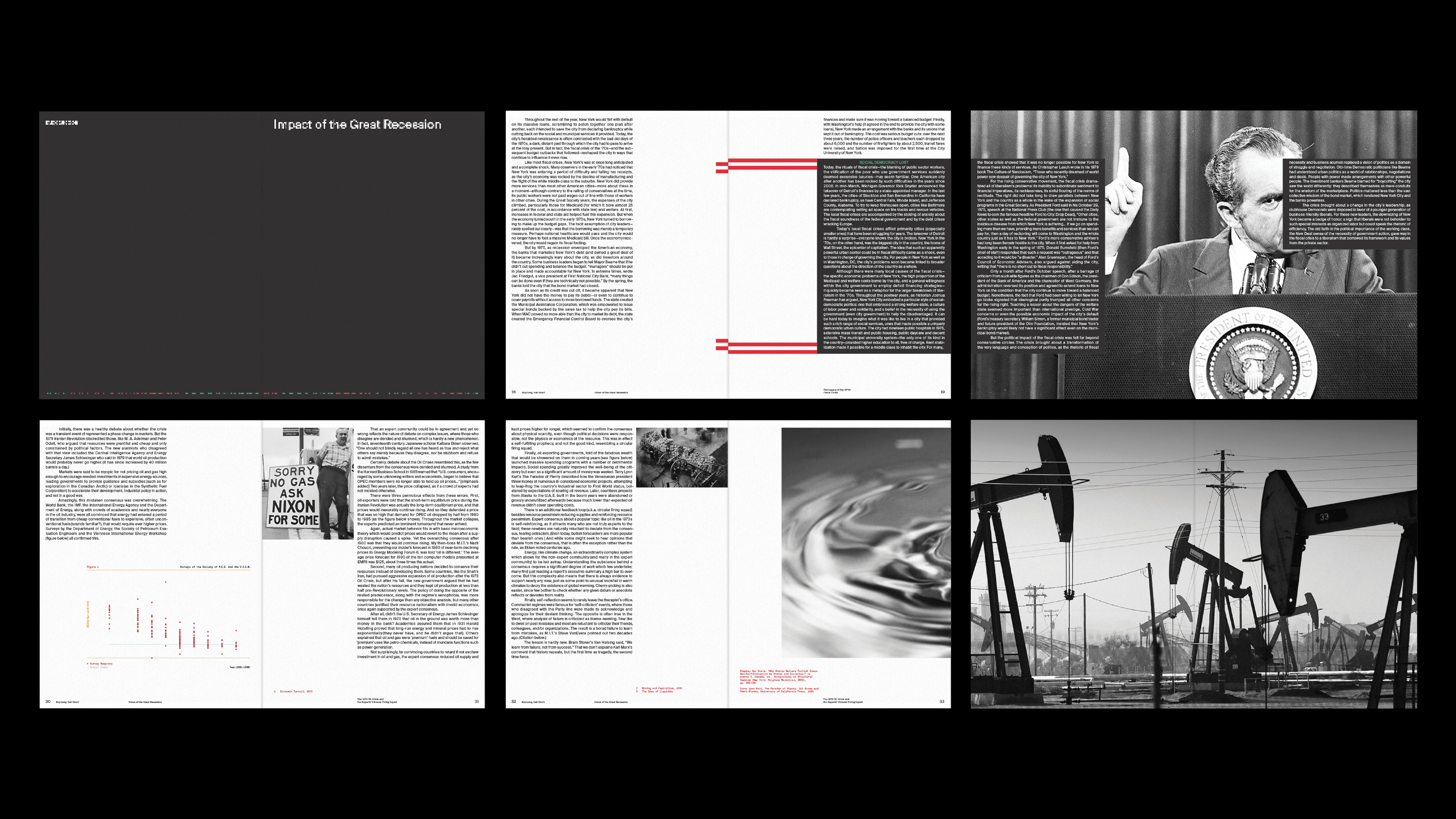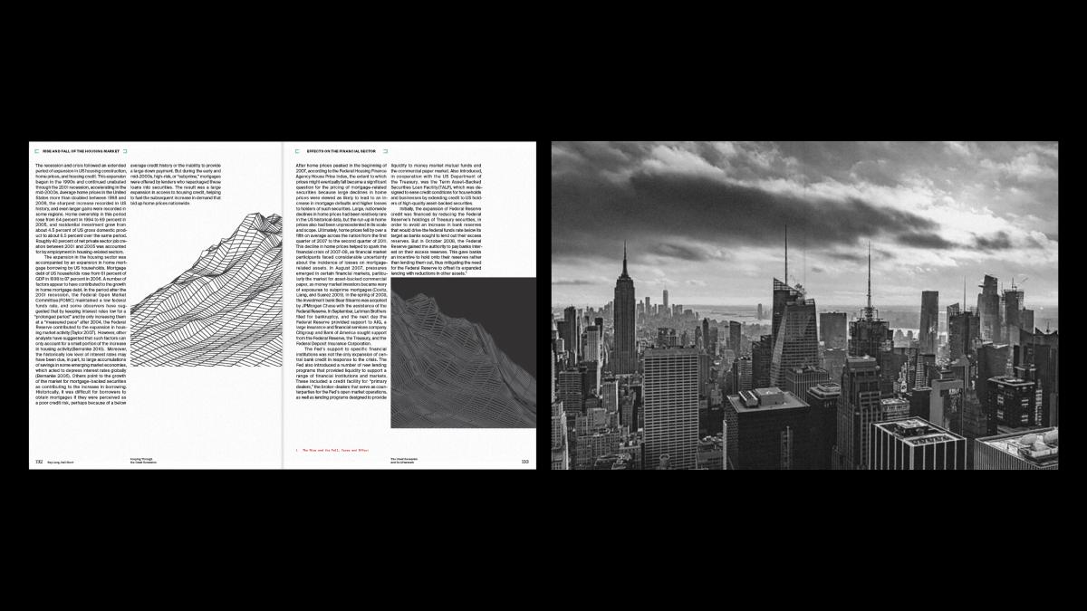 "Buy Long, Sell Short" is a publication narrating the Great Recession—its buildup, aftermath, and ongoing implications. I visualized the economy through a series of abstract diagrams that represent both market behavior and the psychological impacts on individuals. The work explores how the economy not only directly shapes human lifestyles but also subtly and seamlessly influences them in more abstract ways.