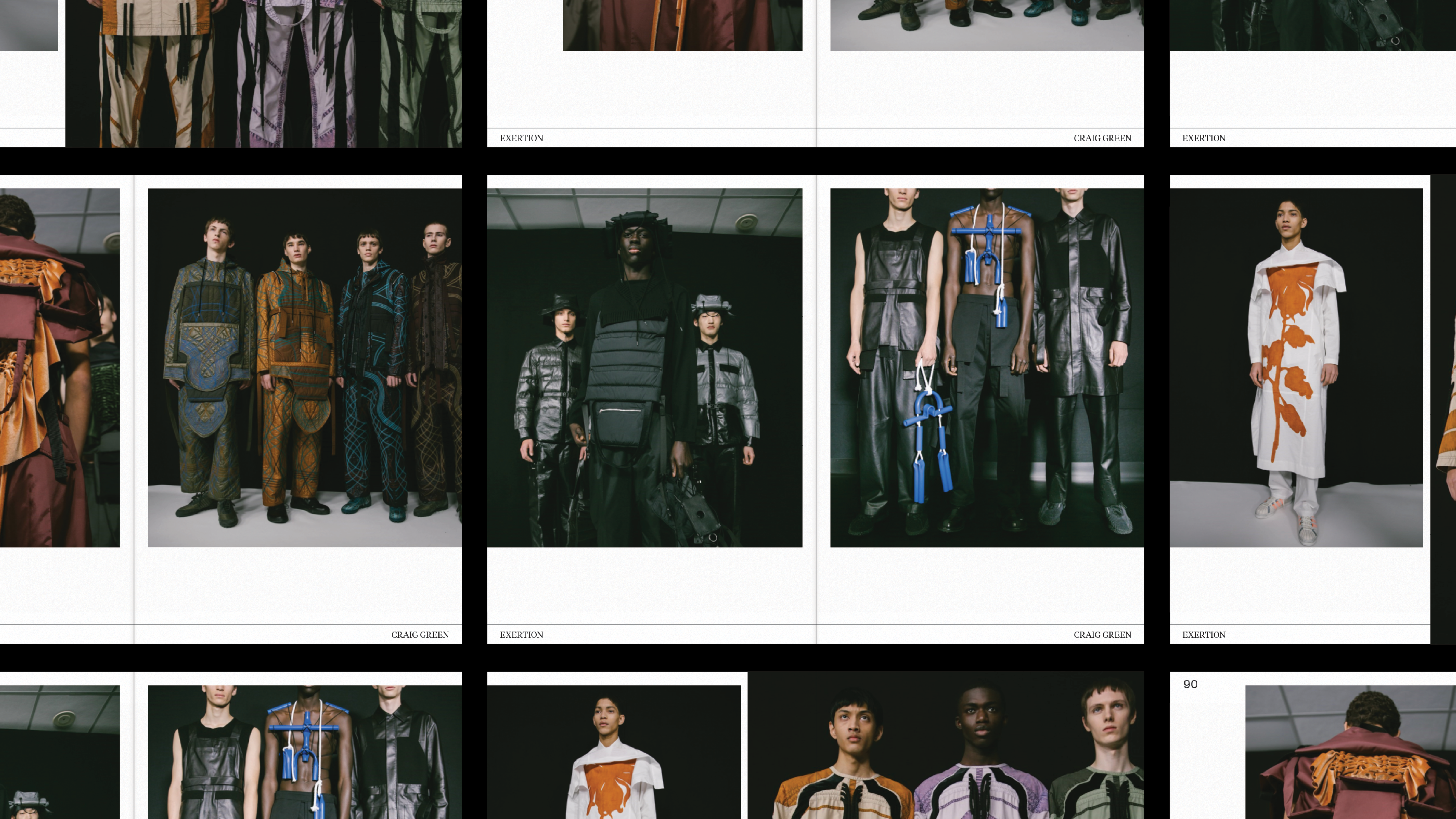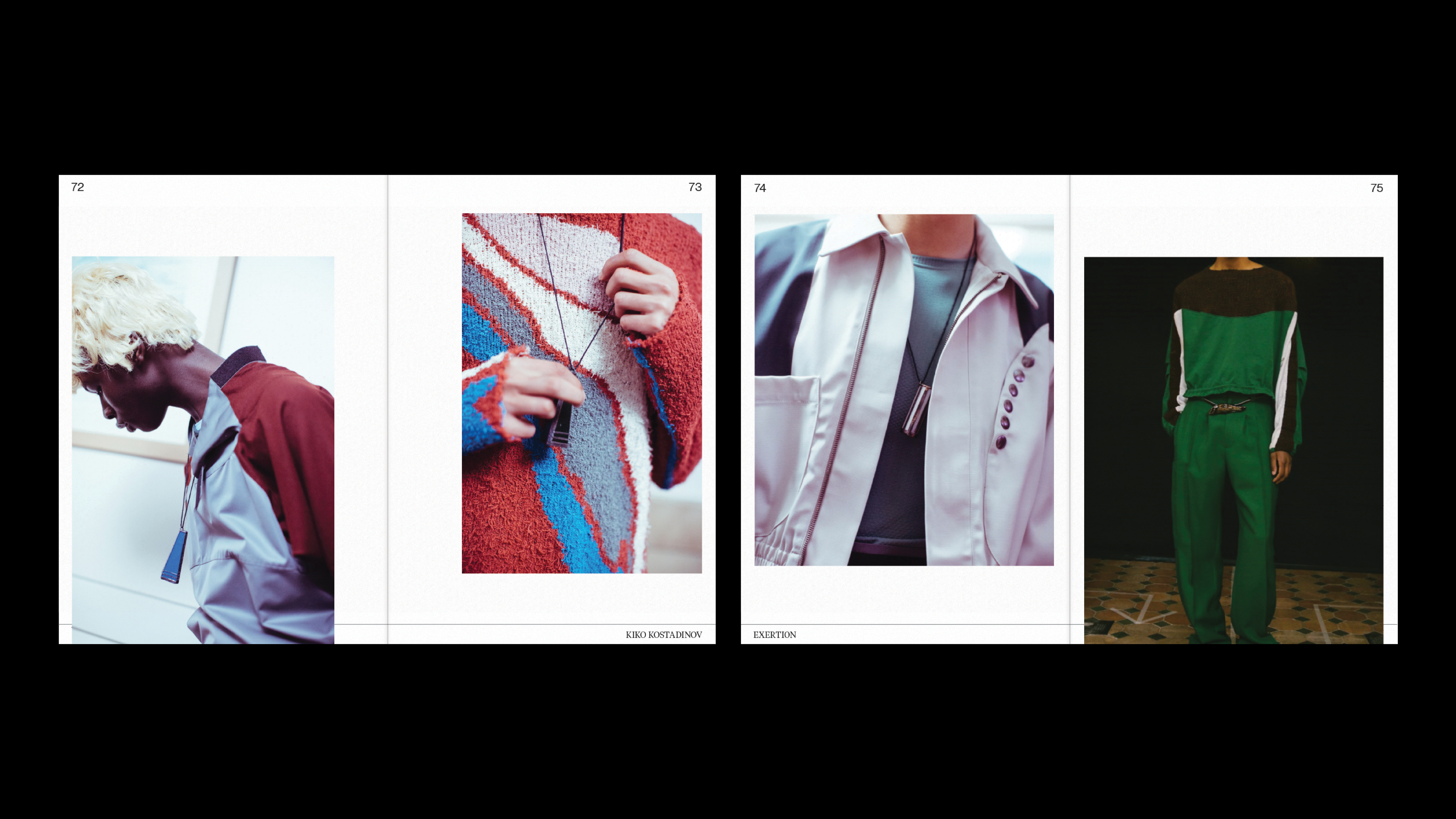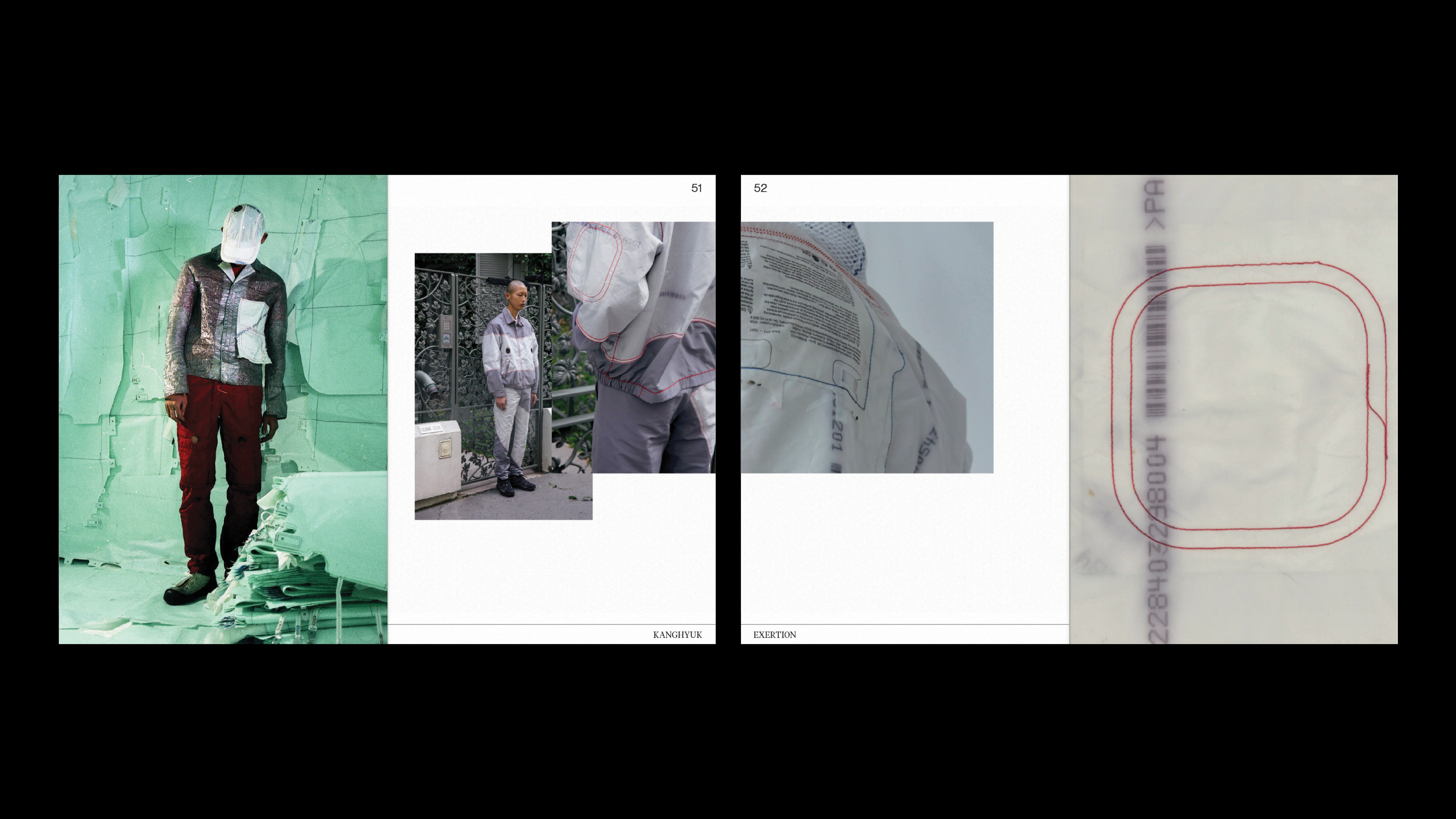 "EXERTION" is a publication presenting a hypothetical exhibition of experimental fashion collections. Featuring the work of KANGHYUK, Kiko Kostadinov, Craig Green, Yohji Yamamoto, Raf Simons, and Maison Margiela, the book brings together designers whose practices challenge conventional ideas of construction, material, and form. It captures the ambience, tension, and speculative energy within their collections—rendering fashion not as product, but as spatial and emotional experience.