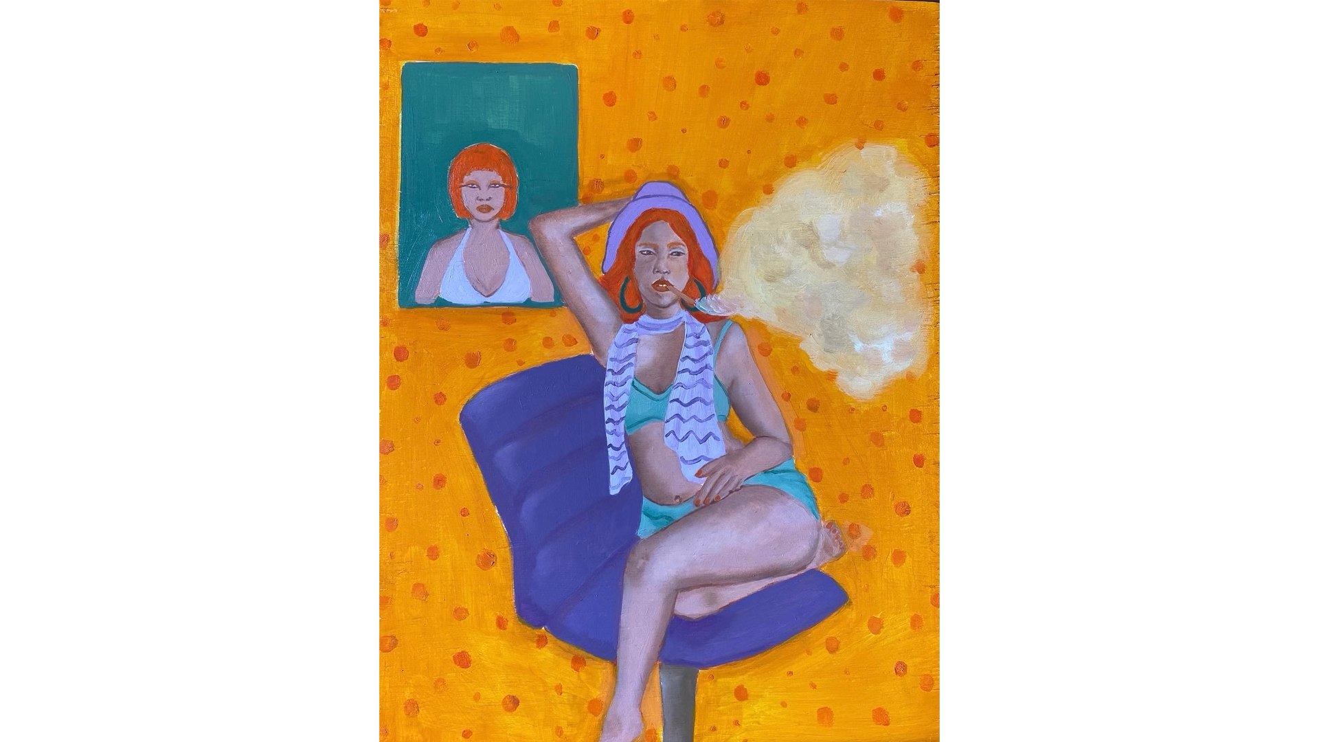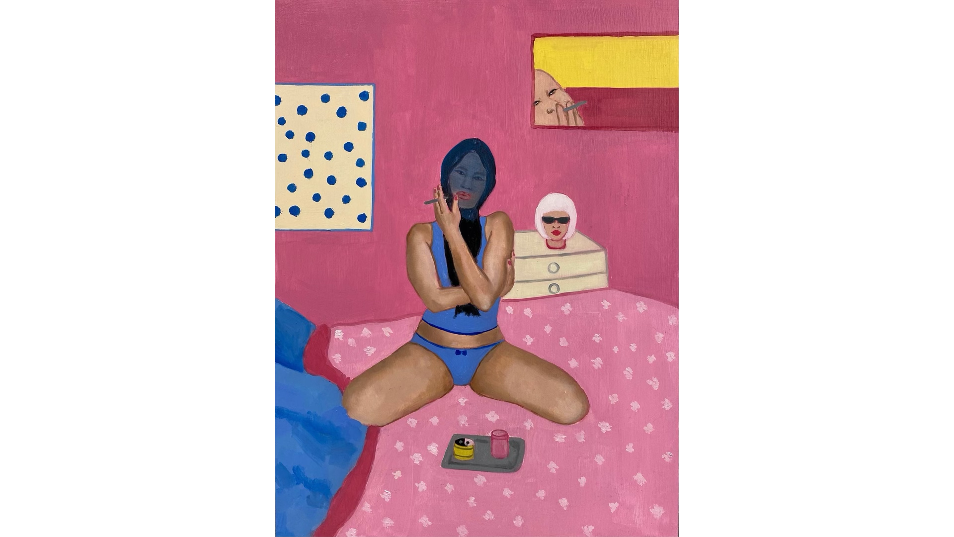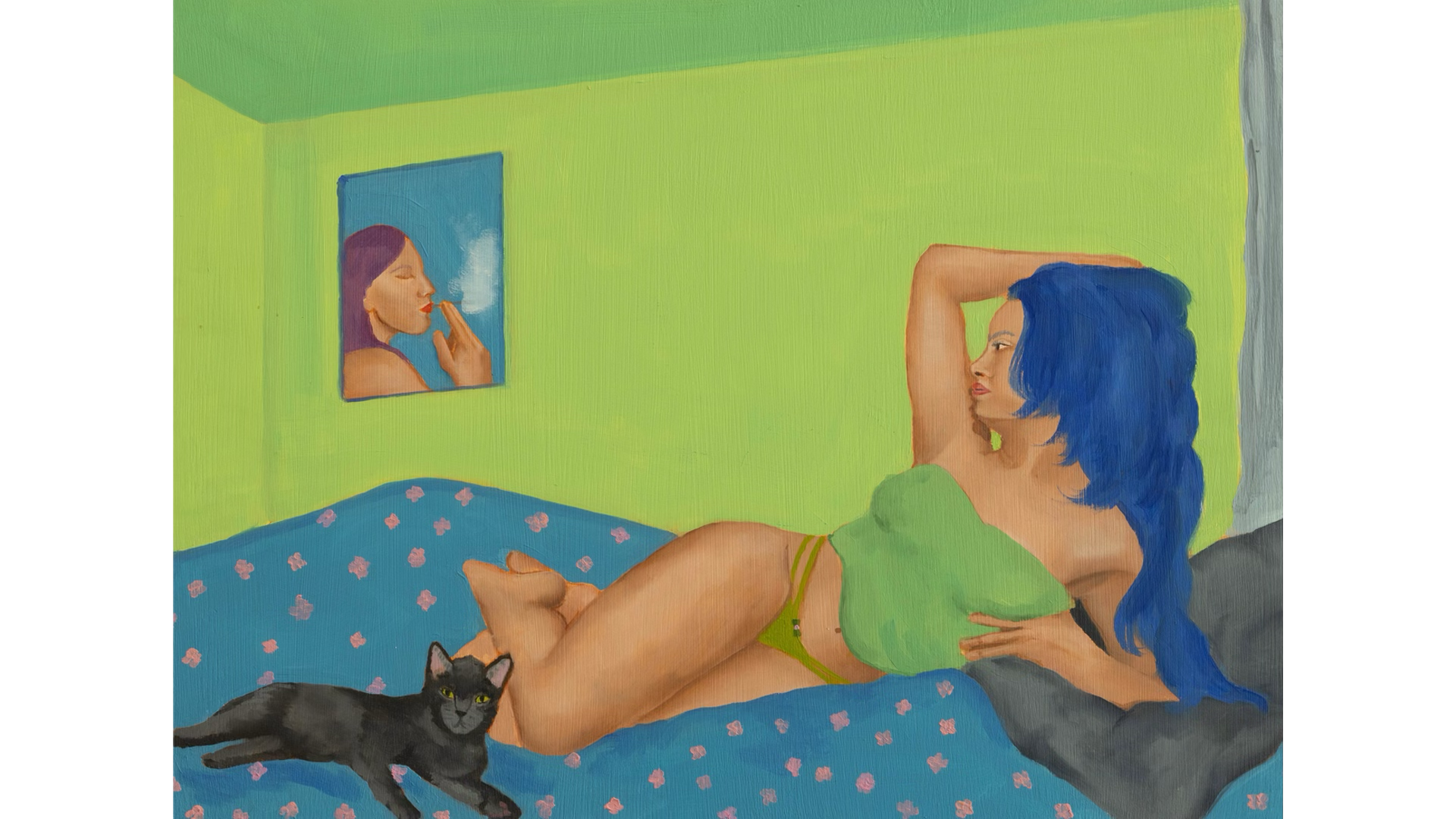 A series of intimate portraits, in the vein of self portraits, set in the personal space of the bedroom. Each figure interacts with another figure within the painting, often in the space of a poster or window, as a sort of manifestation of themself, another version offering guidance and space.