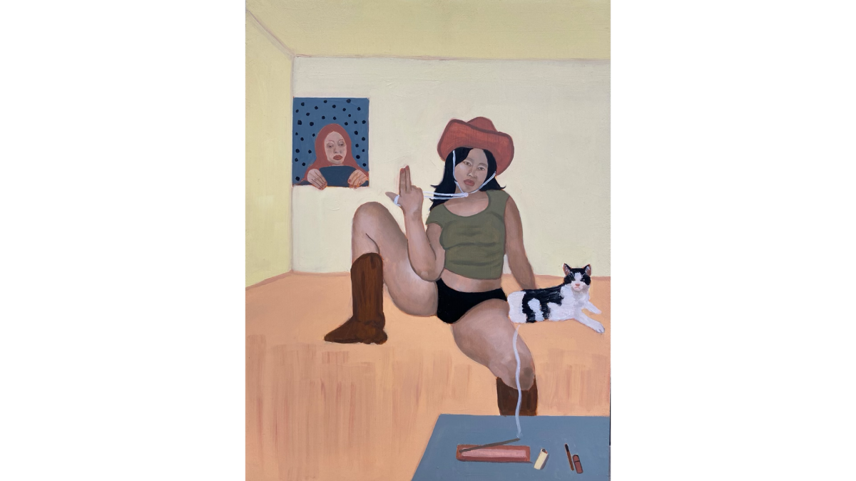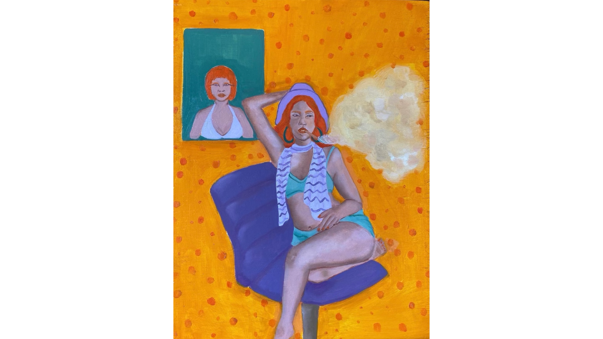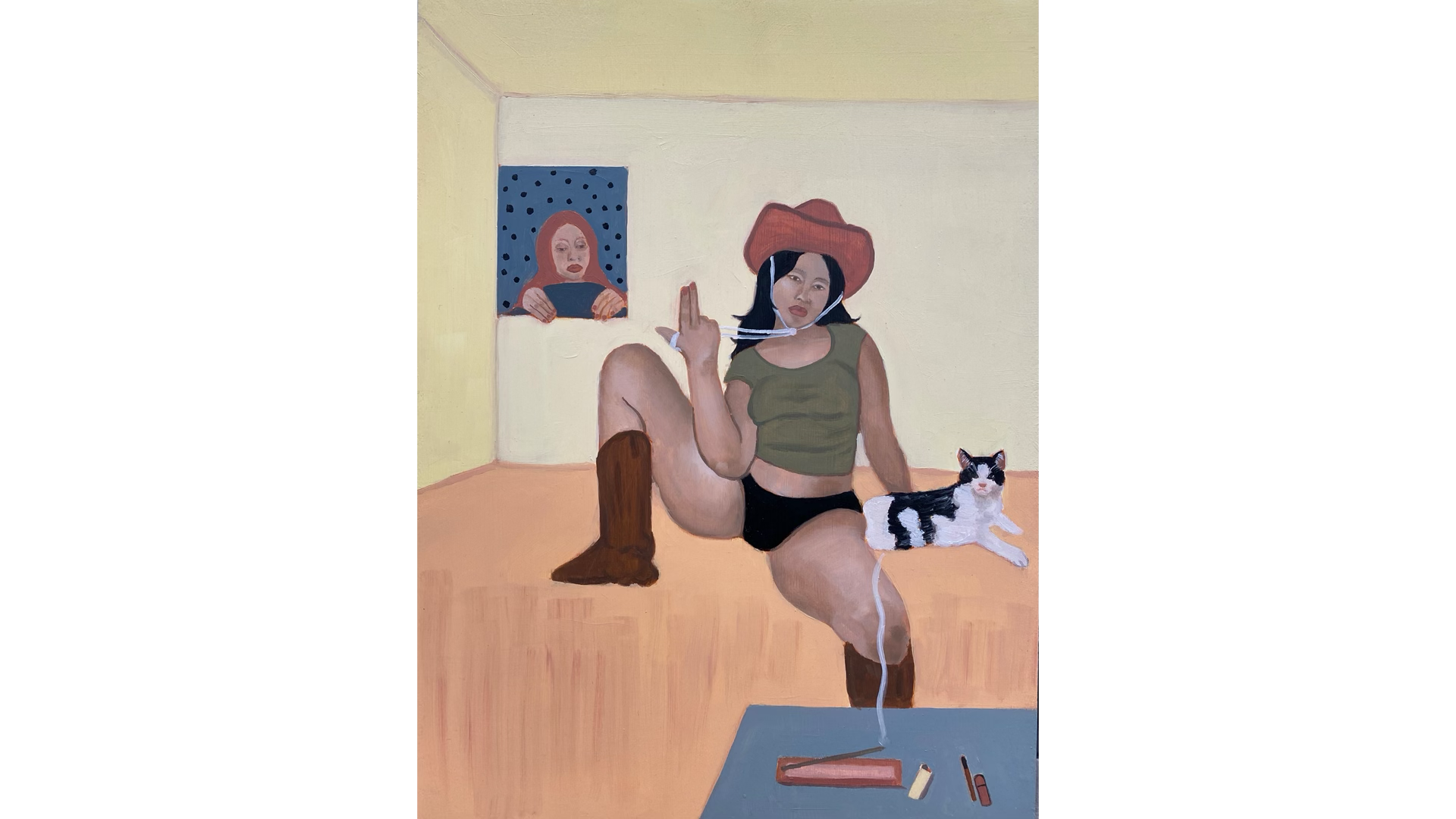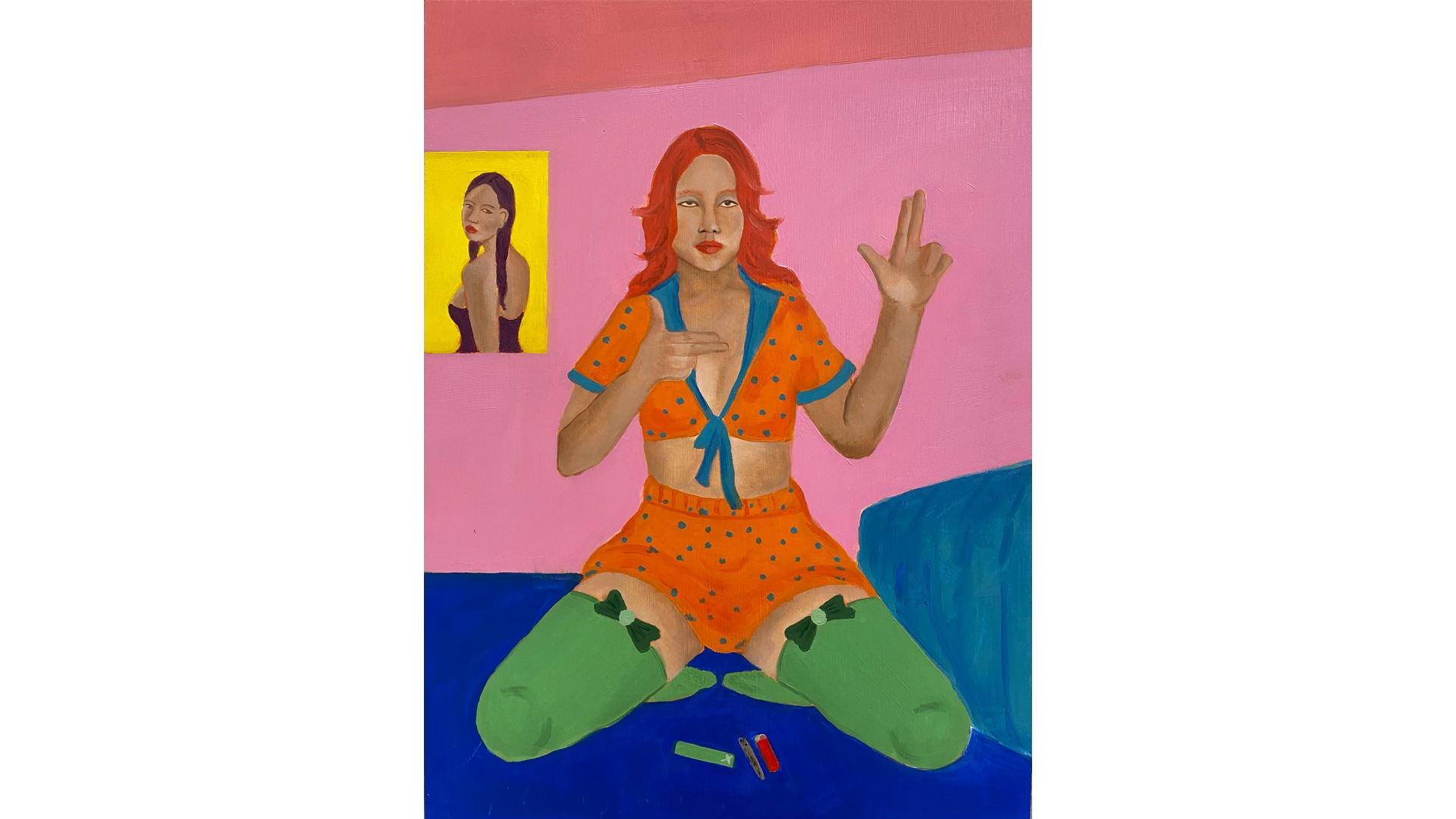 A series of intimate portraits, in the vein of self portraits, set in the personal space of the bedroom. Each figure interacts with another figure within the painting, often in the space of a poster or window, as a sort of manifestation of themself, another version offering guidance and space.