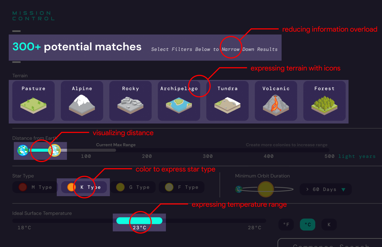 I was in charge of storyboarding, team project management, concept sketch development, icon illustration and UX/UI design. I created prototype mockups in Figma for the initiation stage of the game, where I designed the different metrics in exoplanet selection through data visualization. As a team we collaborated on the overall visual system.