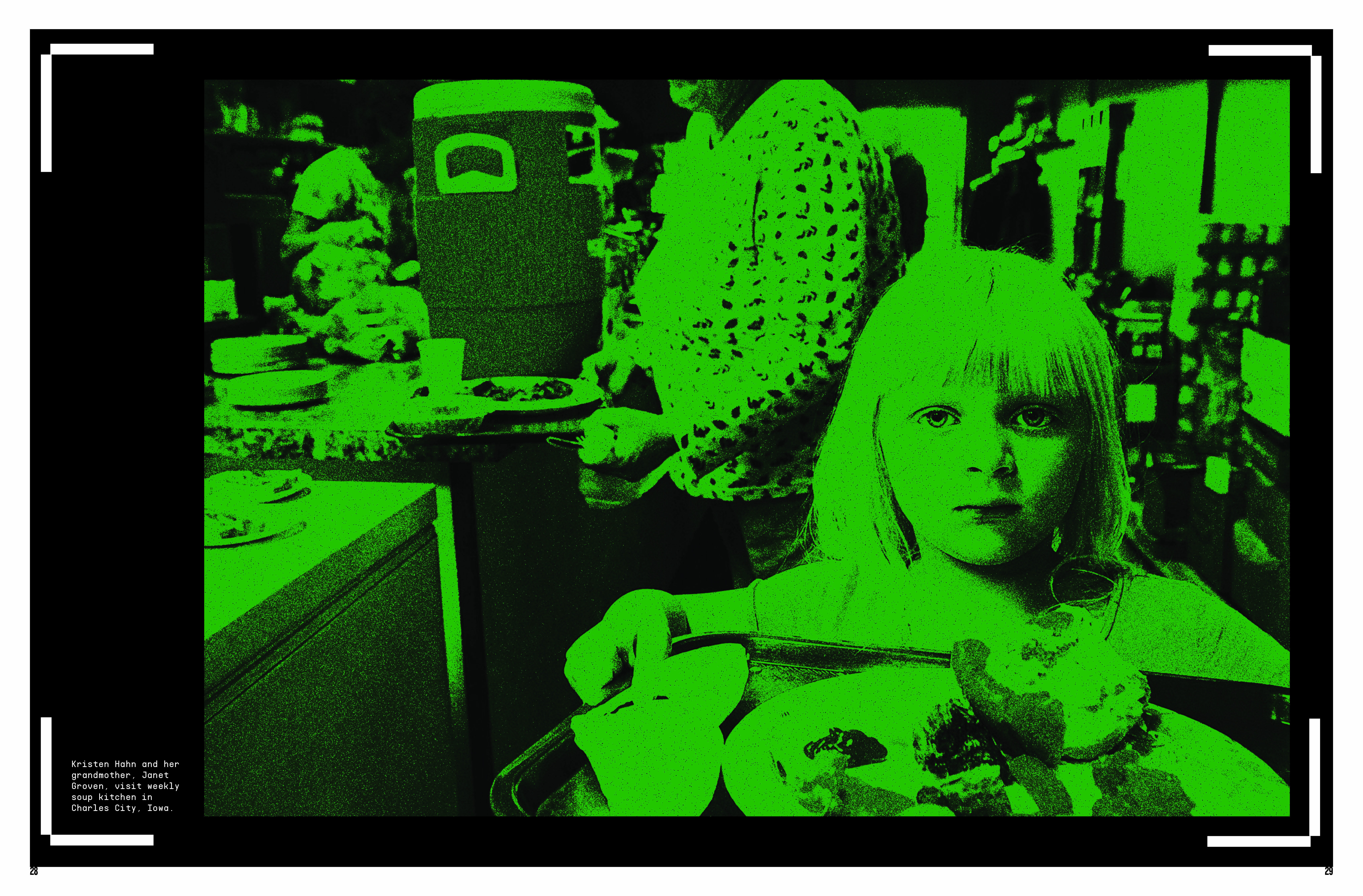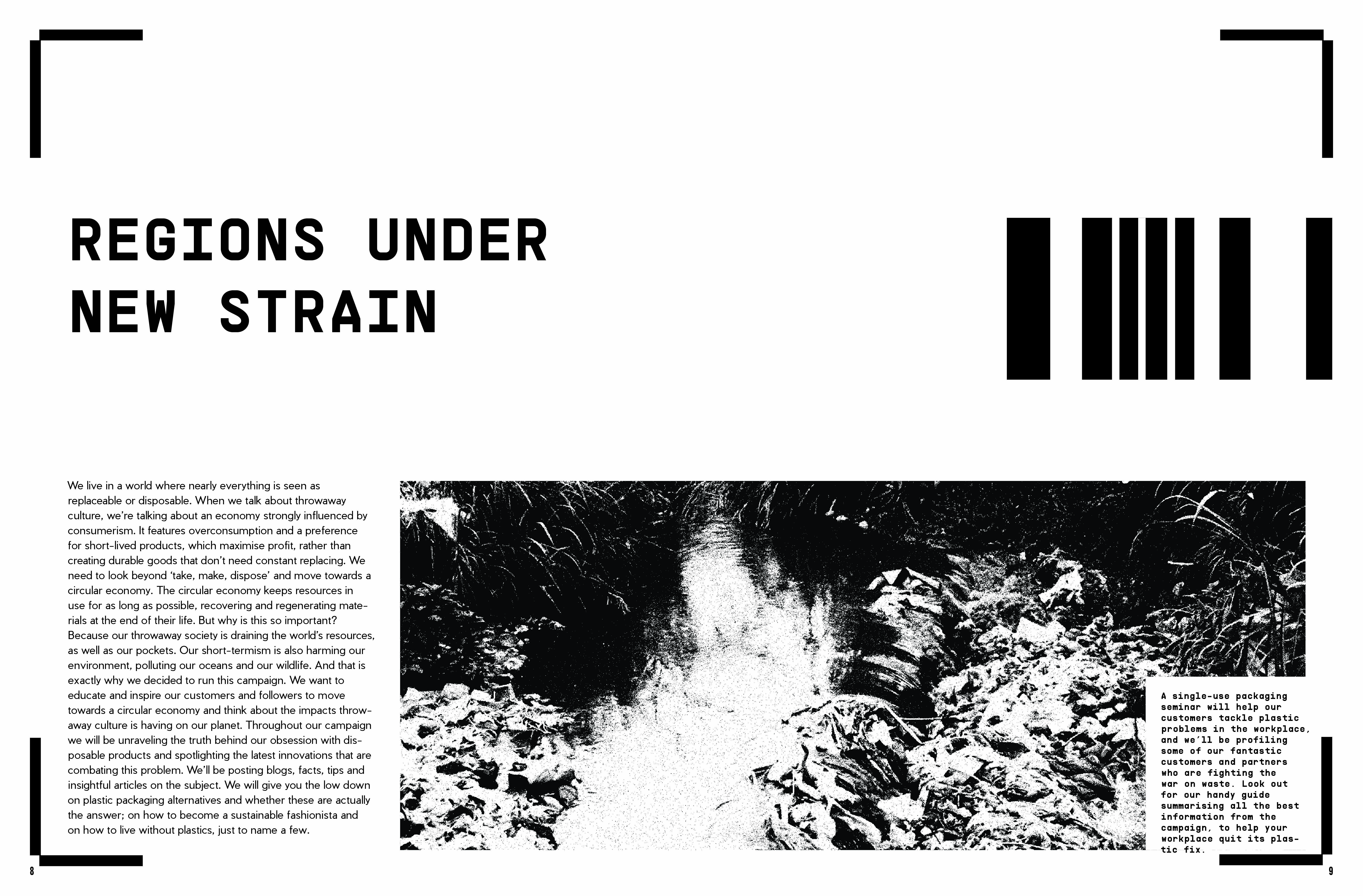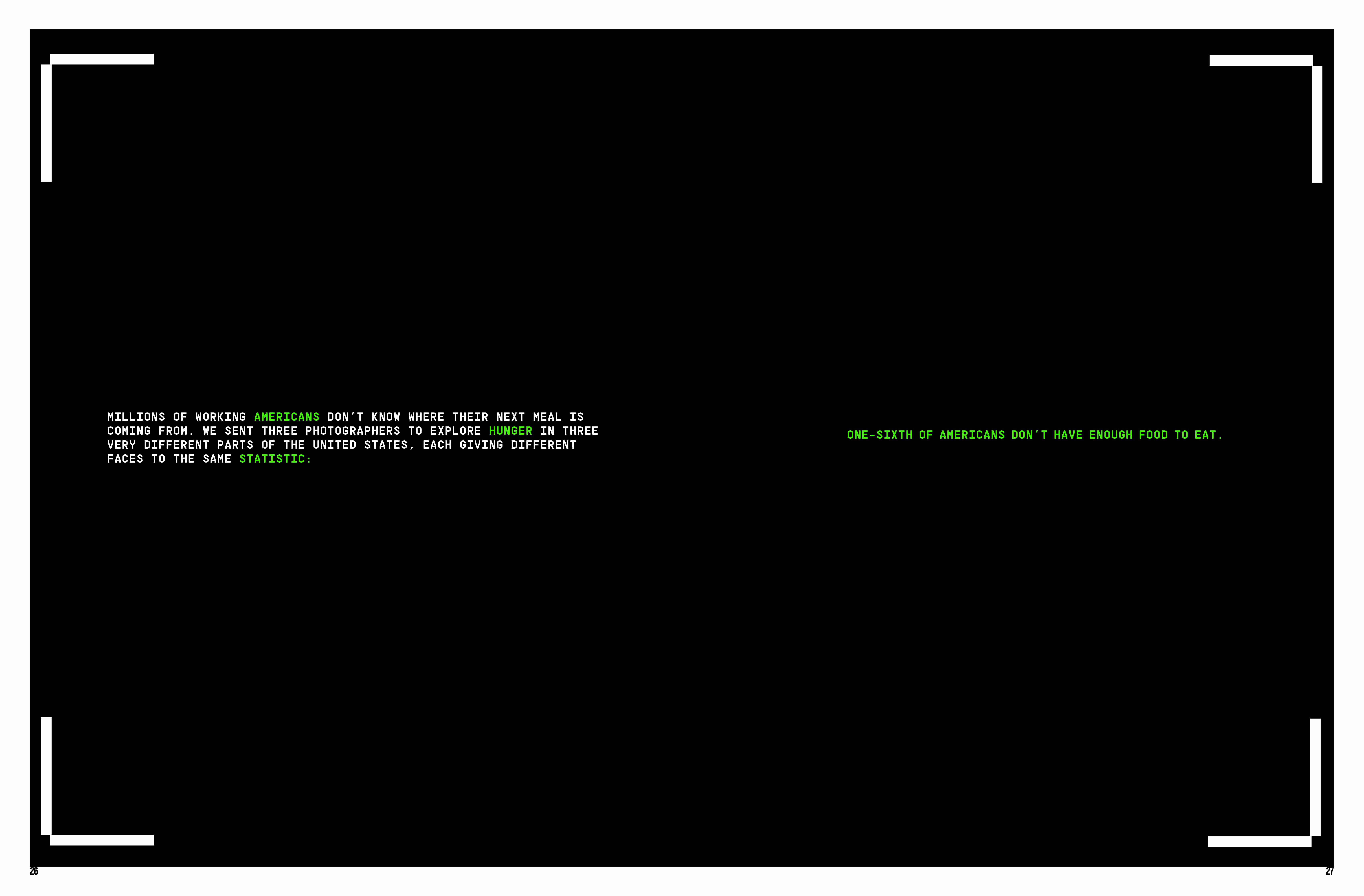 This Zine is curated toward a global non=profit organization named The Hunger Project. This zine is a work in-progress and has to be a minimum of 40 pages. This zine is based off the emphasis of over-consumerism and throw-away culture. With image treatment that represents the raw, organic, textured layering of food/food waste. An RGB approach was taken for color palette and a system with the HUD of a barcode scanner is repeated on each page to employ the page is currently being scanned by viewer