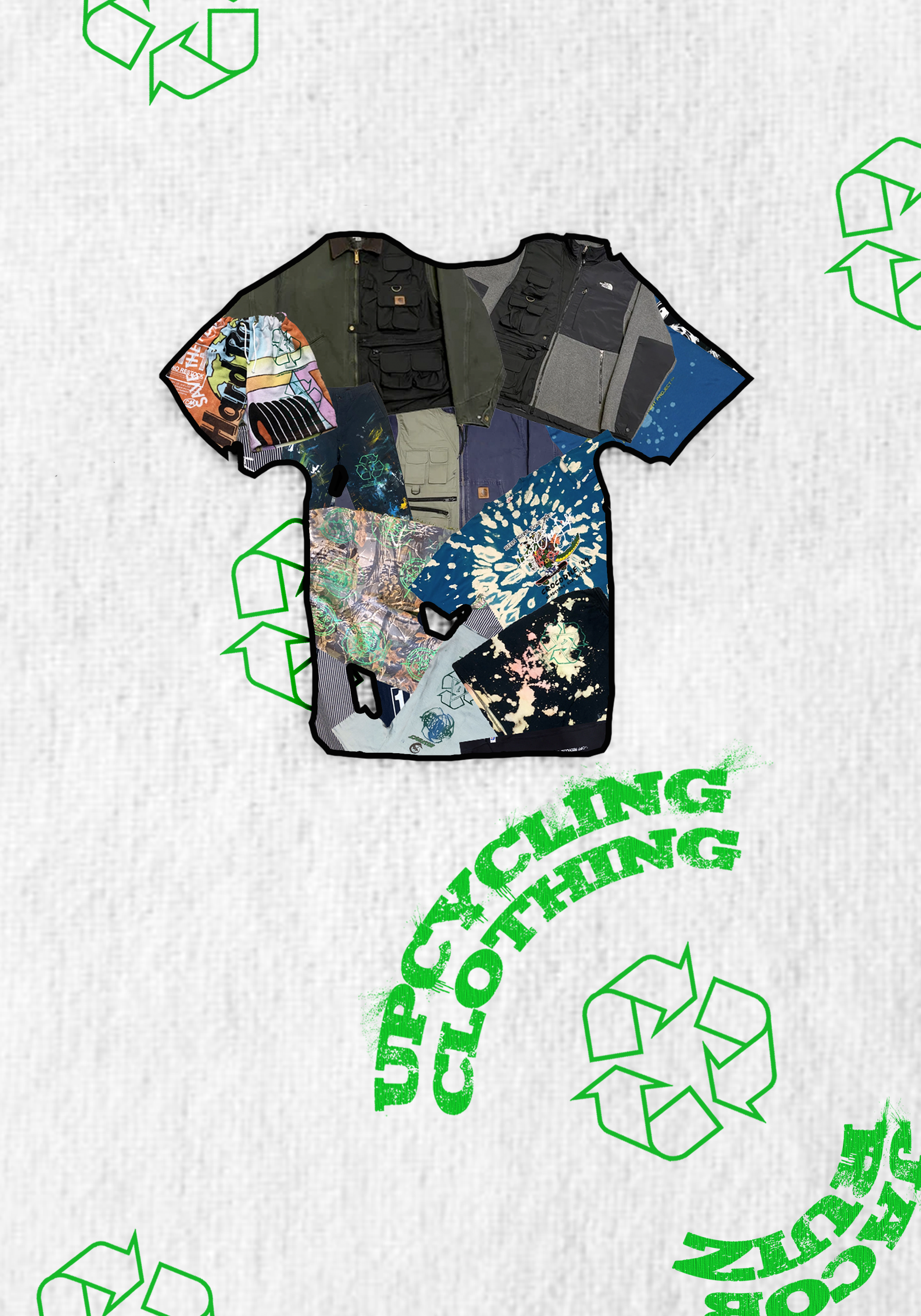 Jen wanted the class to create a book cover for either a passion or hobby of ours. She suggested to utilize real-world imaging with our cameras and materials we use within our hobby. She also assigned to implement a symbol that represents the hobby. The hobby I chose was upcycling clothing. To depict that, I wanted to have either a collage or bold symbol of clothing. I decided to combine them and have the staple symbol of clothing be the focal point with my own upcycled clothing within it.