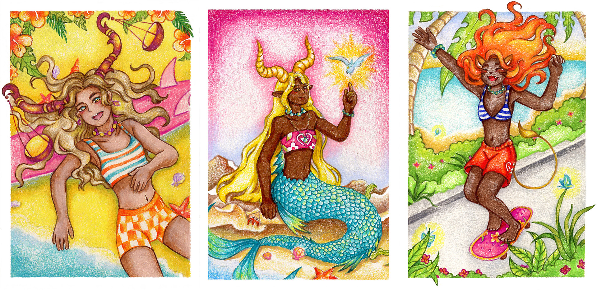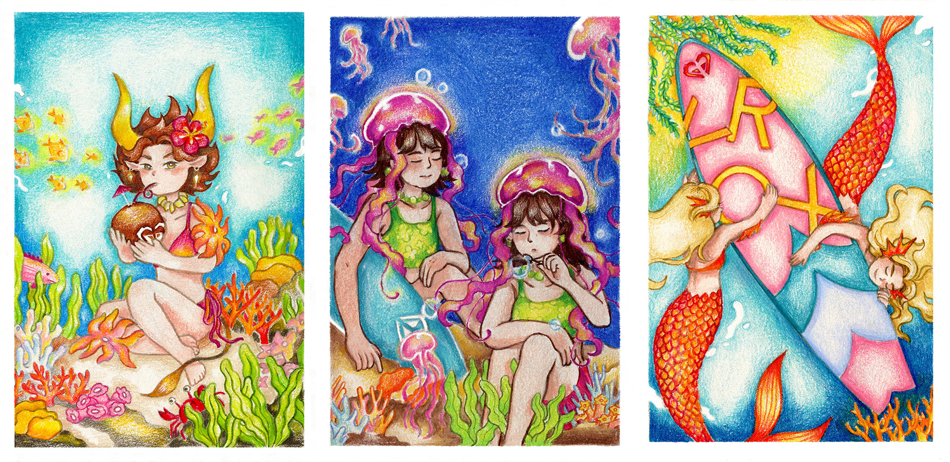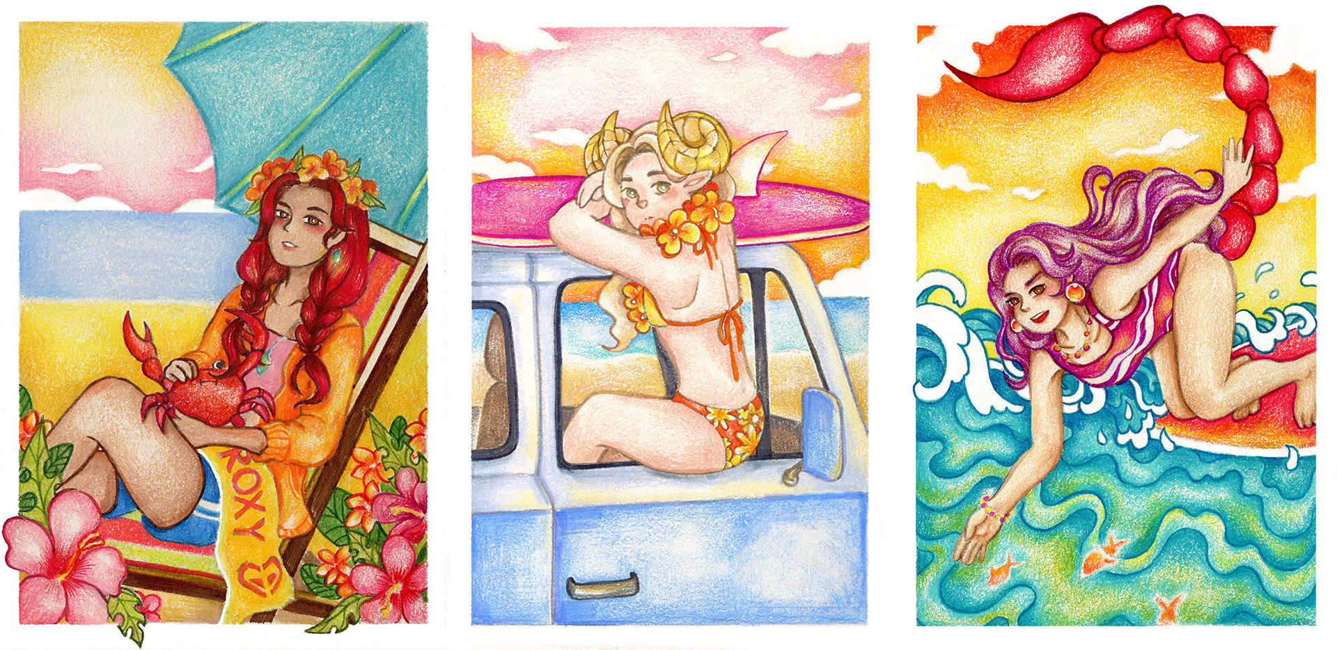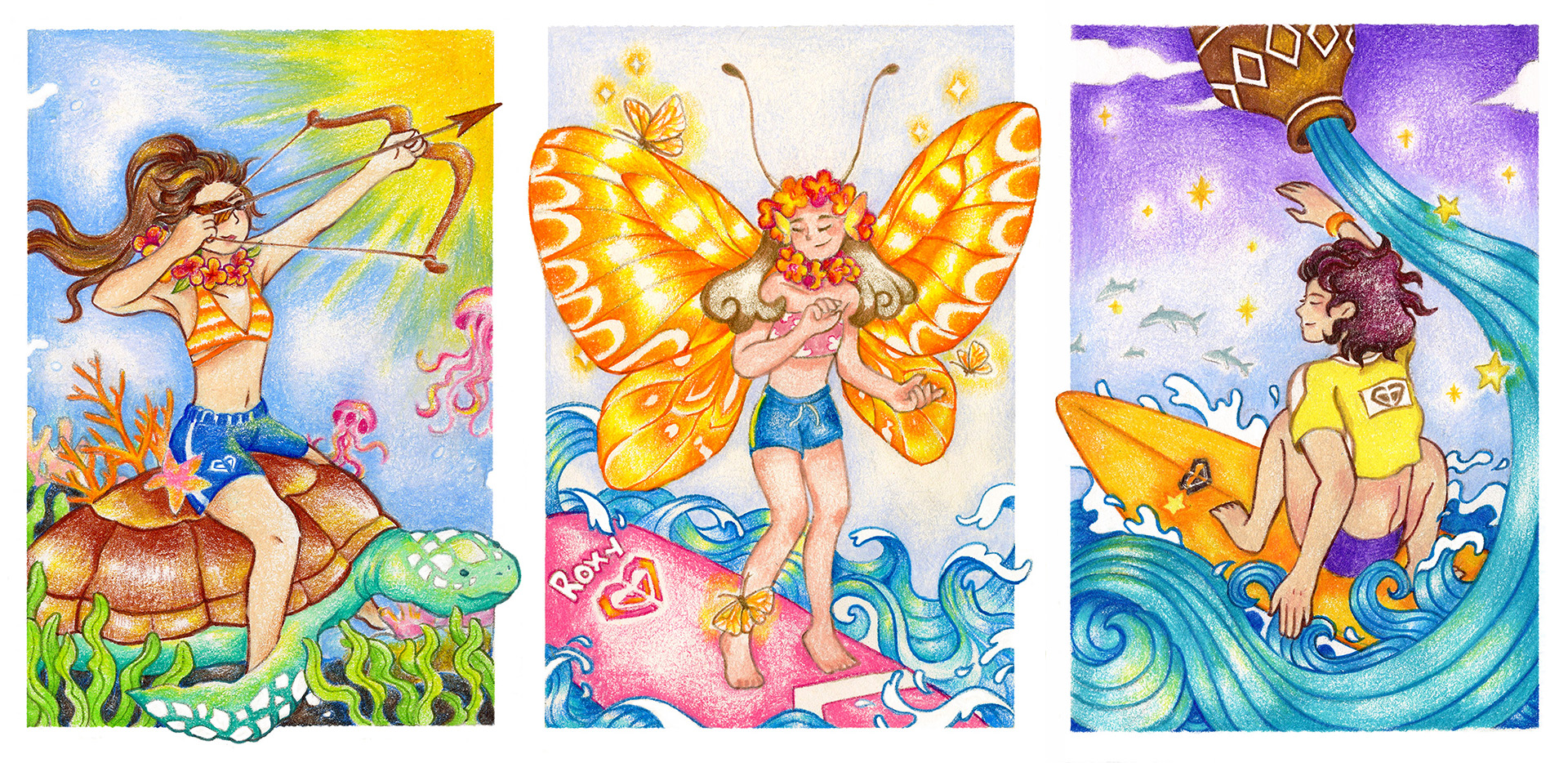 Growing up in a conservative Asian culture, I experienced societal expectations that limited women's freedom, including restrictions on beach activities and standards of beauty. After moving to Southern California, I was inspired by the freedom of self-expression. This led me to create a series of fantasy illustrative cards for Roxy, the first swimwear brand for women, where I explore freedom through zodiac characters on imaginative beach adventures.