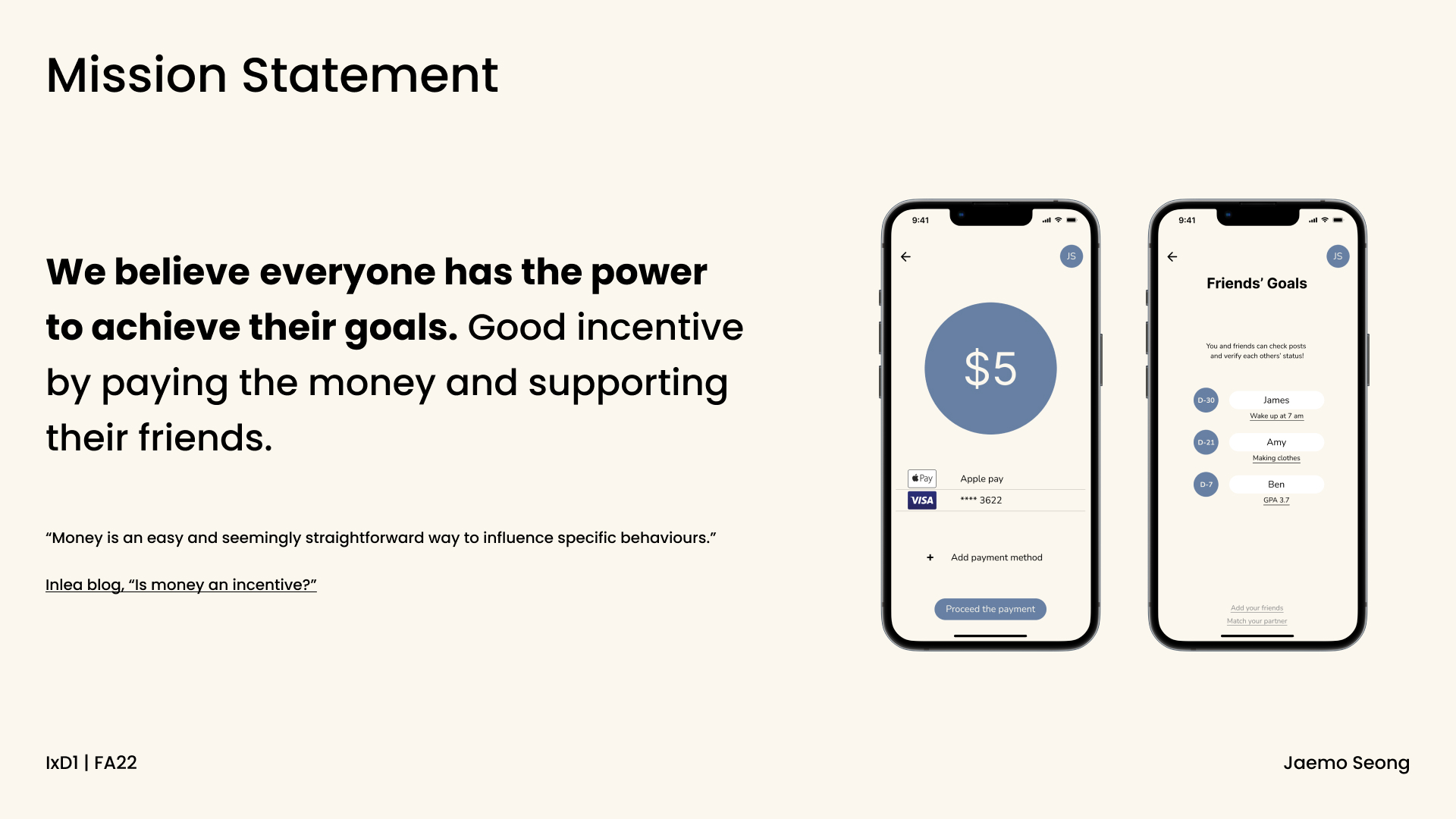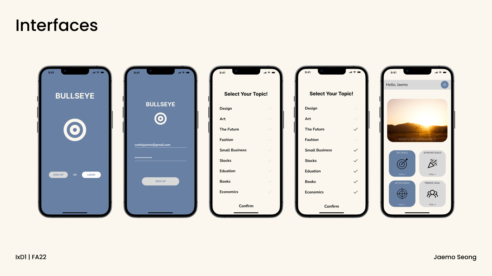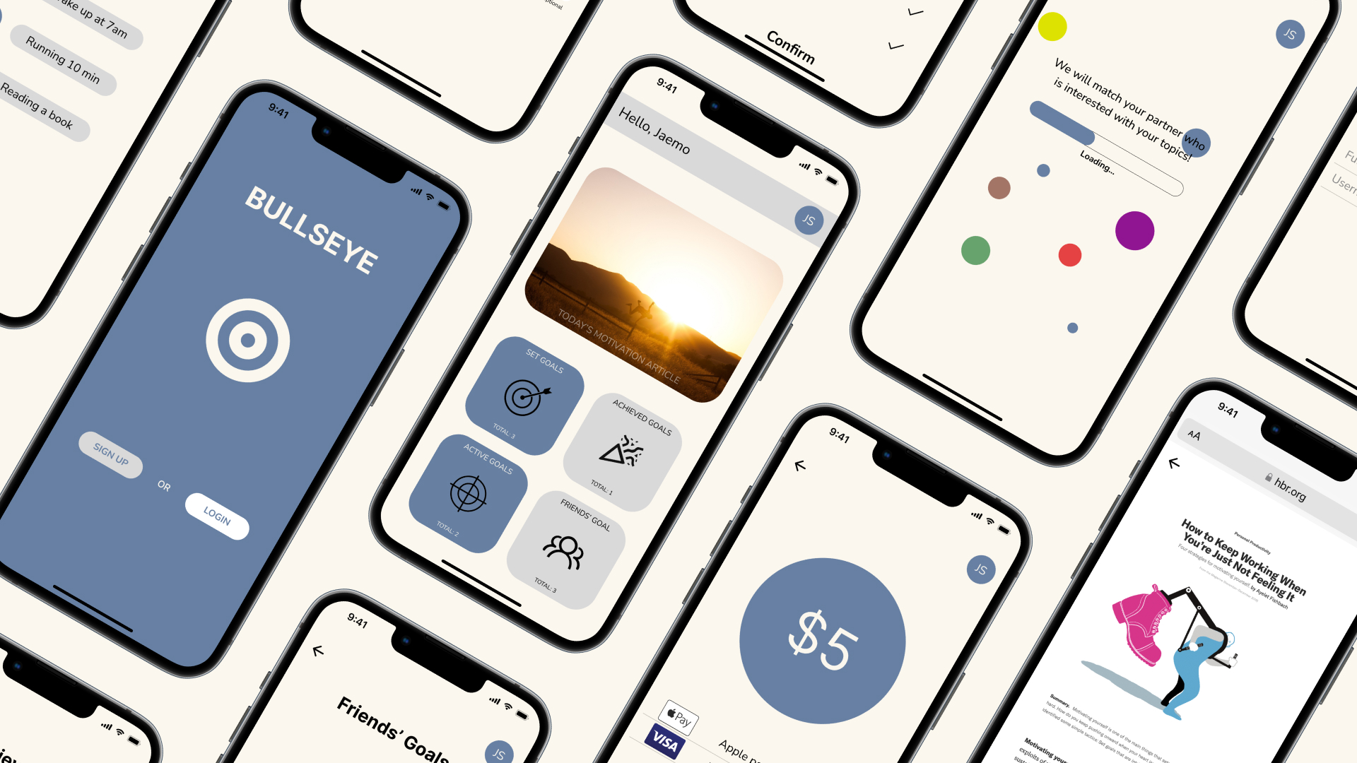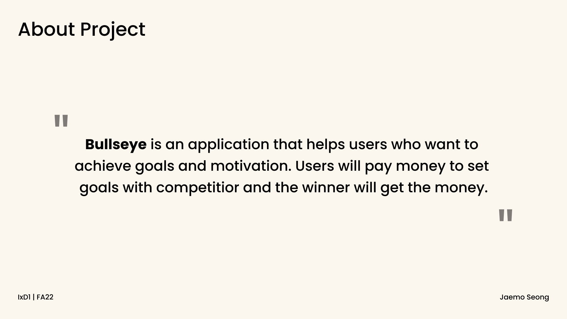 Bullseye is an application that helps users who want to achieve goals and motivation. Users will pay money to set goals with competitior and the winner will get the money.