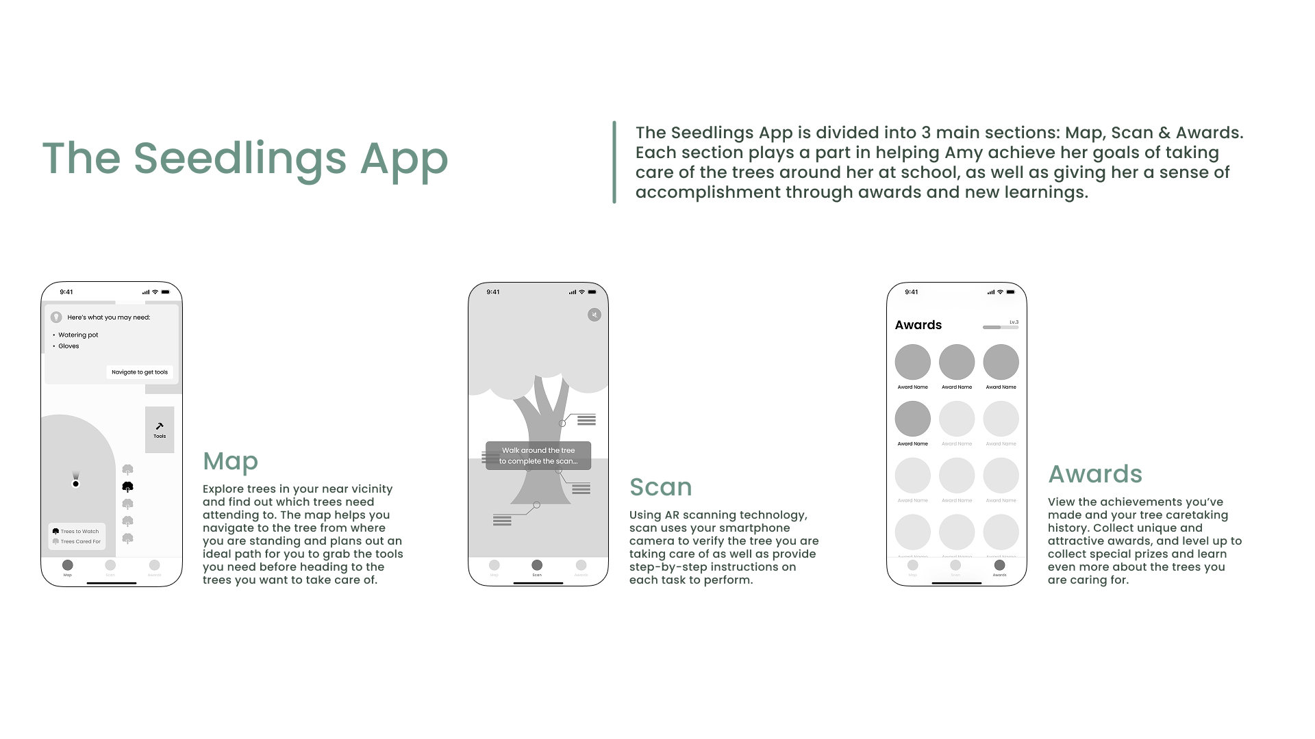 Seedlings is an AR-powered mobile application designed for kids and parents to actively care for trees in their surroundings while gaining environmental knowledge and a sense of accomplishment.