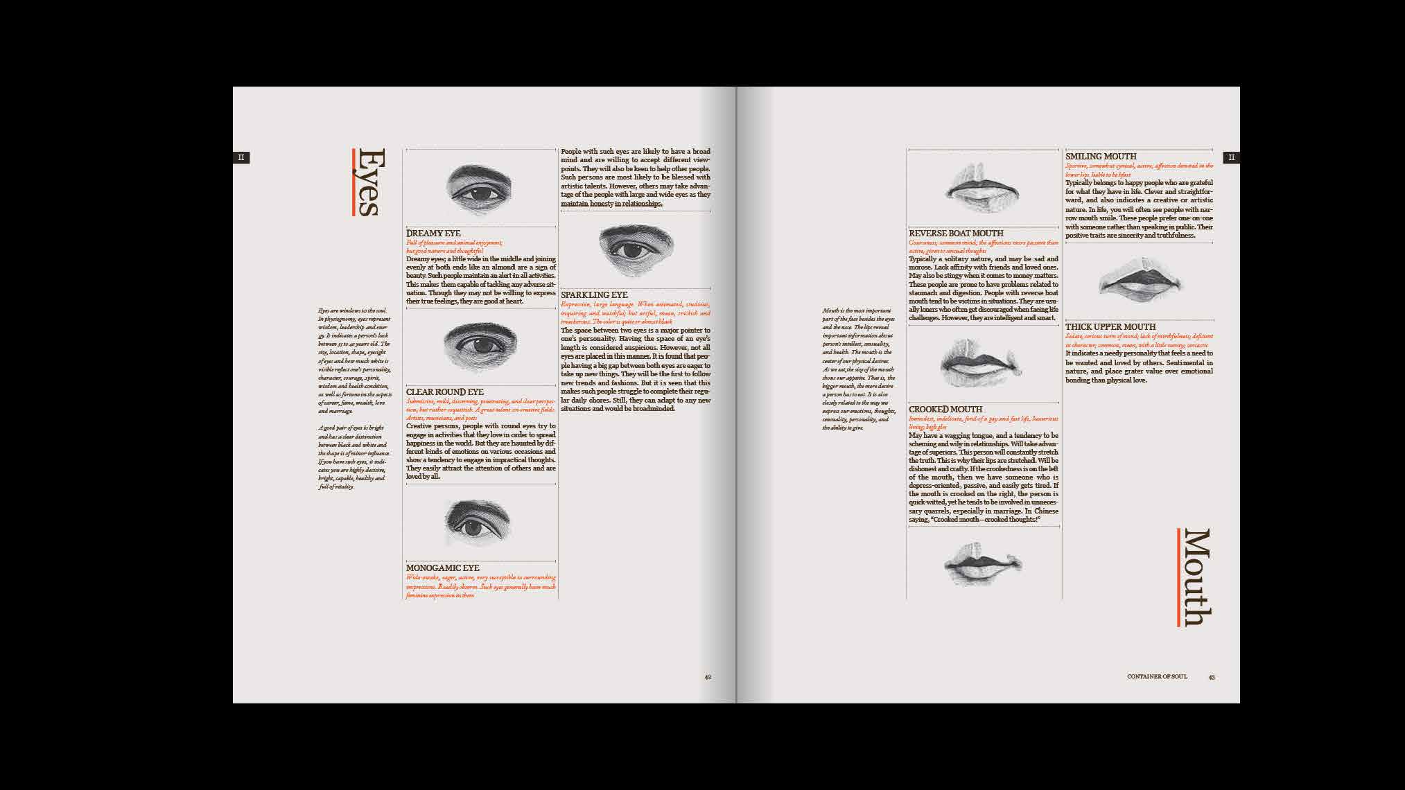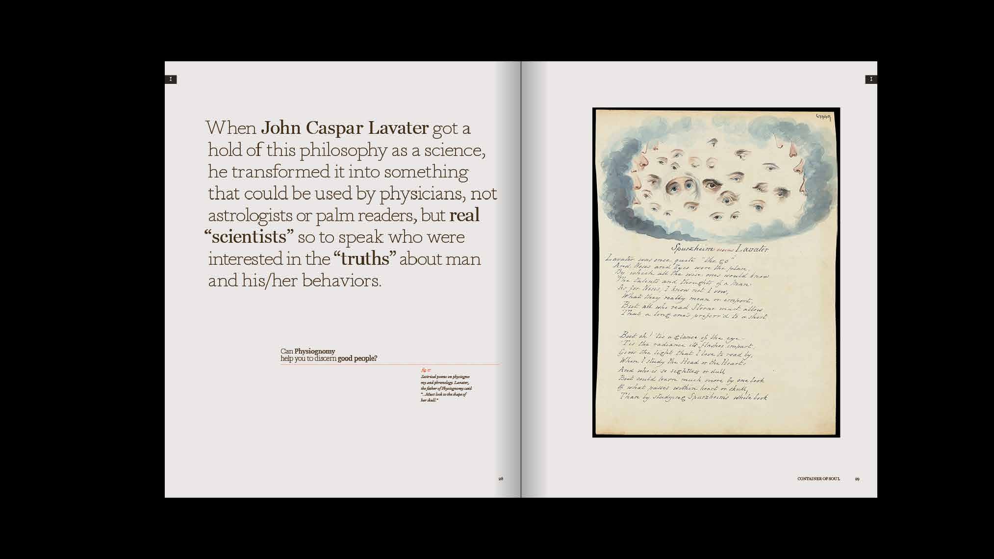 Container of Soul is a book about Physiognomy—a person's facial features or expression, especially when regarded as indicative of character or ethnic origin.