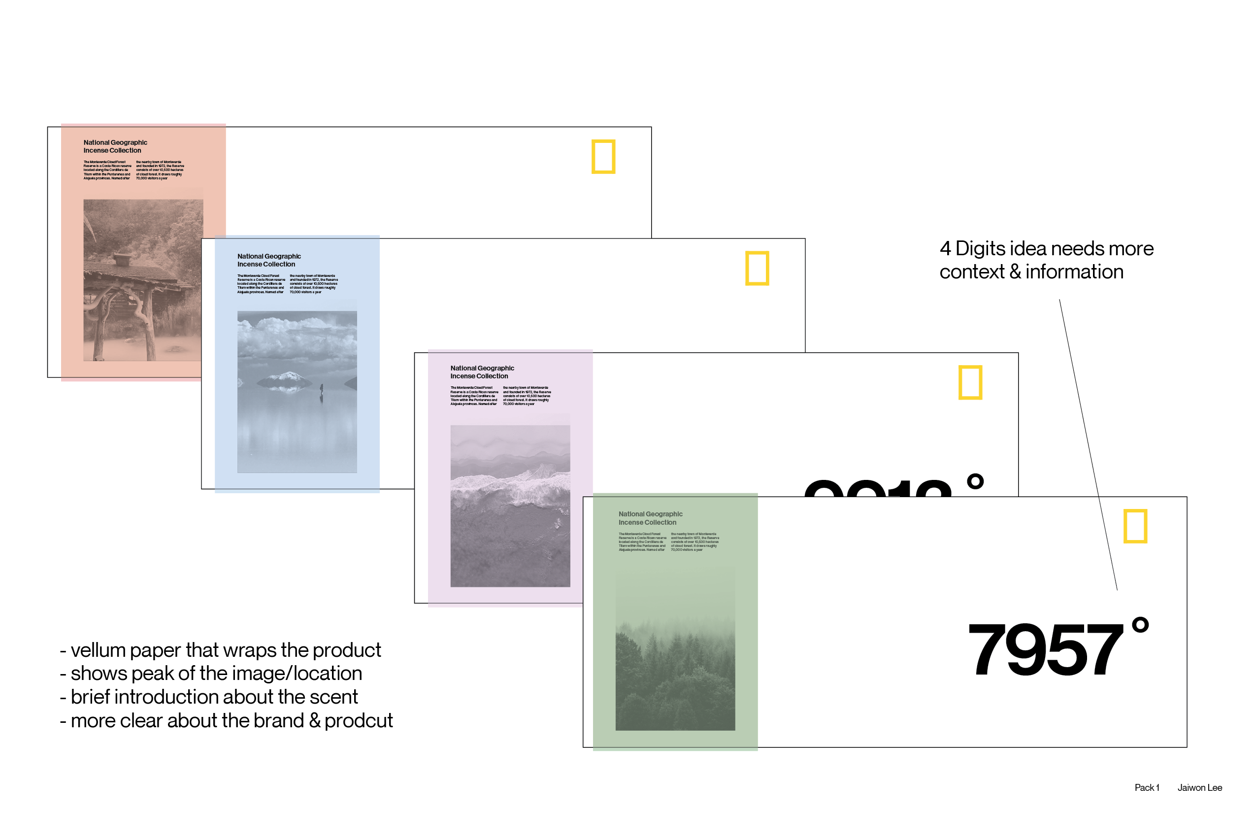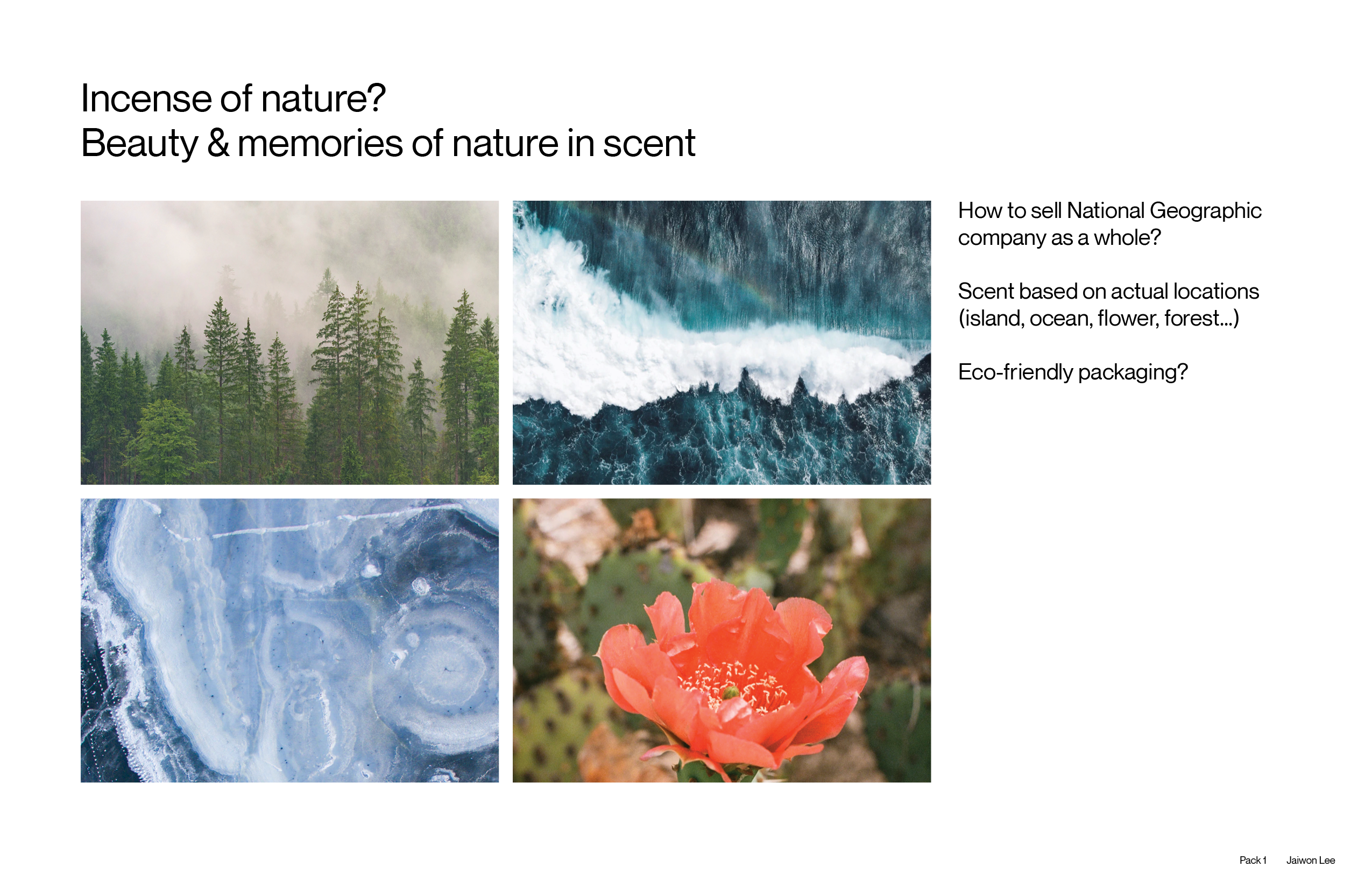 National Geographic is known as a nonprofit organization that deals with nature in media, but they are known as a brand in Asian countries for fashion, etc. I made a hypothetical incense line inspired by places in the world. The idea started because people are trapped indoors due to Covid19. The incenses are designed with the shape of the logo of National Geographic and designed in different colors based on the locations I chose.