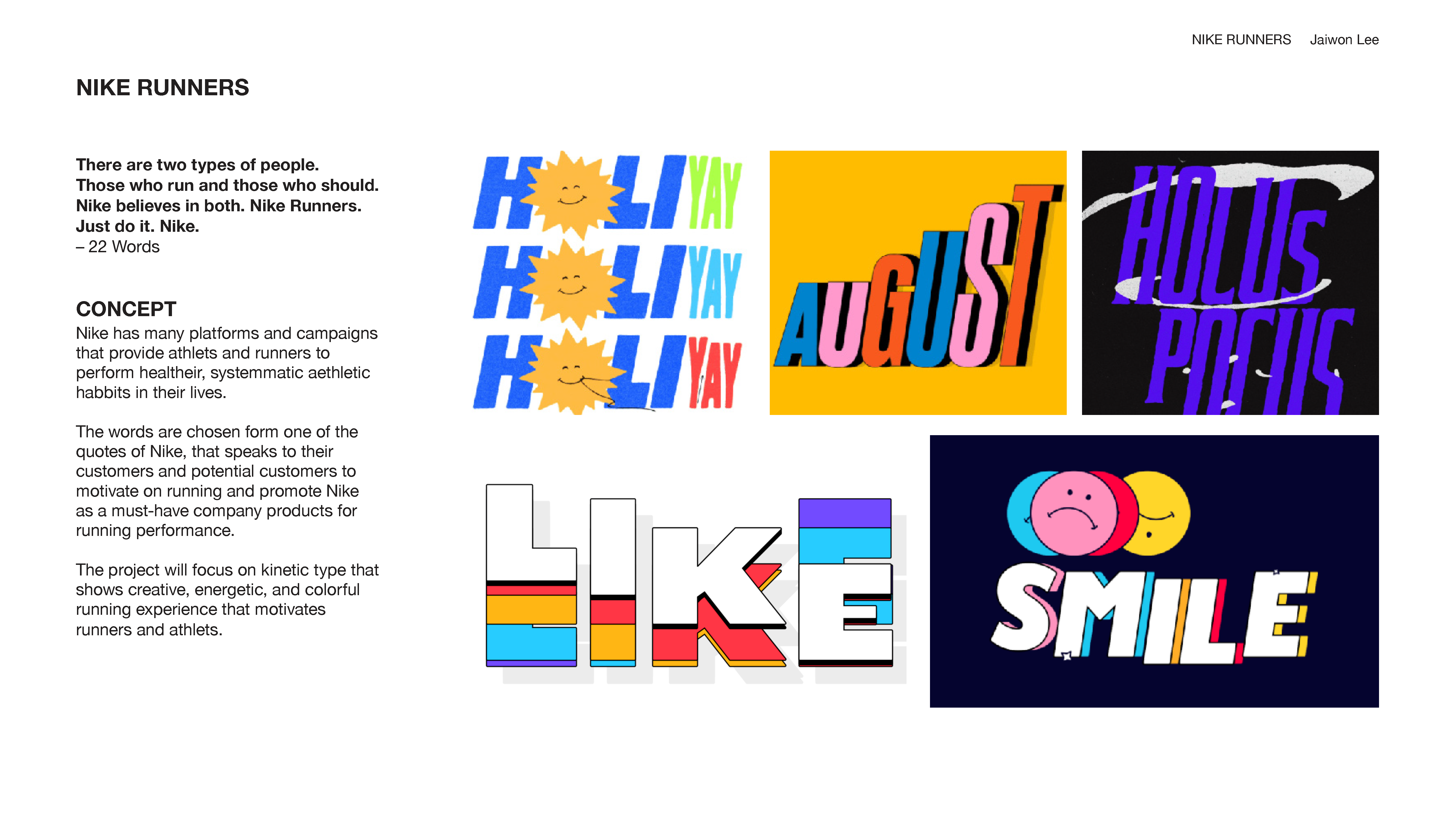 Nike Runners is a motion project that promotes the Nike Runners campaign. I used blocks to indicate speed and run with gradient colors to add depth and motion to the project.